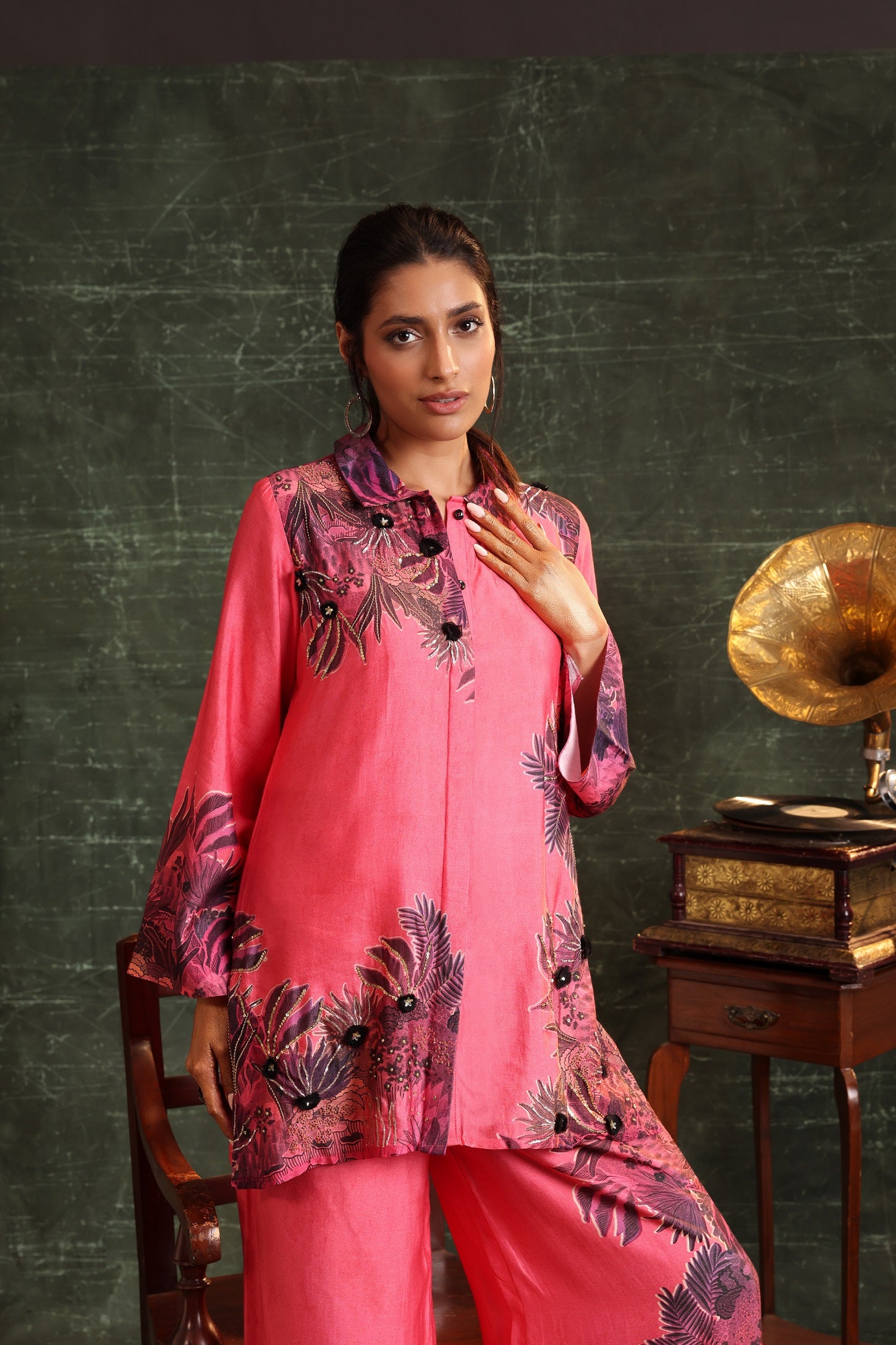 "Pink Kaira Printed Shirt with Flared Sleeves paired with Chanderi Pants.