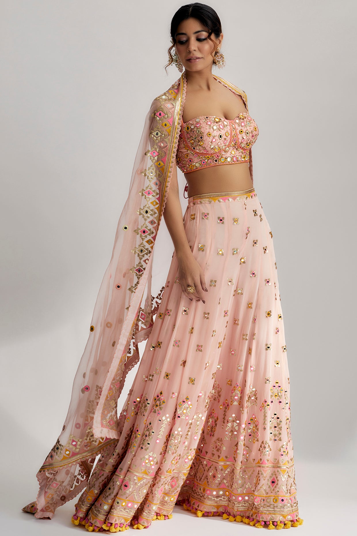 The Ira Bustier with Flared Pants is a stunning ensemble that exudes elegance and charm. Crafted with exquisite attention to detail, this set is adorned with intricate hand and machine embroidery, sequins, and colorful accents that create a beautiful and glamorous look.