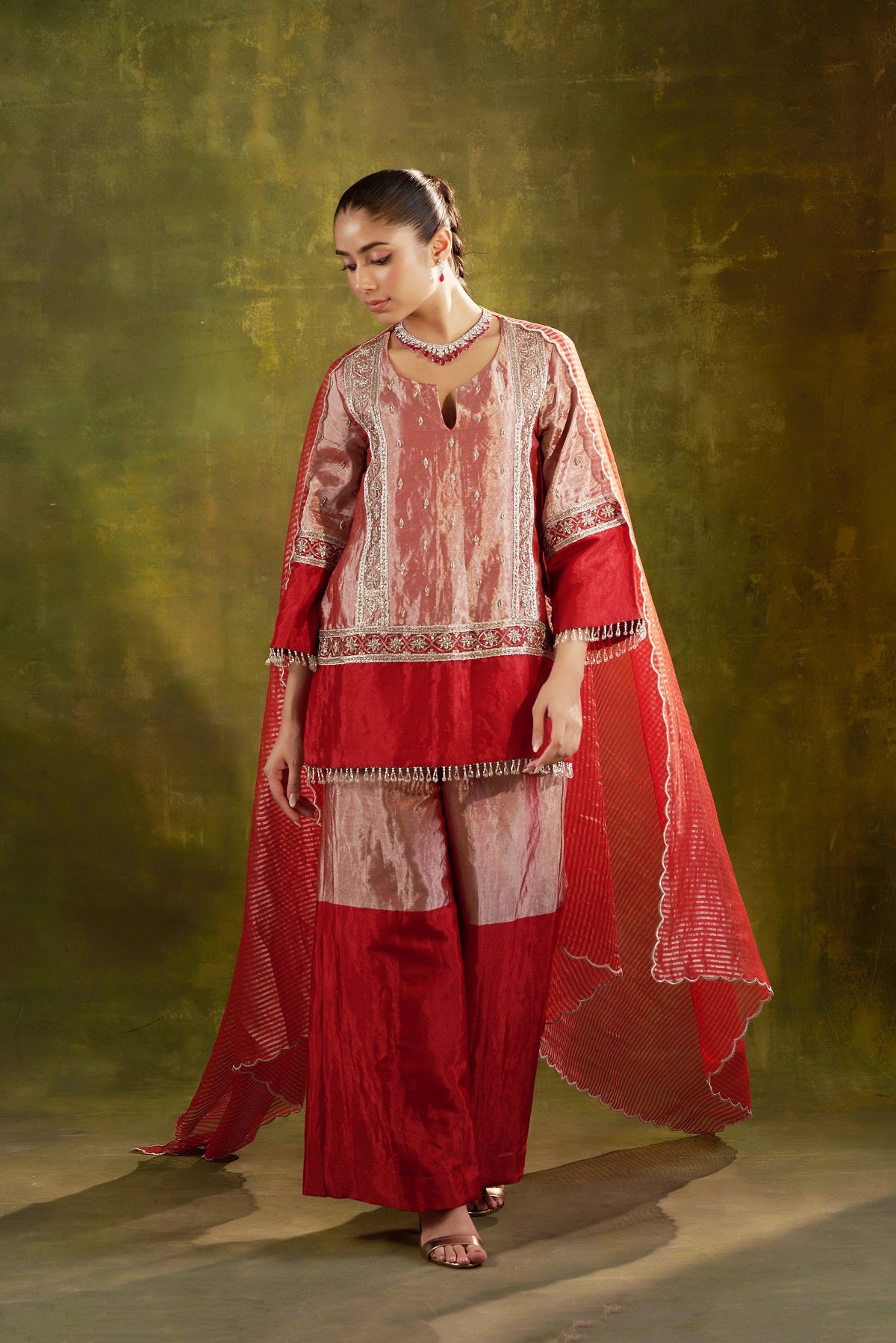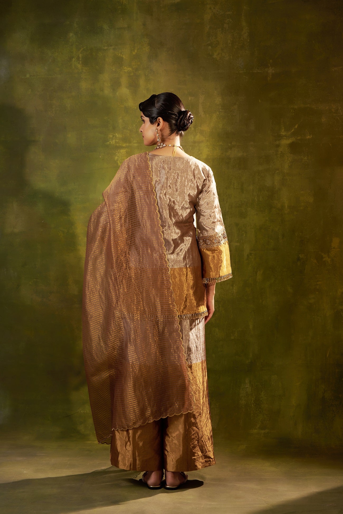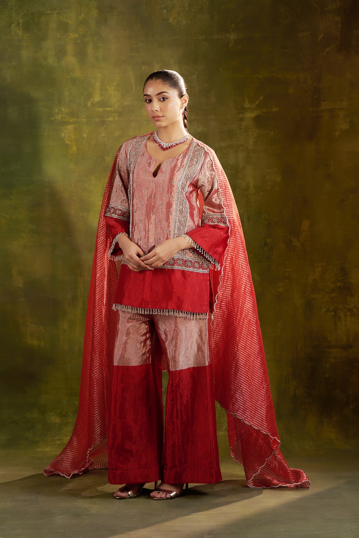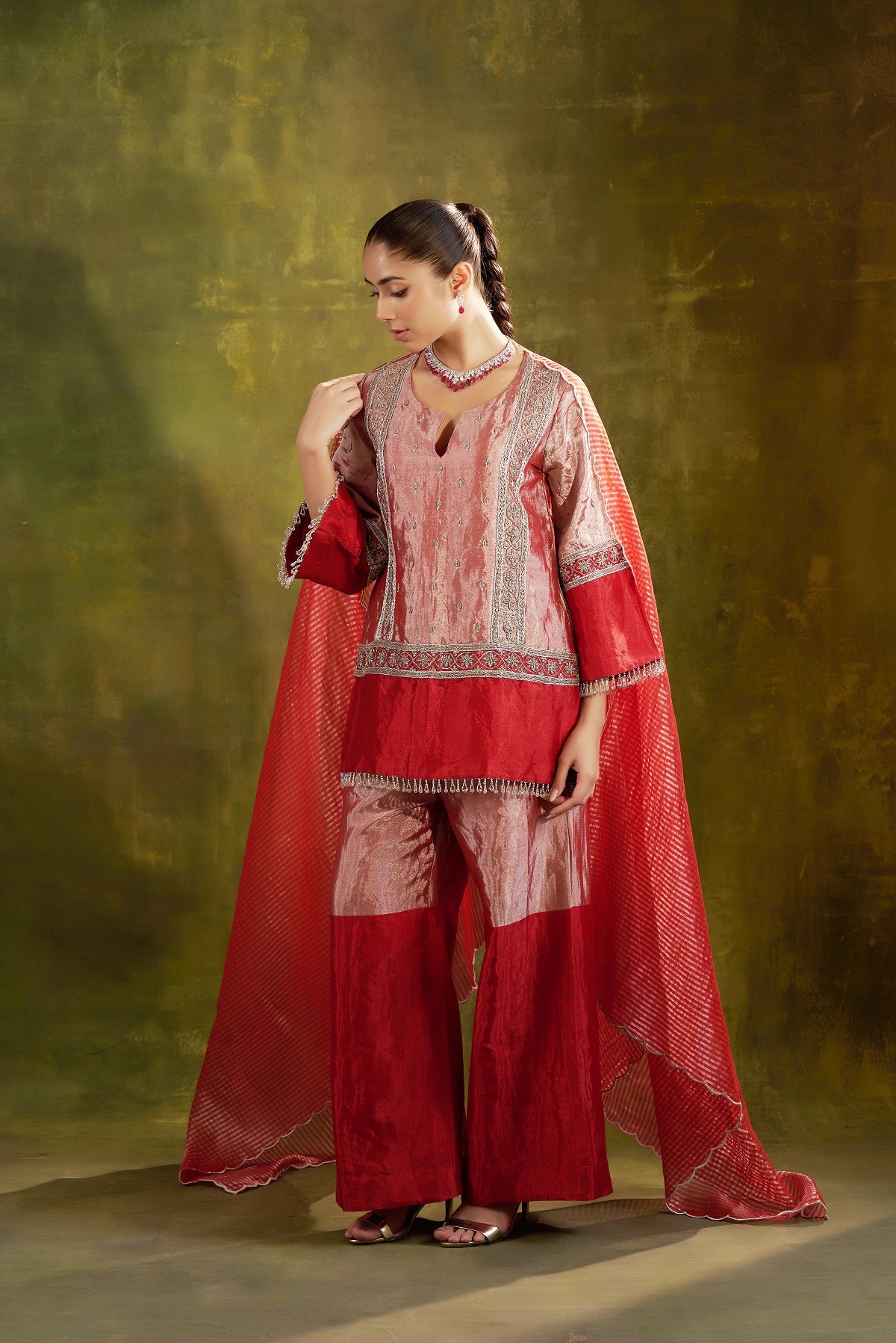 Short shirt and pallazo pants in tissue with striped banarsi dupatta
