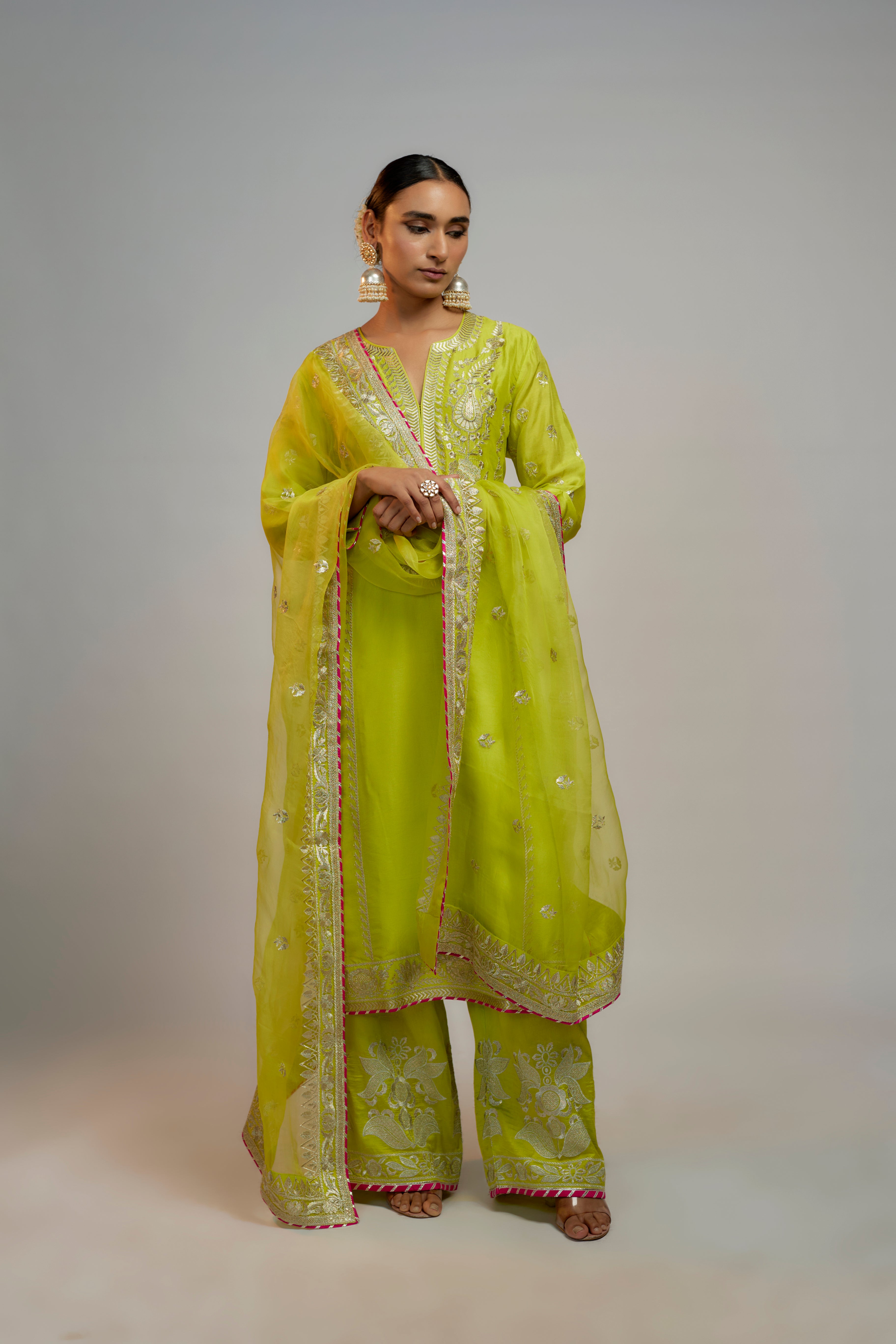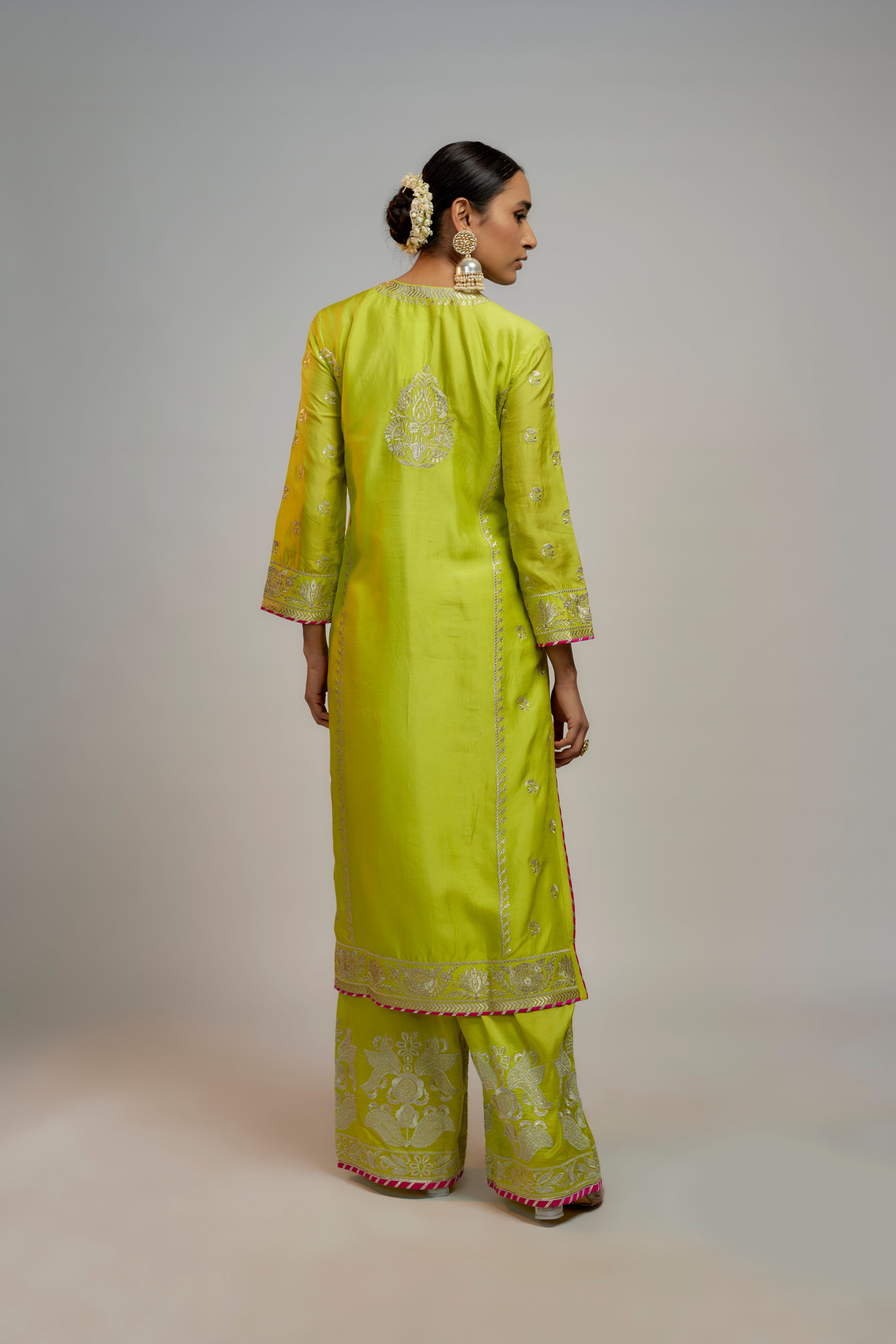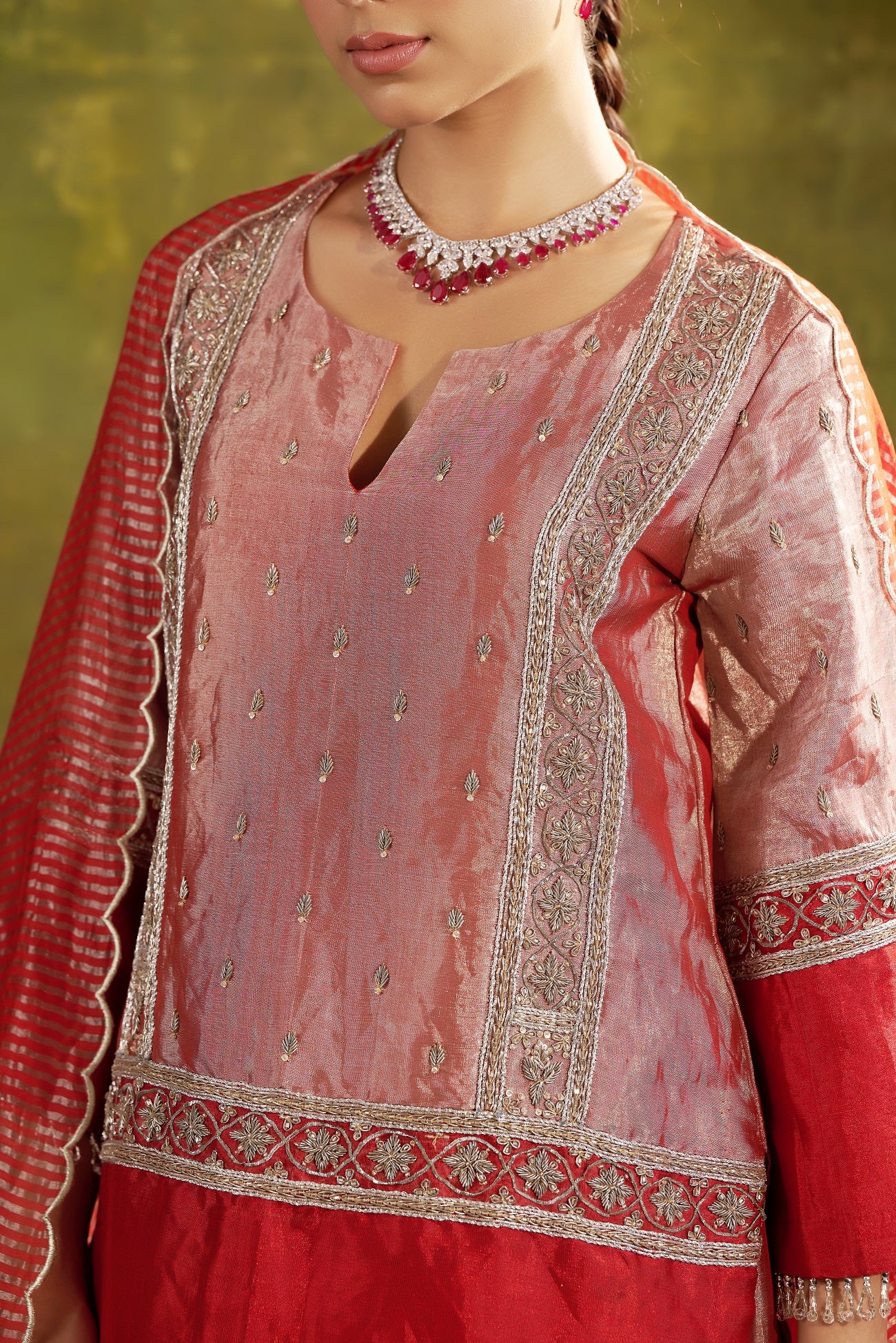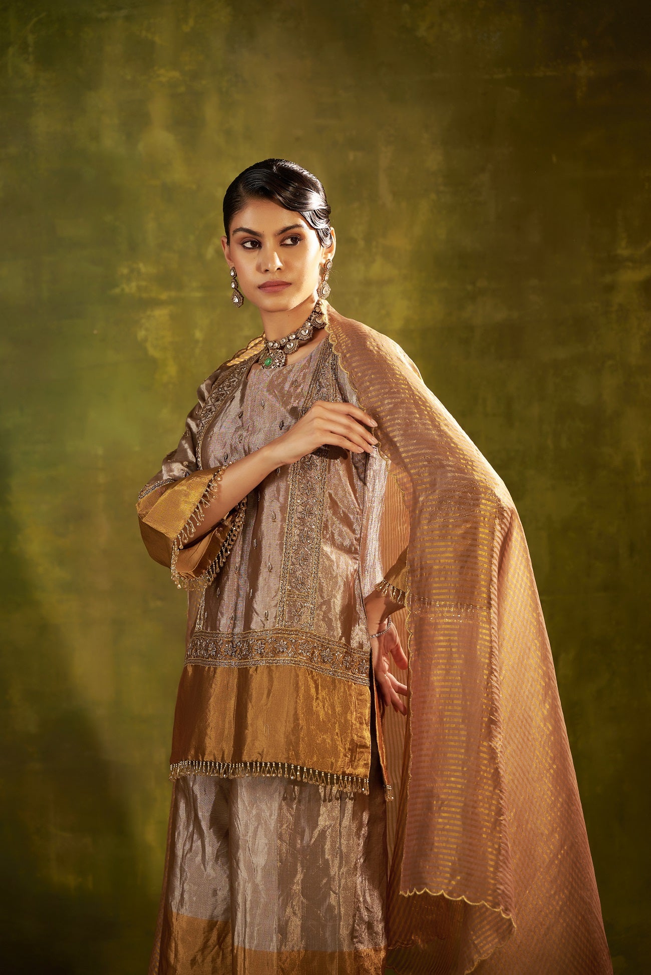 Short shirt and pallazo pants in tissue with striped banarsi dupatta