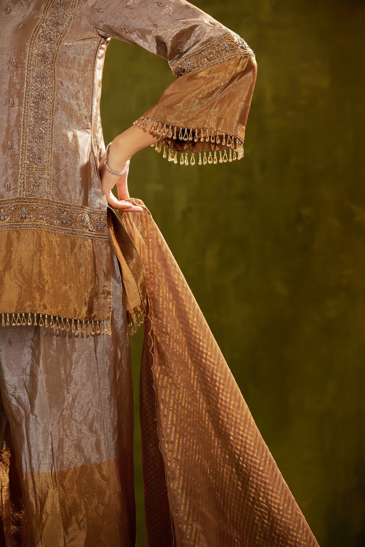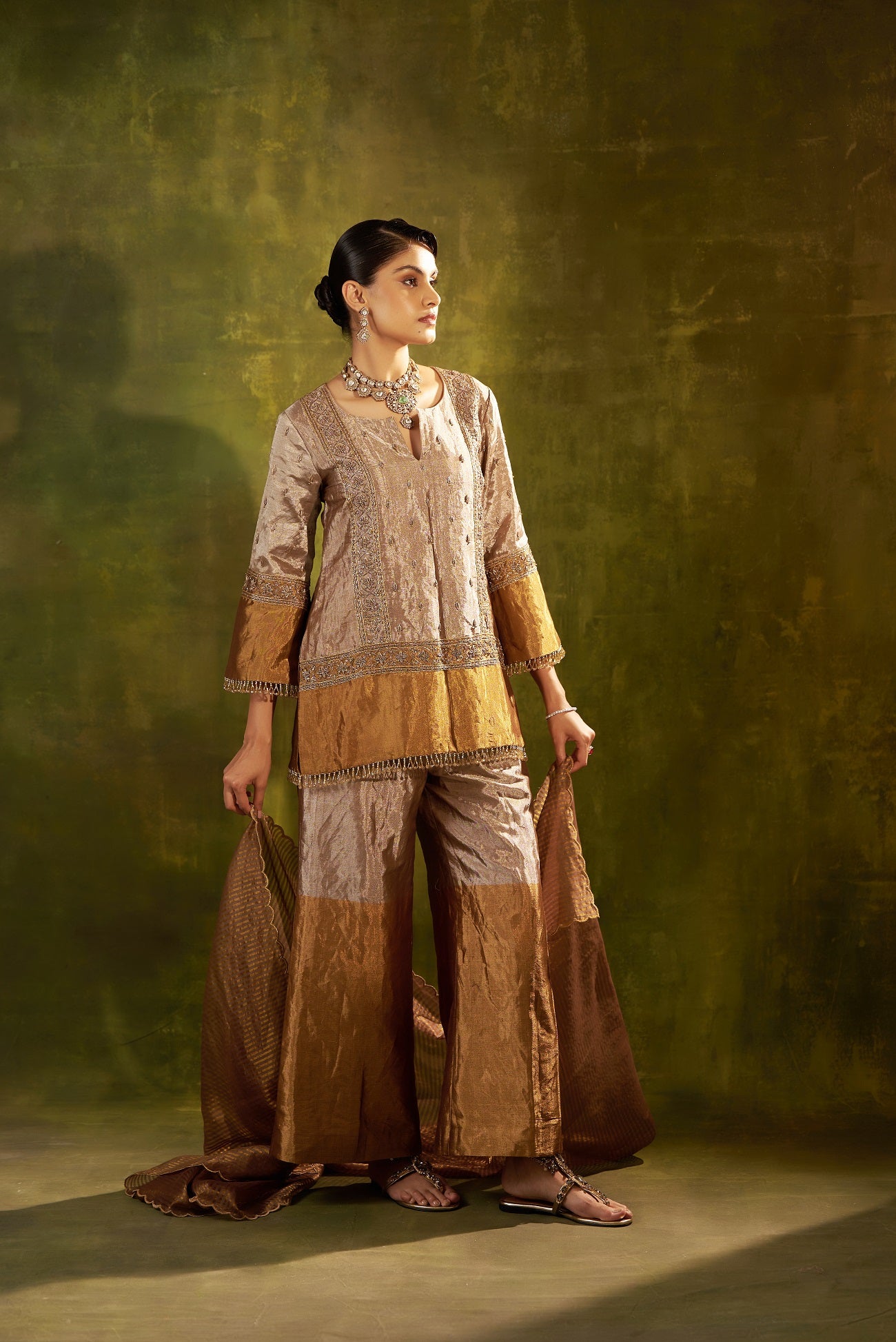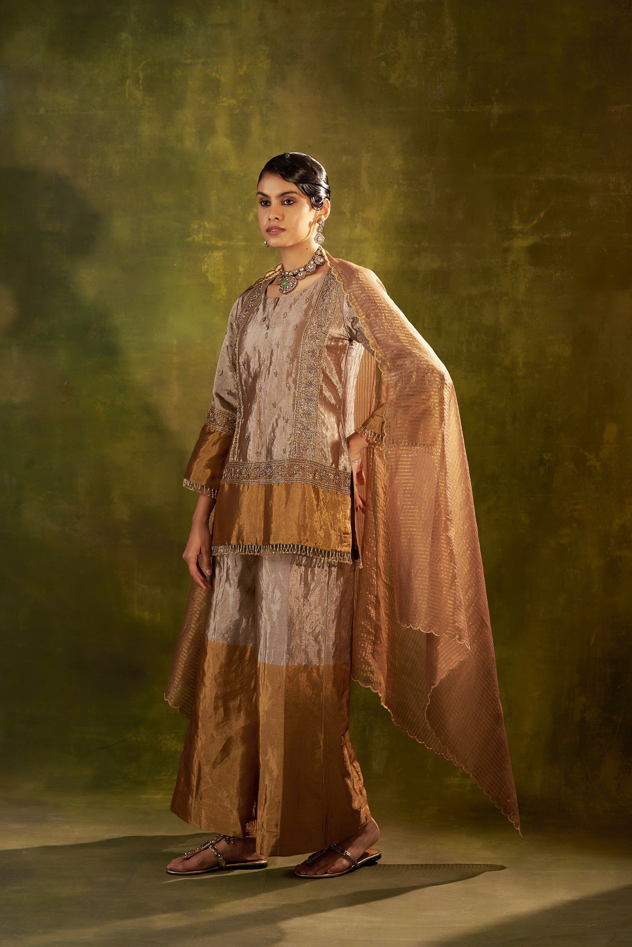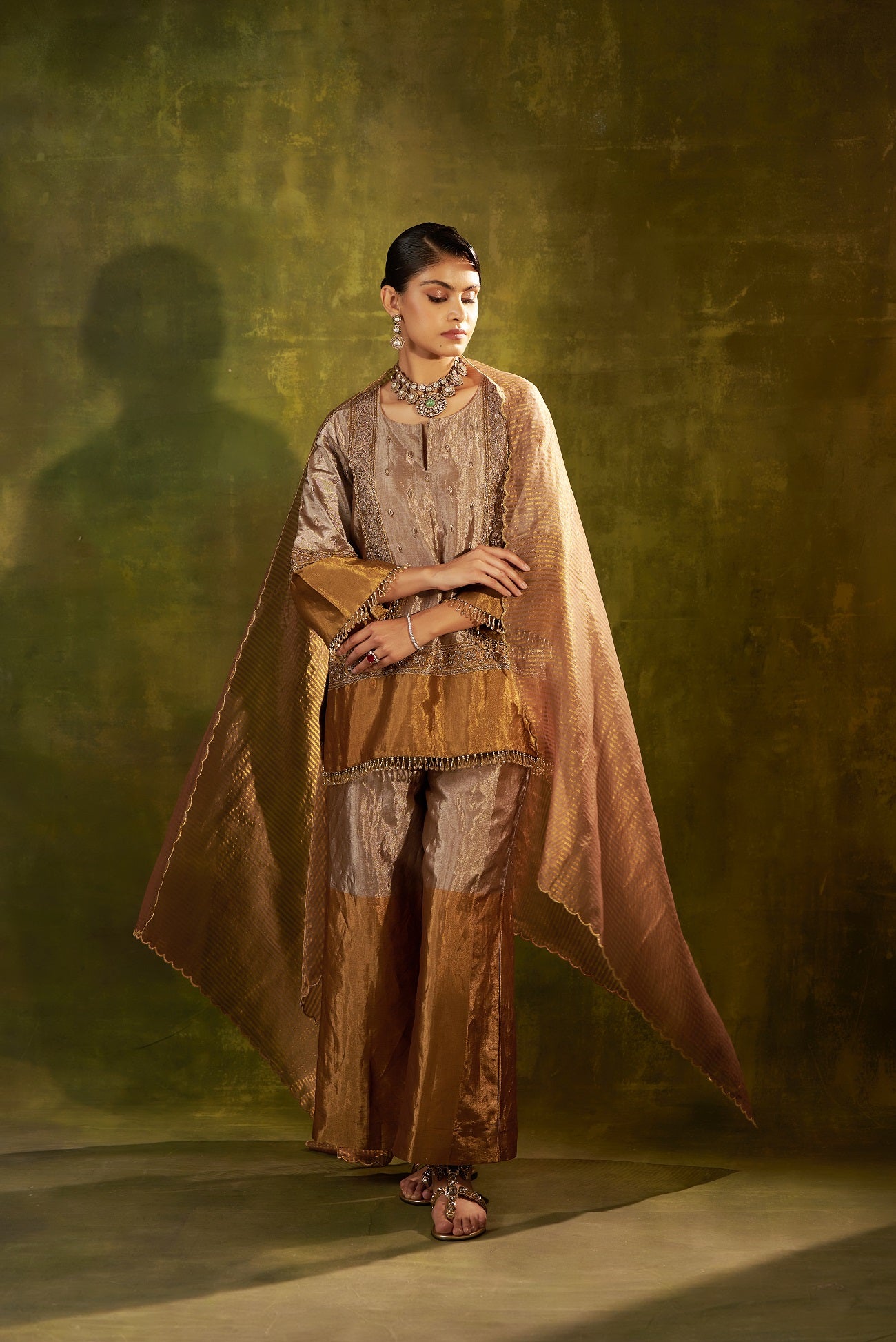 "short shirt and pallazo pants in tissue with striped banarsi dupatta"