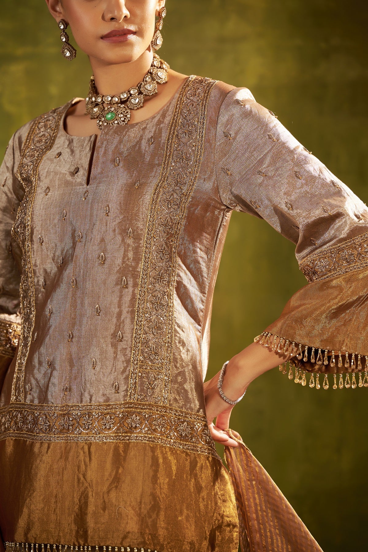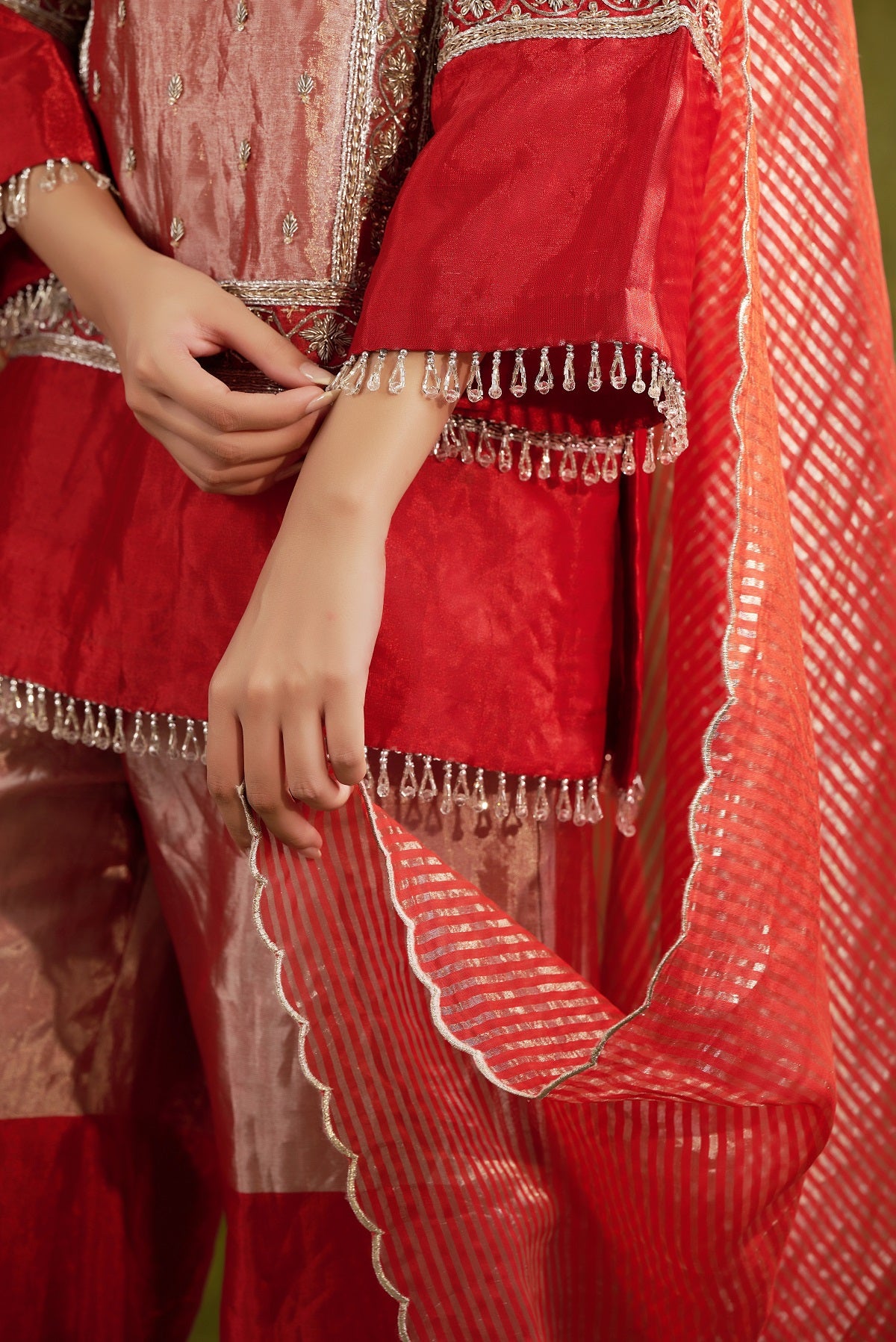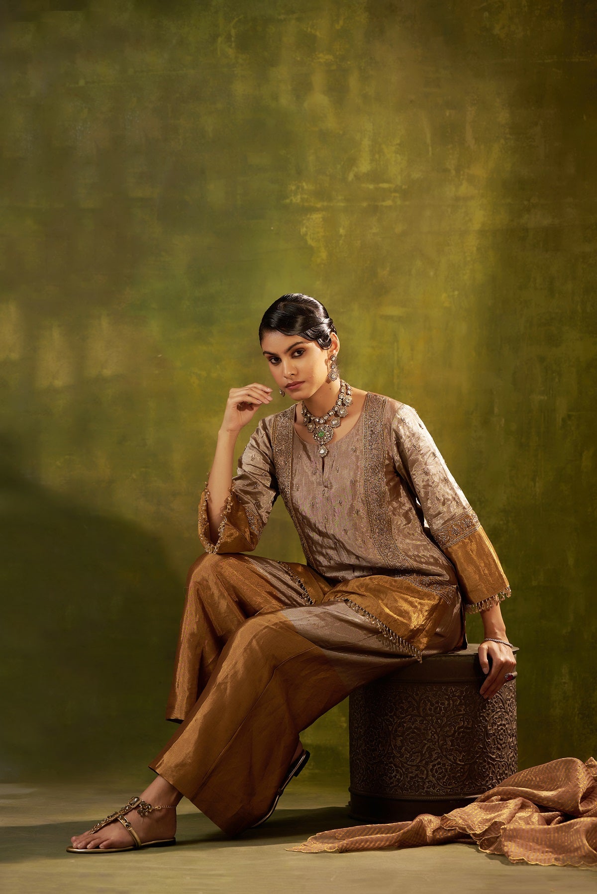 "short shirt and pallazo pants in tissue with striped banarsi dupatta"