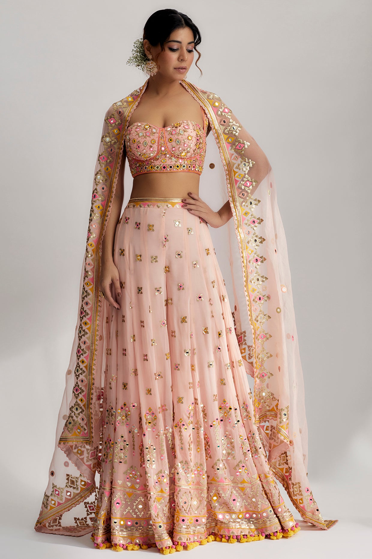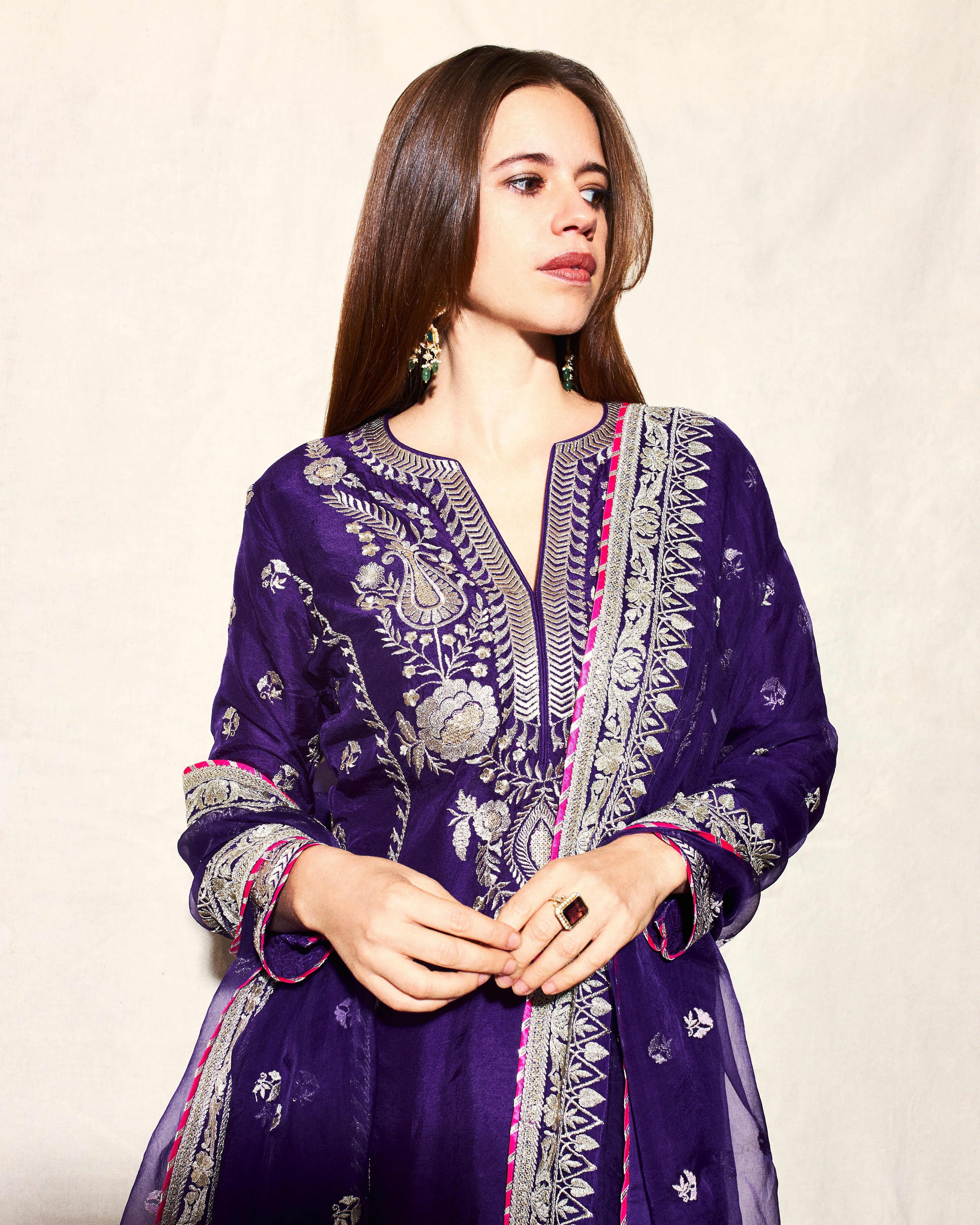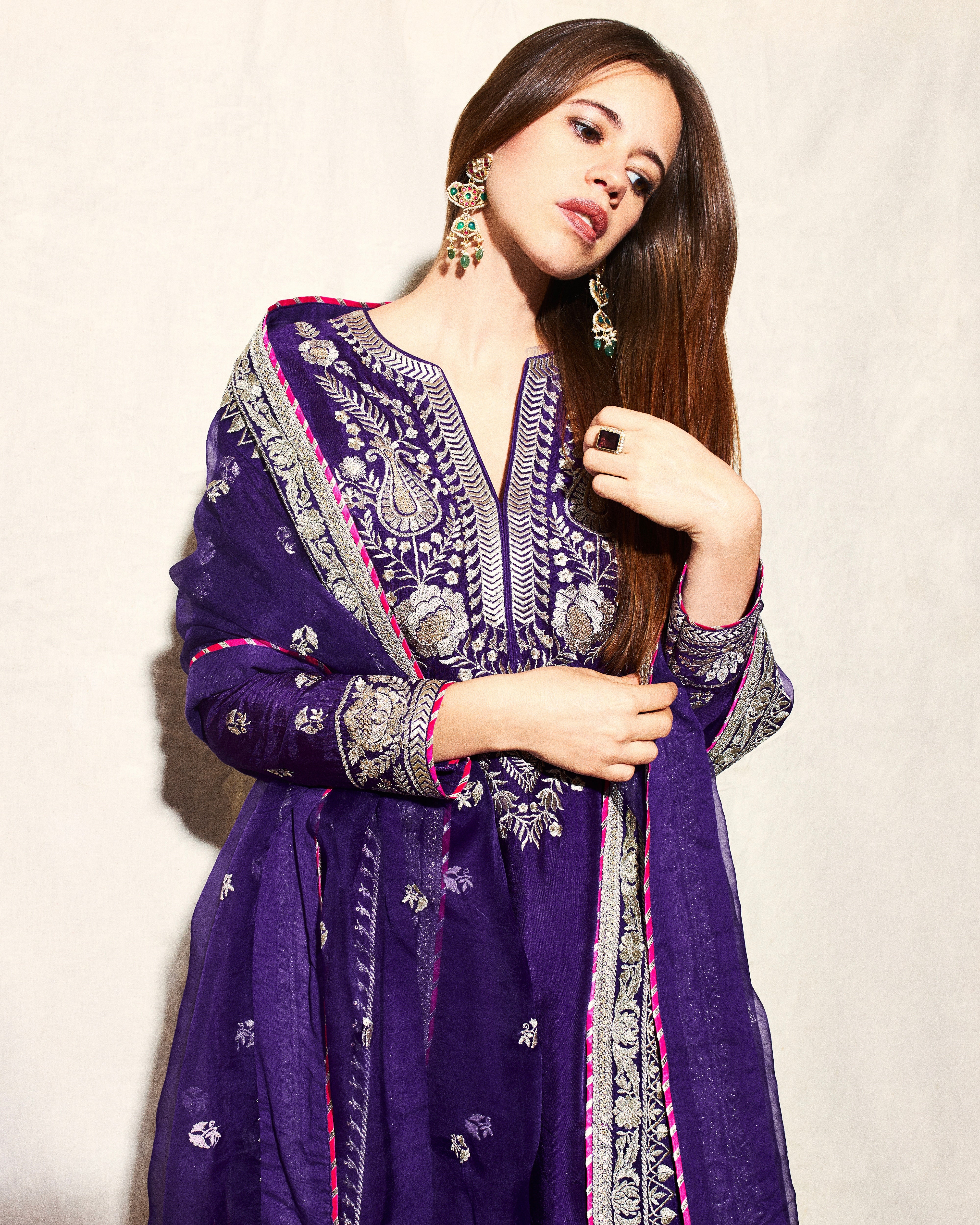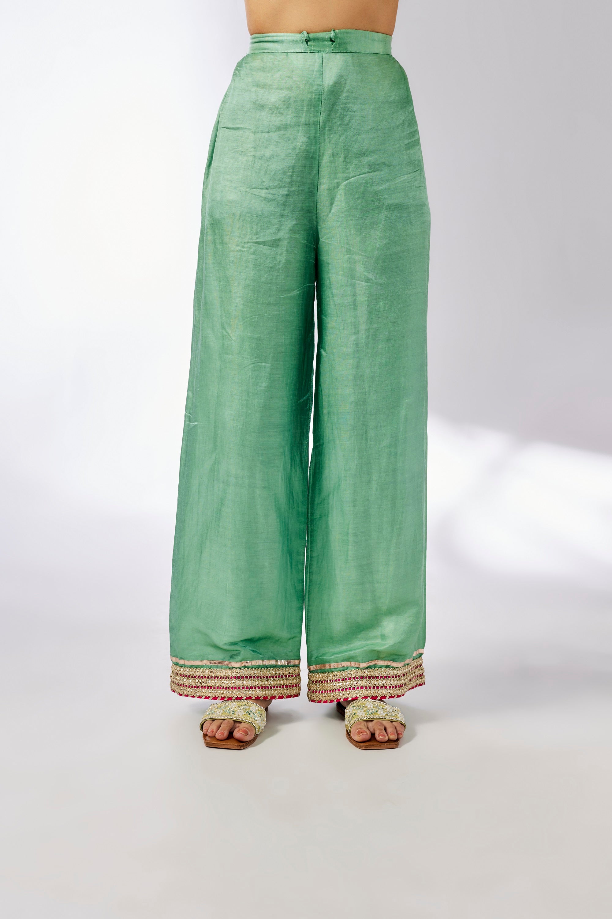 "short shirt and pallazo pants in tissue with striped banarsi dupatta"