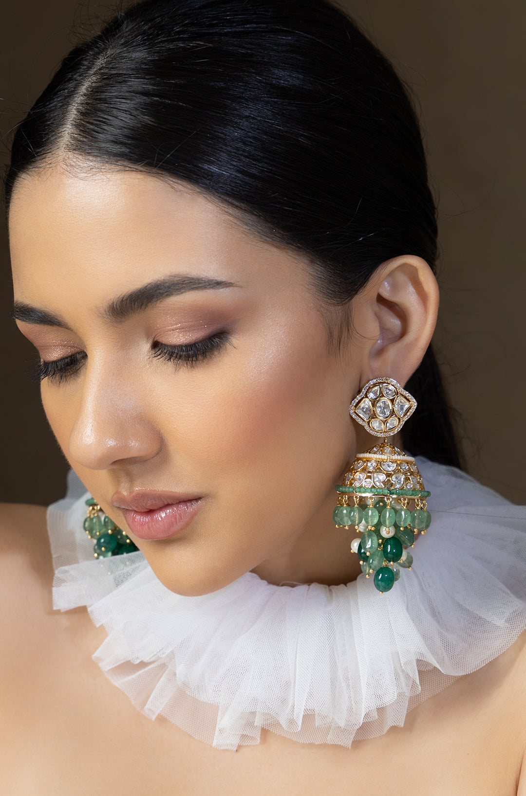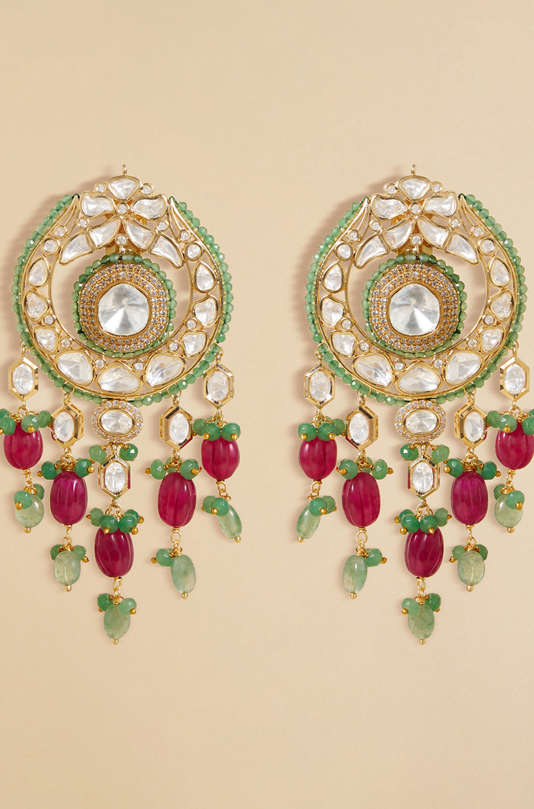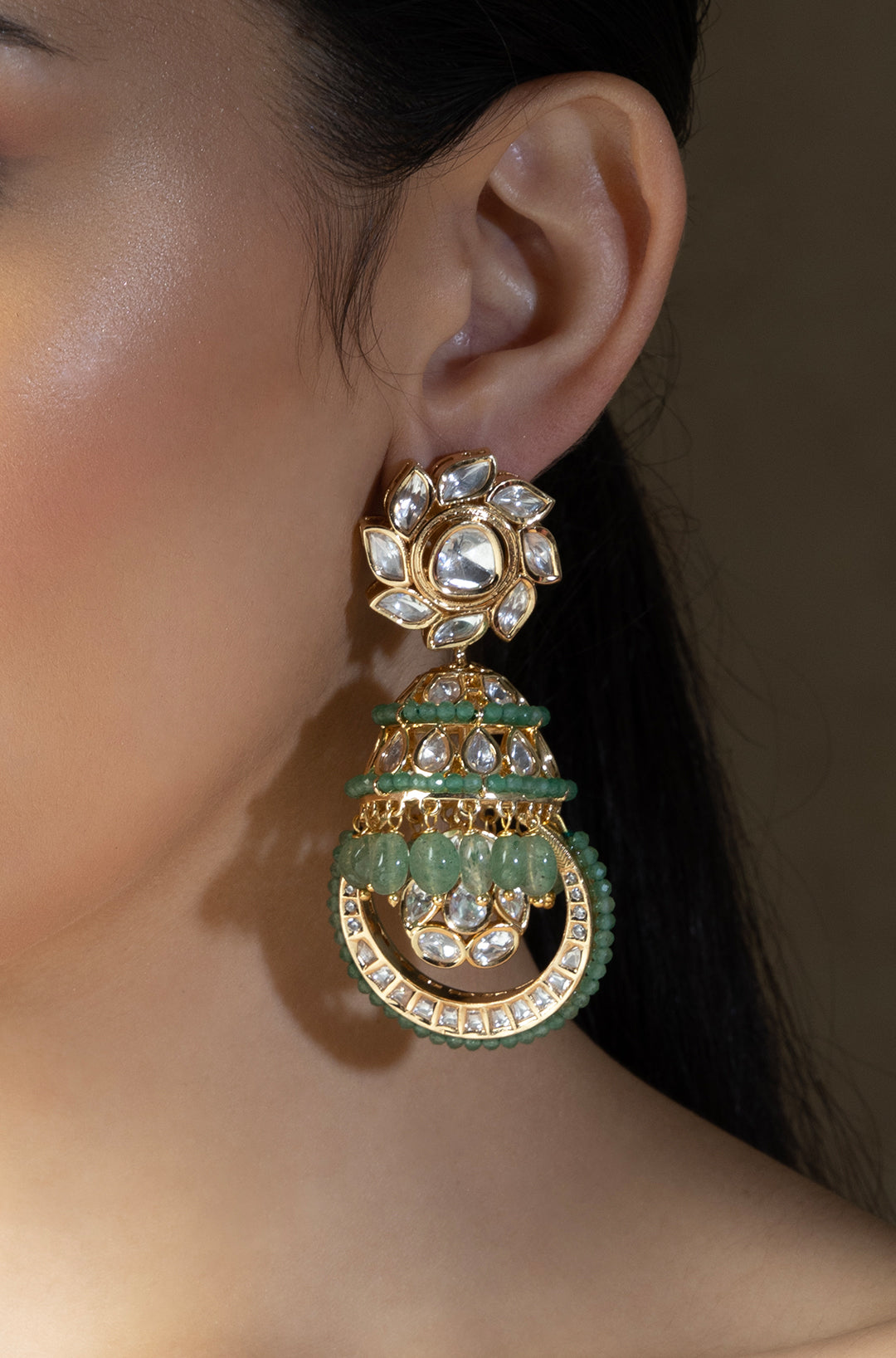 Polki and green beads jhumka earrings