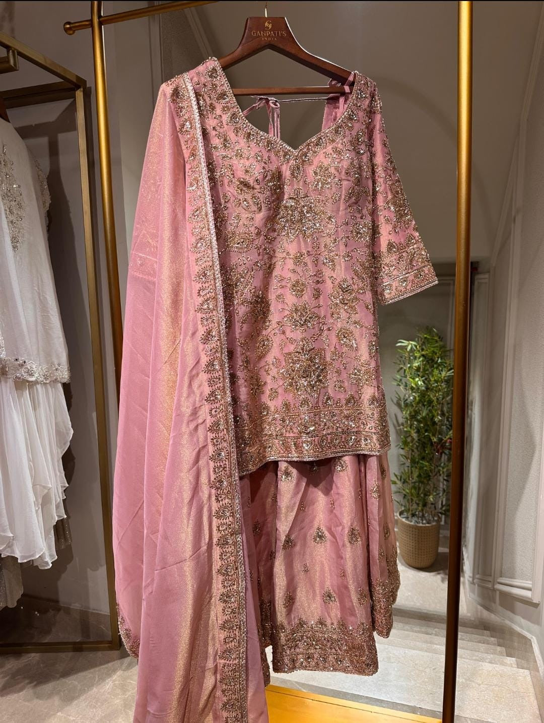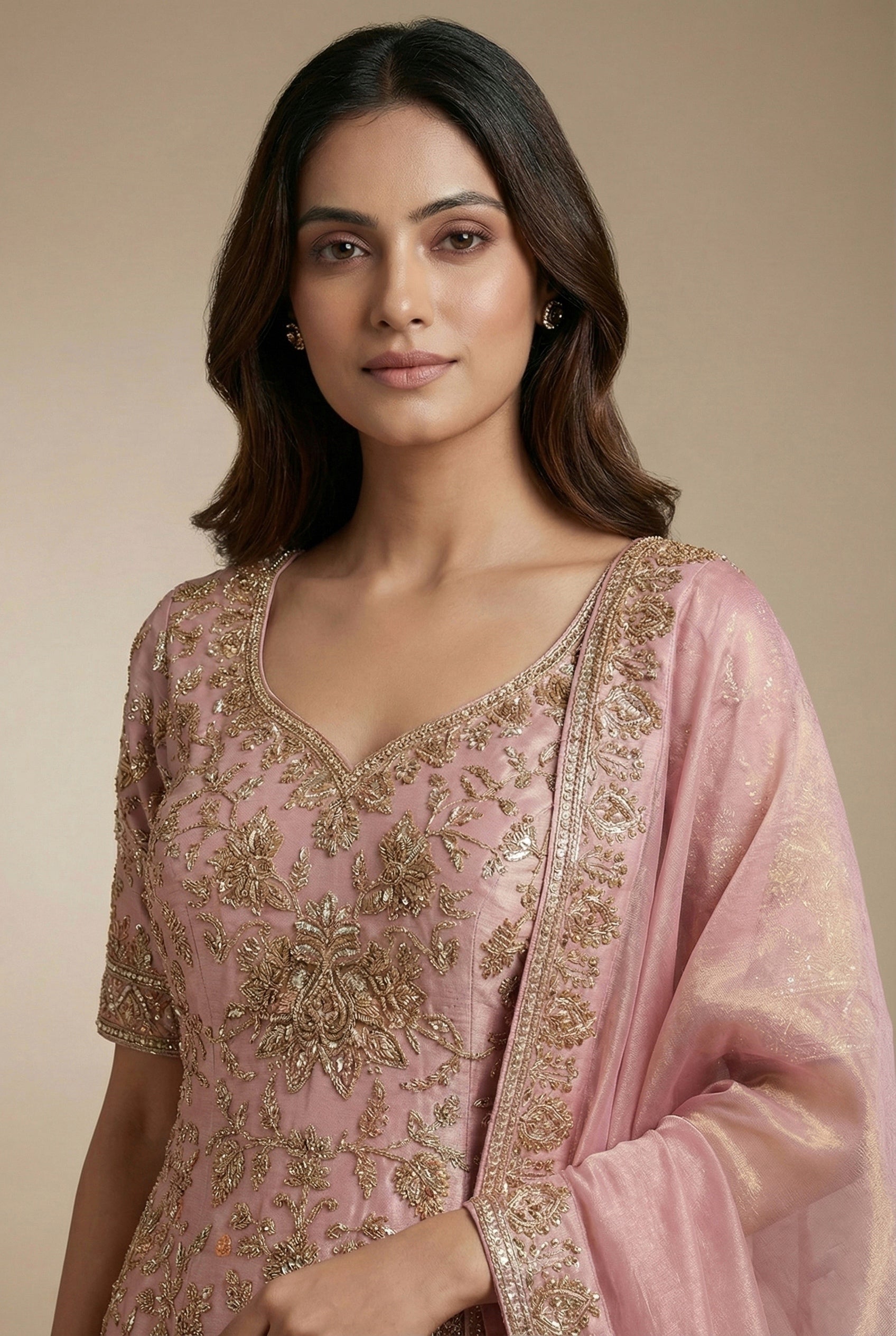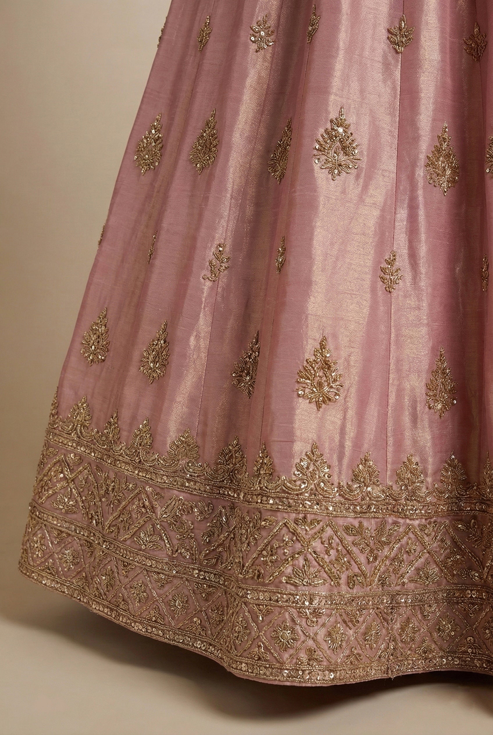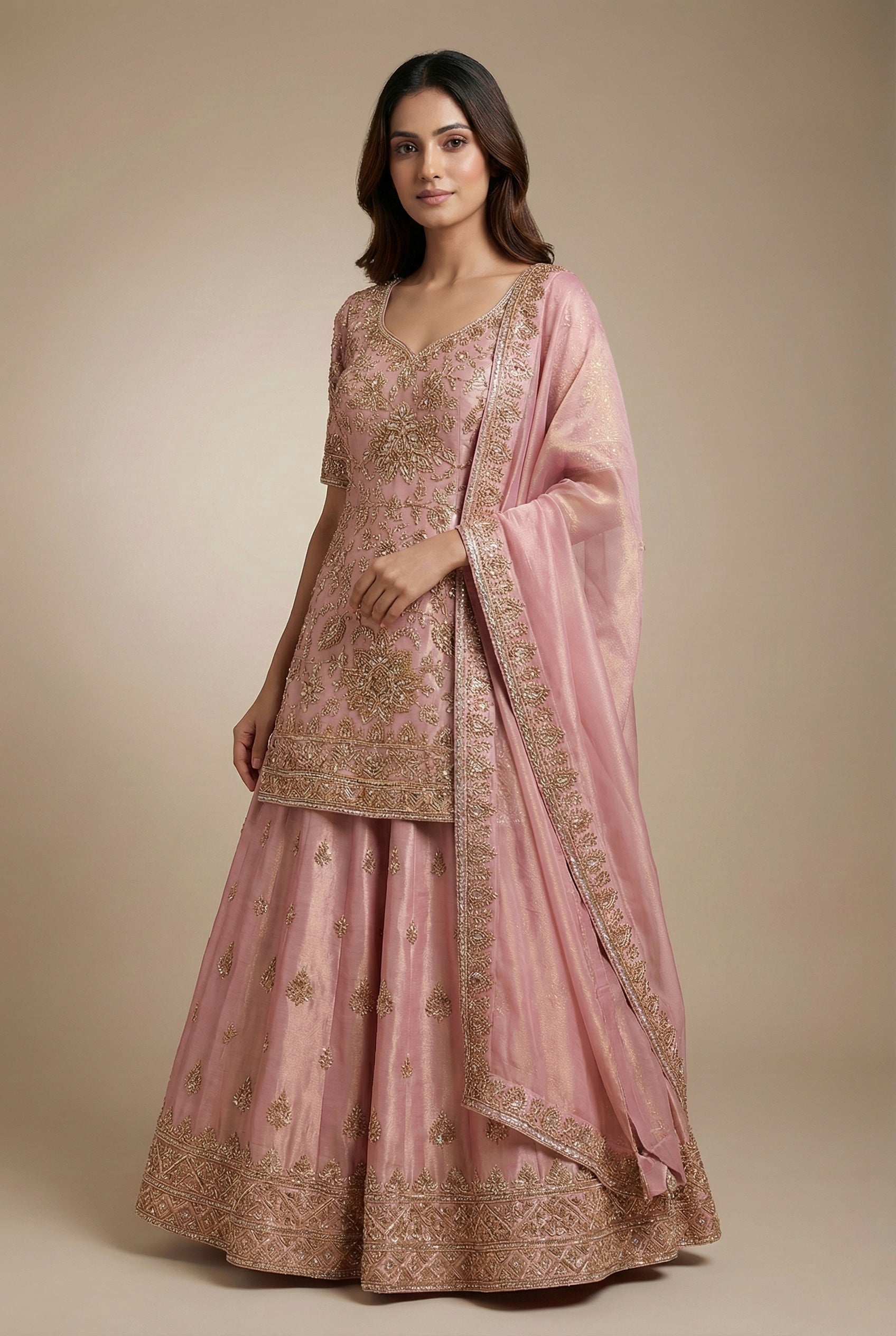 This graceful Blush Pink Shimmer Silk Long Suit with Lehenga Skirt is designed to exude timeless elegance and feminine charm. Crafted from luxurious shimmer silk, the long suit features intricate antique gold floral embroidery spread beautifully across the fabric, complemented by a finely embellished neckline and detailed borders The matching lehenga skirt enhances the ensemble with delicate embroidery and a richly finished hem, adding volume and movement. A coordinated shimmer silk dupatta with an embroidered border completes the look, lending softness and sophistication. Perfect for weddings, festive occasions, engagements, and special celebrations, this ensemble blends traditional craftsmanship with a refined modern silhouette.