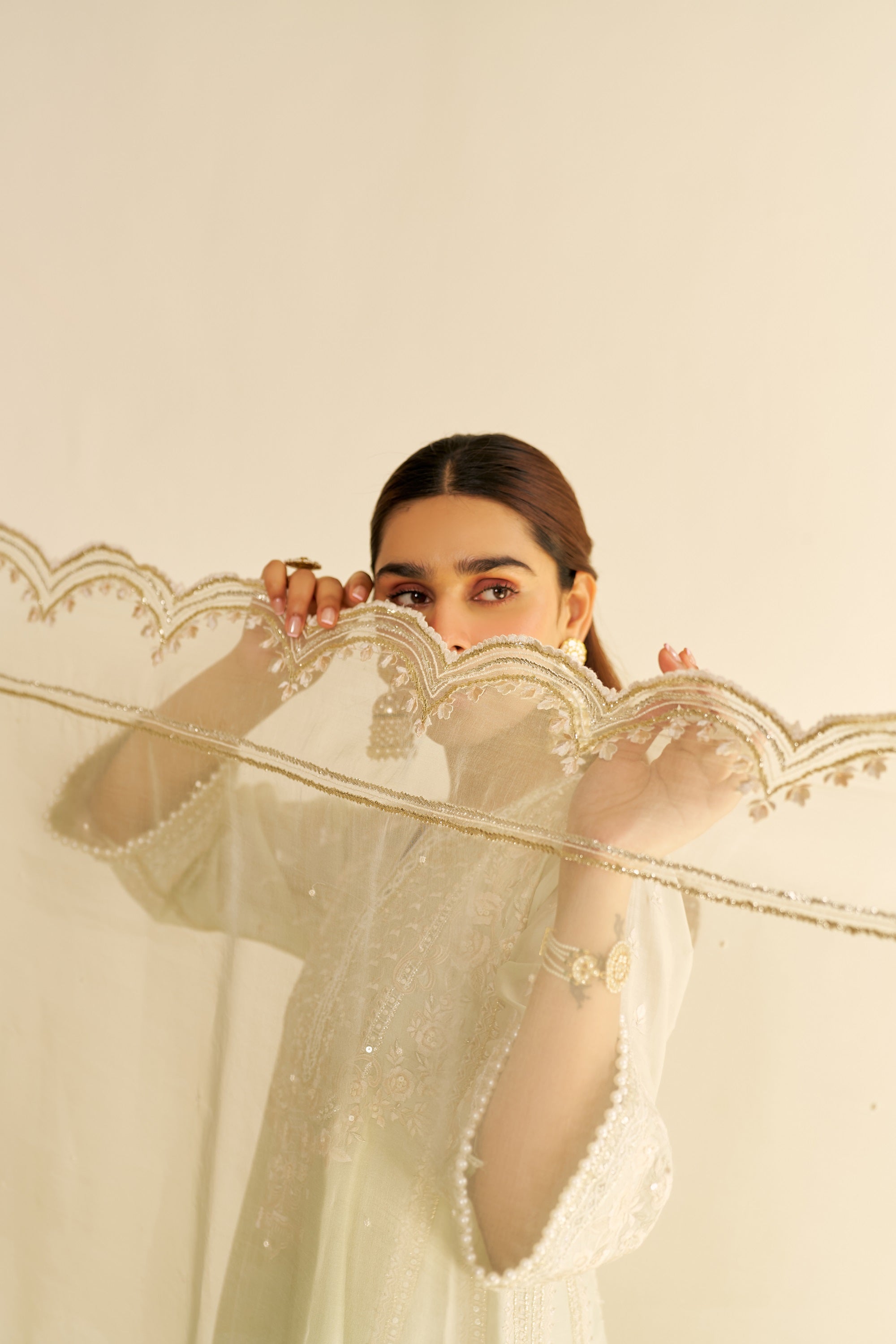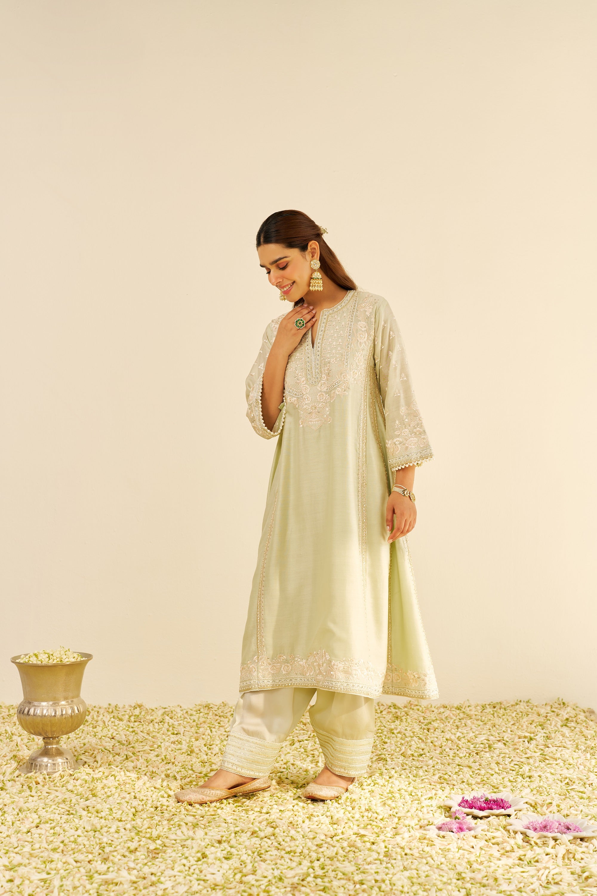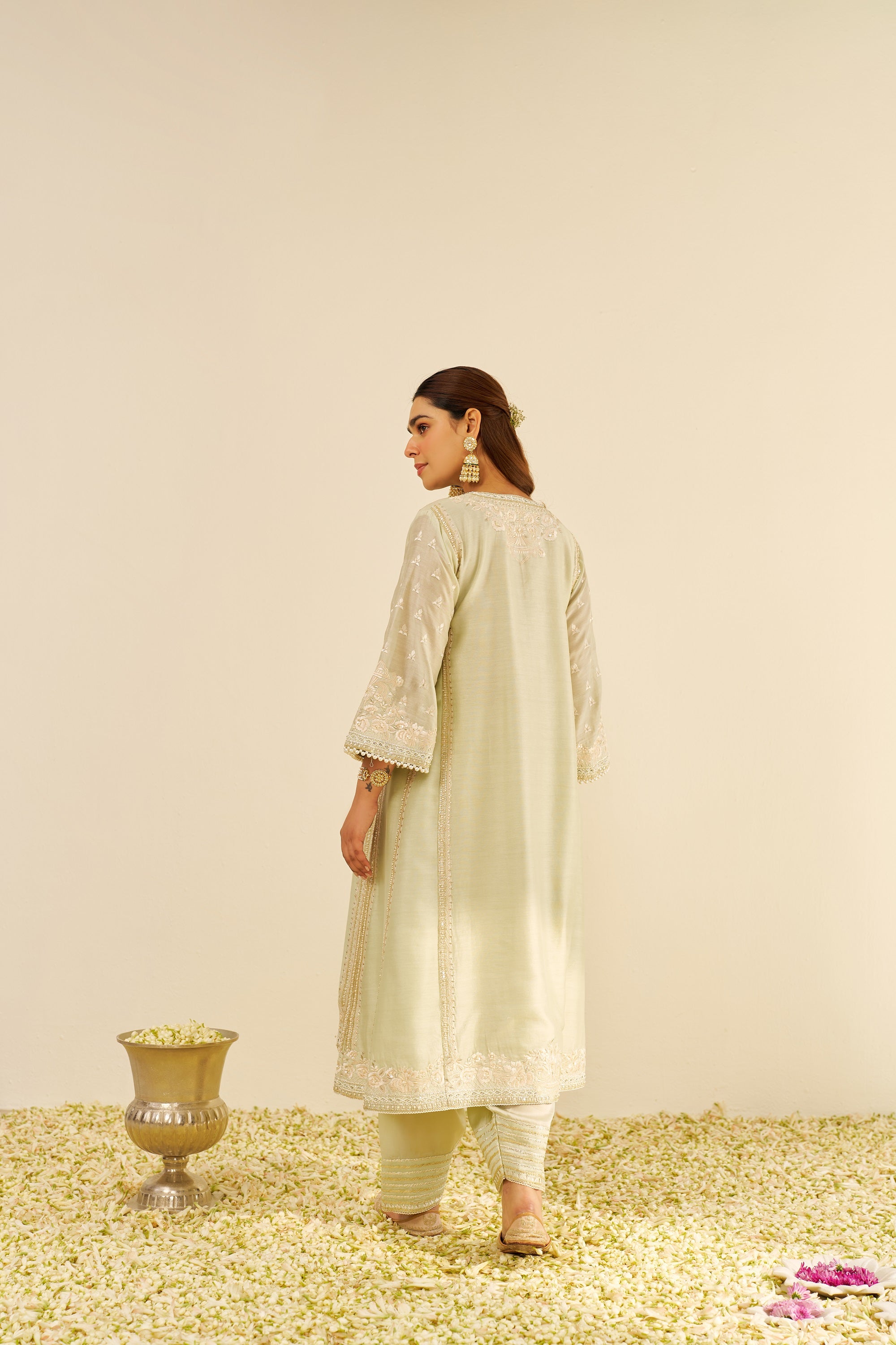 The Long Chauga Is Crafted From Luxurious Fabric In A Refreshing Mint Green Shade That Exudes Grace And Sophistication. Its Intricate Maaroofa Embroidery, Inspired By Traditional Floral Motifs, Beautifully Adorns The Bodice And Hemline, Adding A Touch Of Artistry To The Attire. The Flowing Silhouette Of The Chauga Provides Comfort And Style, While The Tailored Fit Enhances Your Natural Elegance.