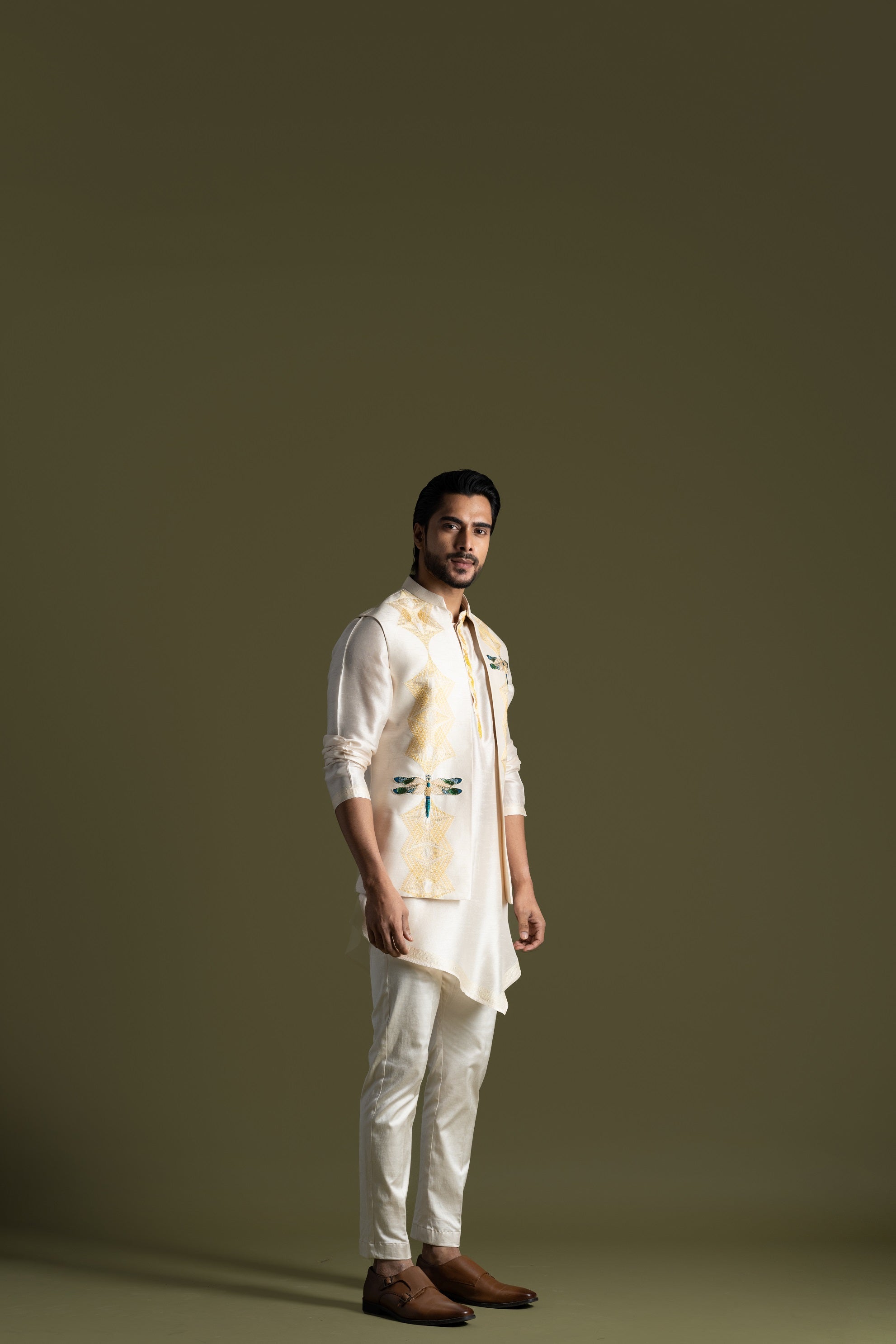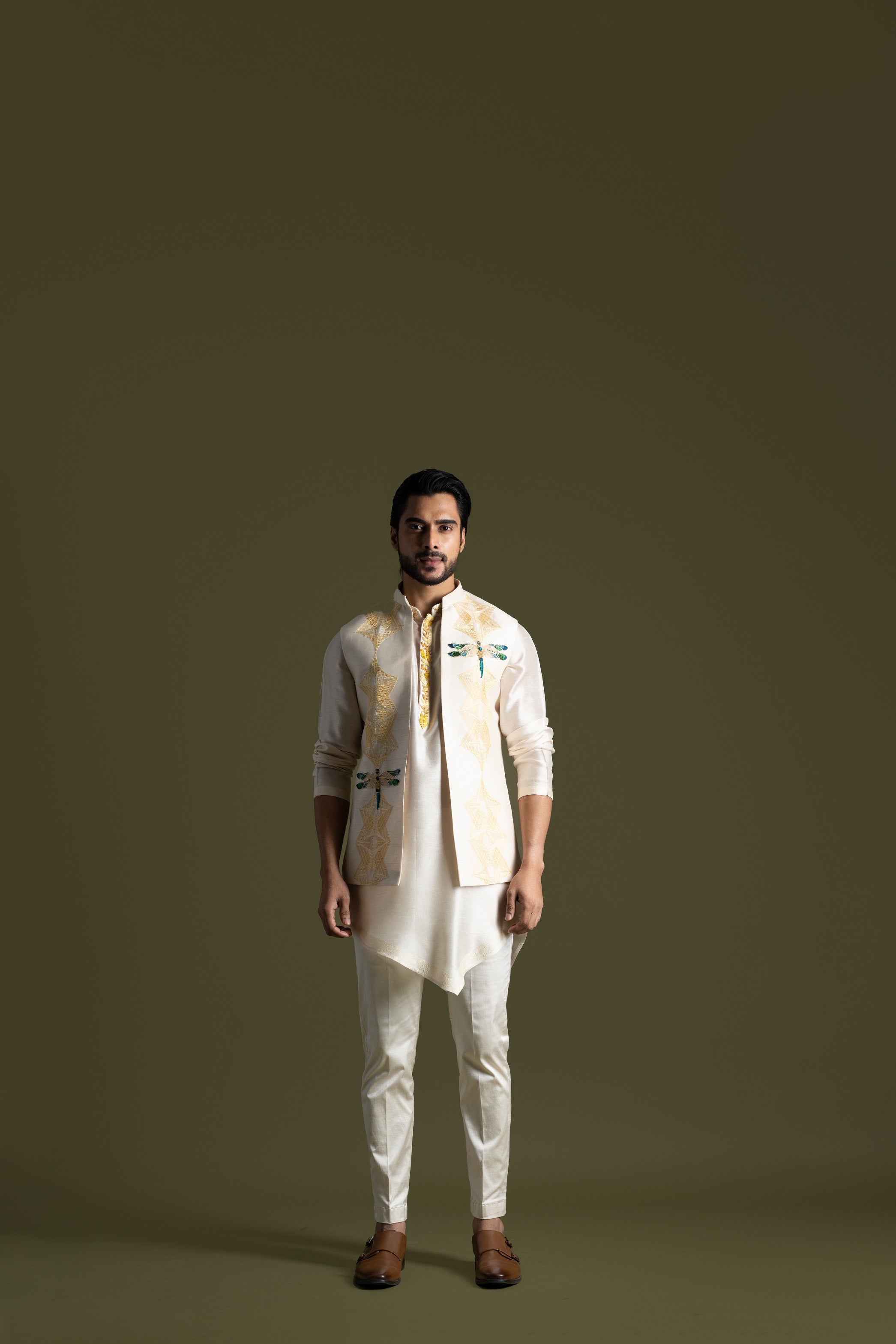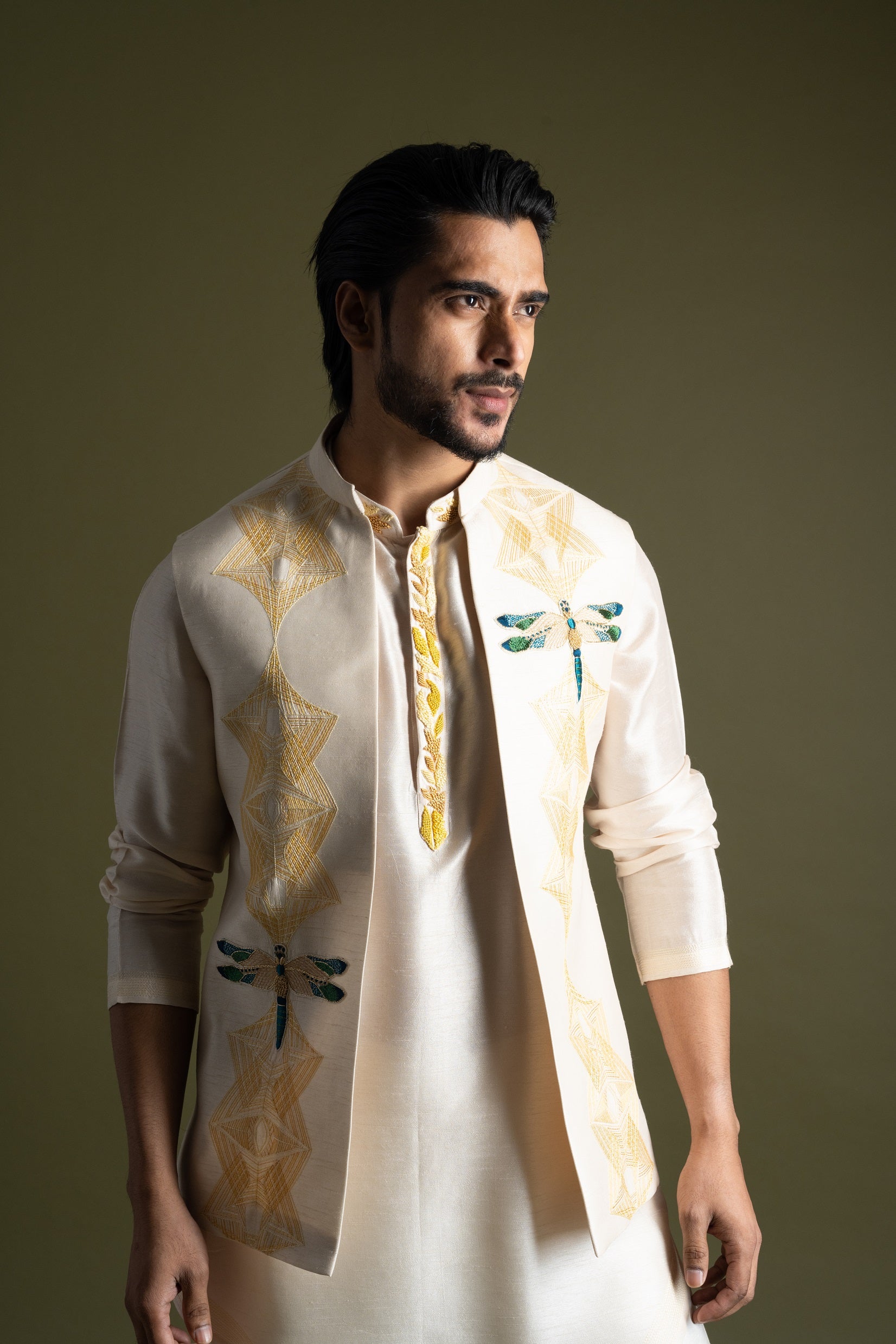 | CREAM OPEN NEHRU JACKET WITH EGYPTIAN INSPIRED THREADWORK HIGHLIGHTED WITH APPLIQUE MOTIFS. PAIRED WITH CREAM KURTA IN SILK WITH AN ASSYMETRIC CUT AND SUBTLE EMBROIDERY AROUND COLLAR AND BUTTON PLACKET. PAIRED WIT A CREAM PANT PAJAMA |