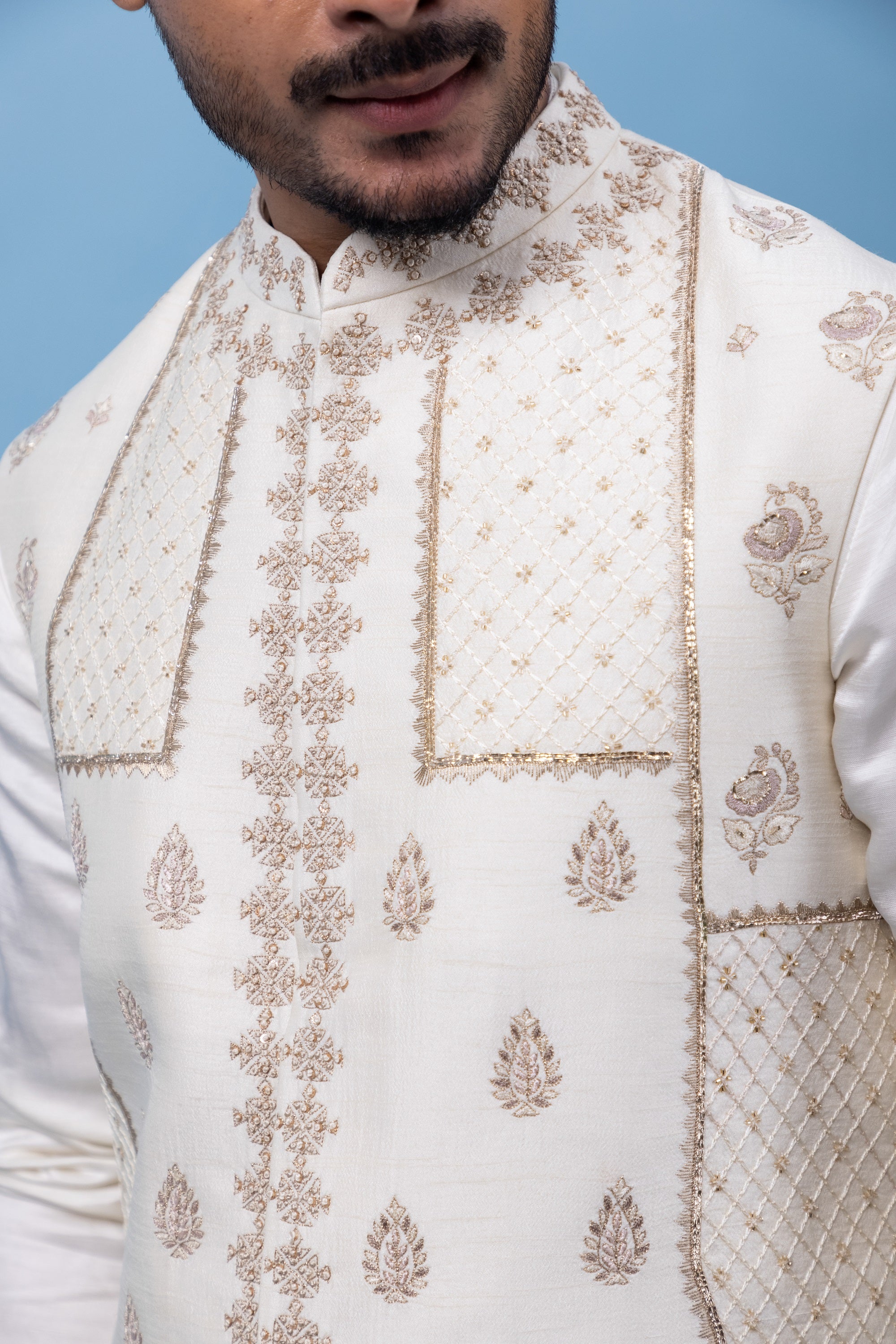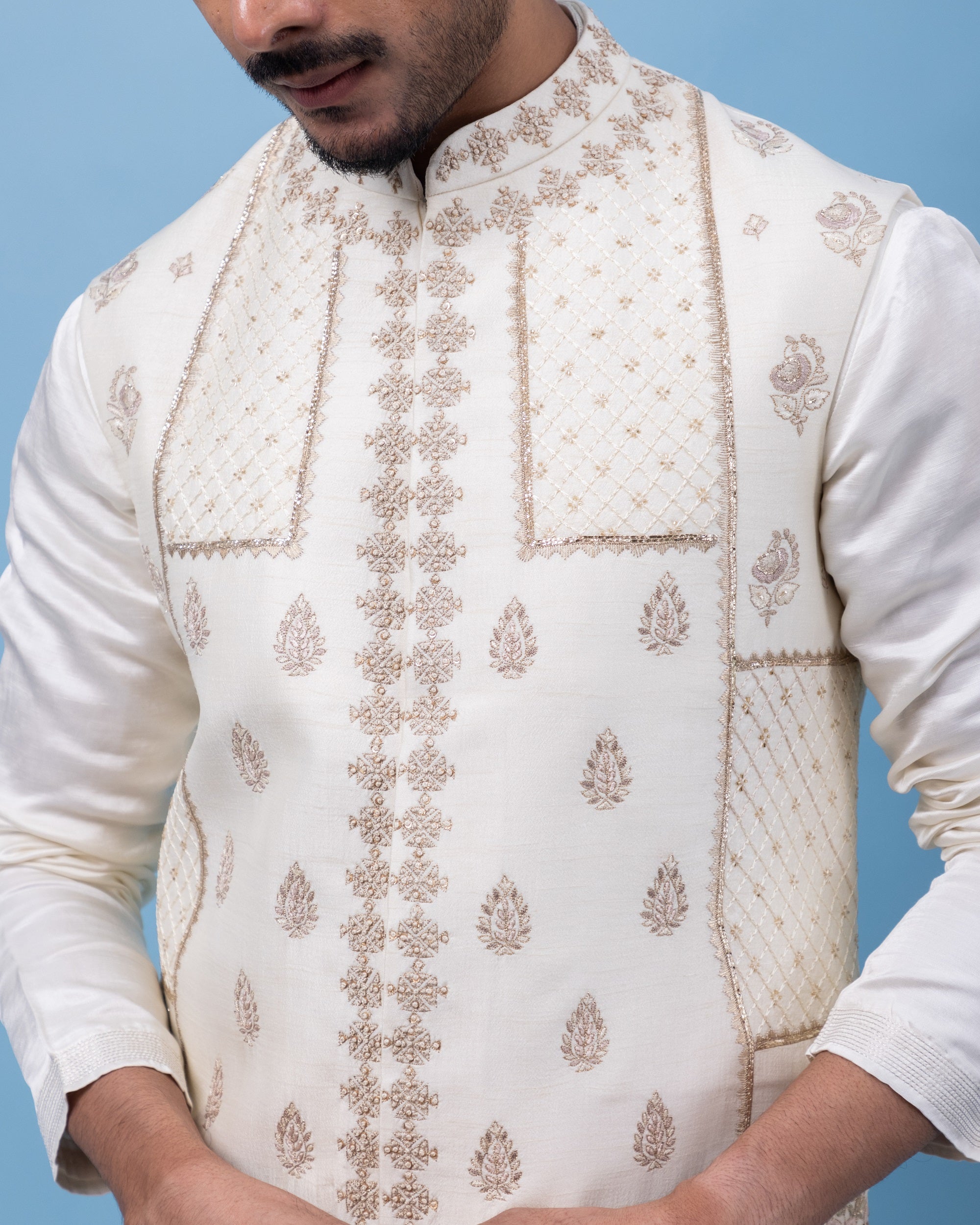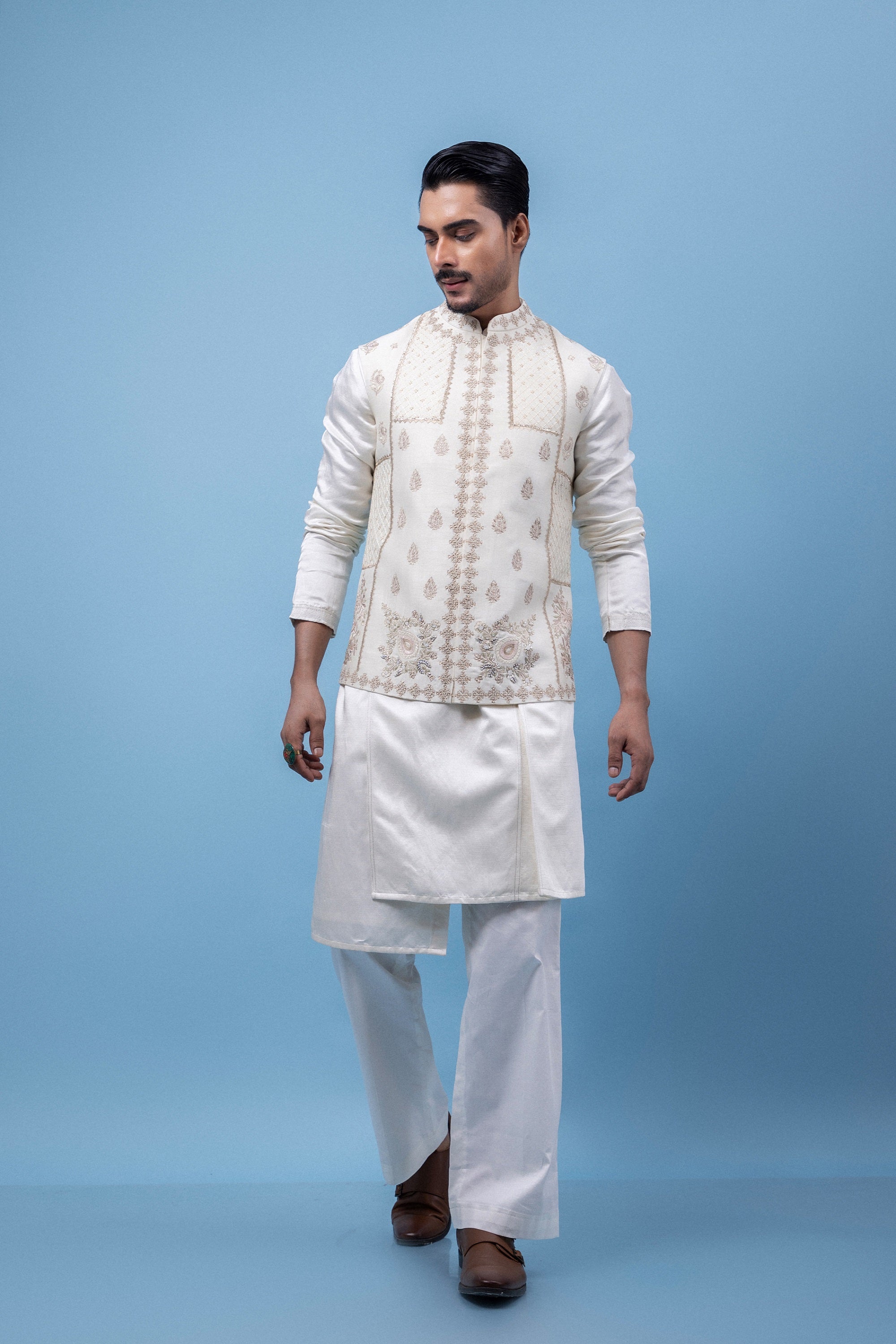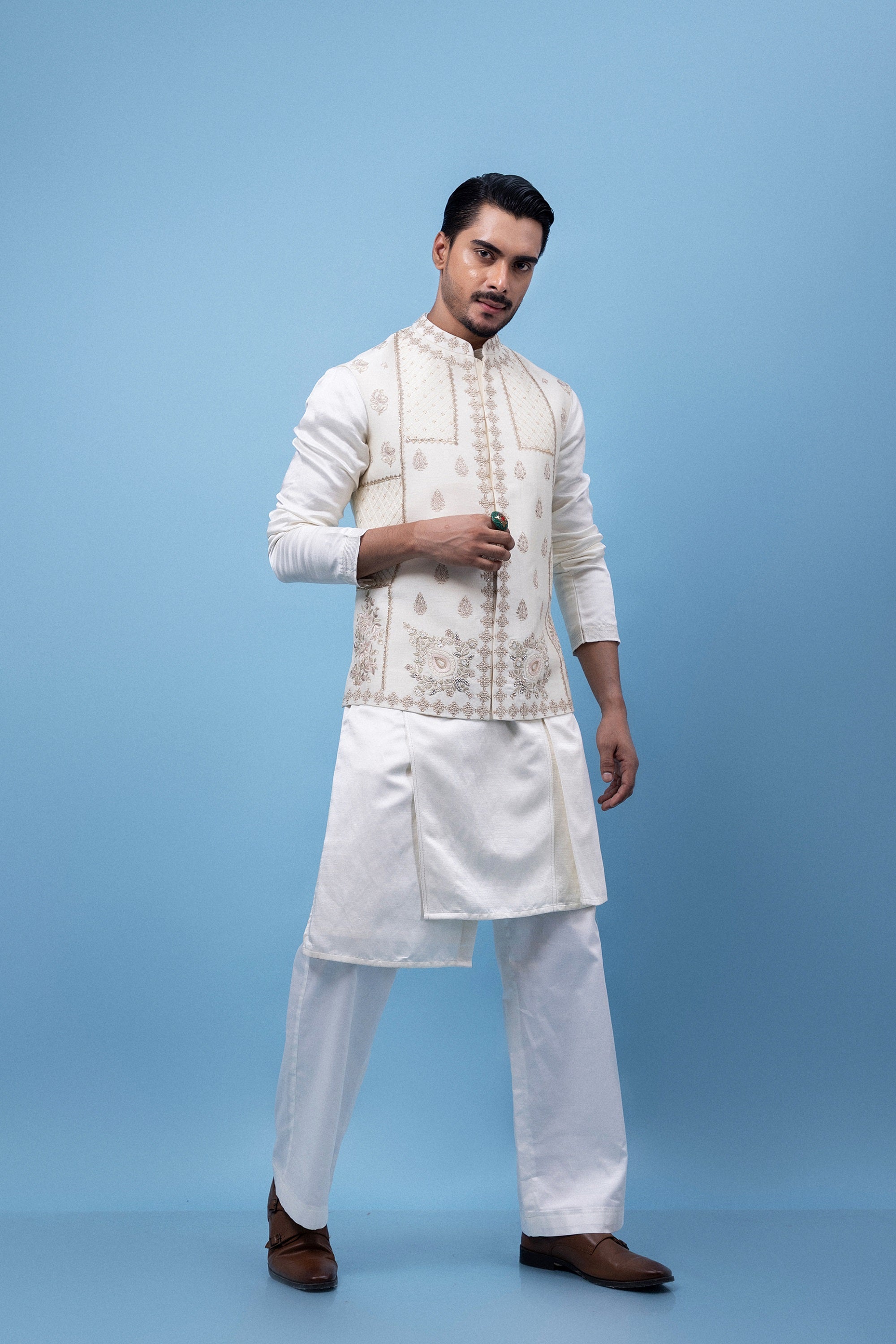 An ivory Nehru jacket adorned with soft pastel embroidery and subtle zari work, paired with a matching cut kurta for a refined, monochromatic look that blends tradition with modernity.