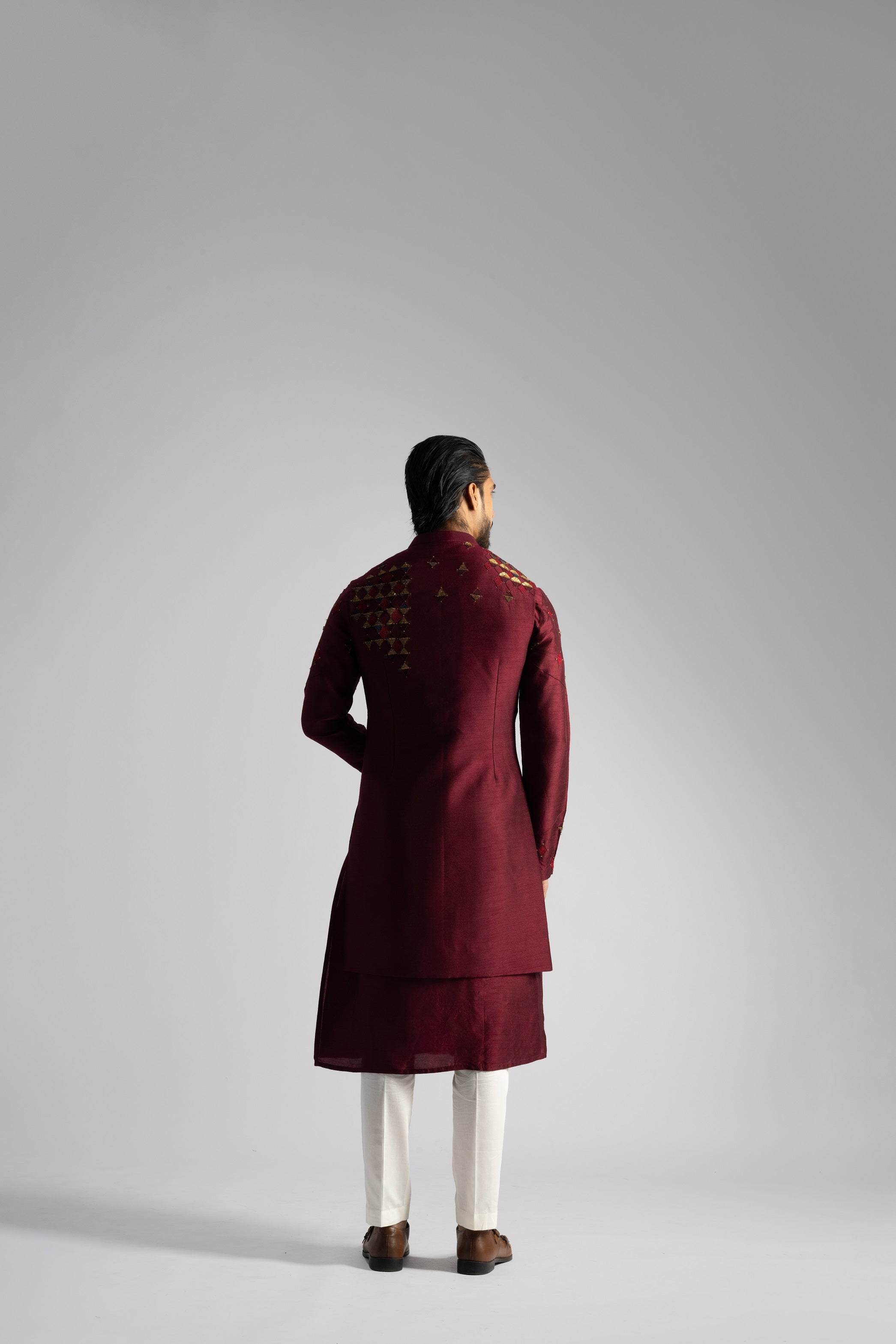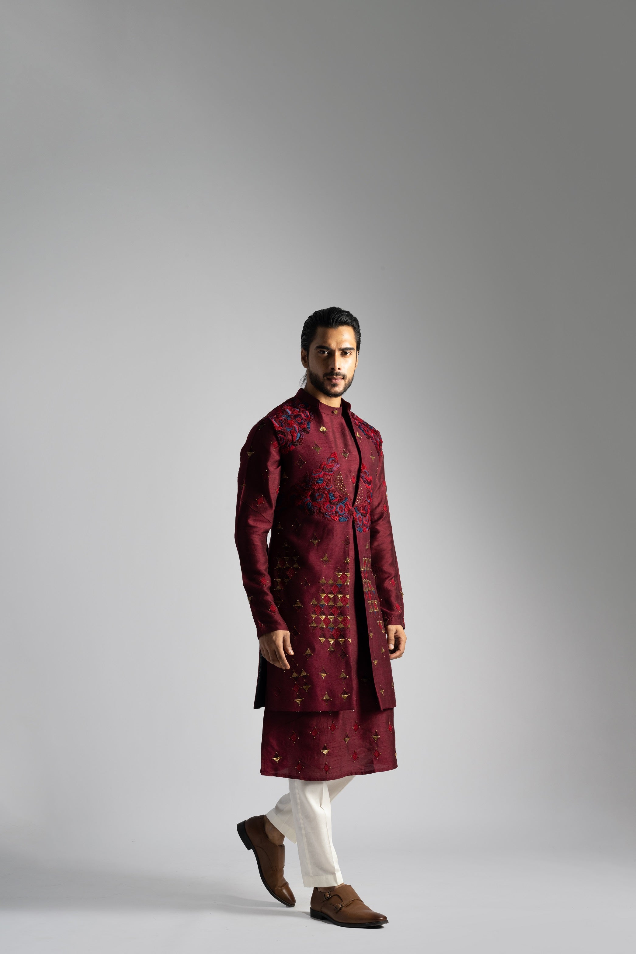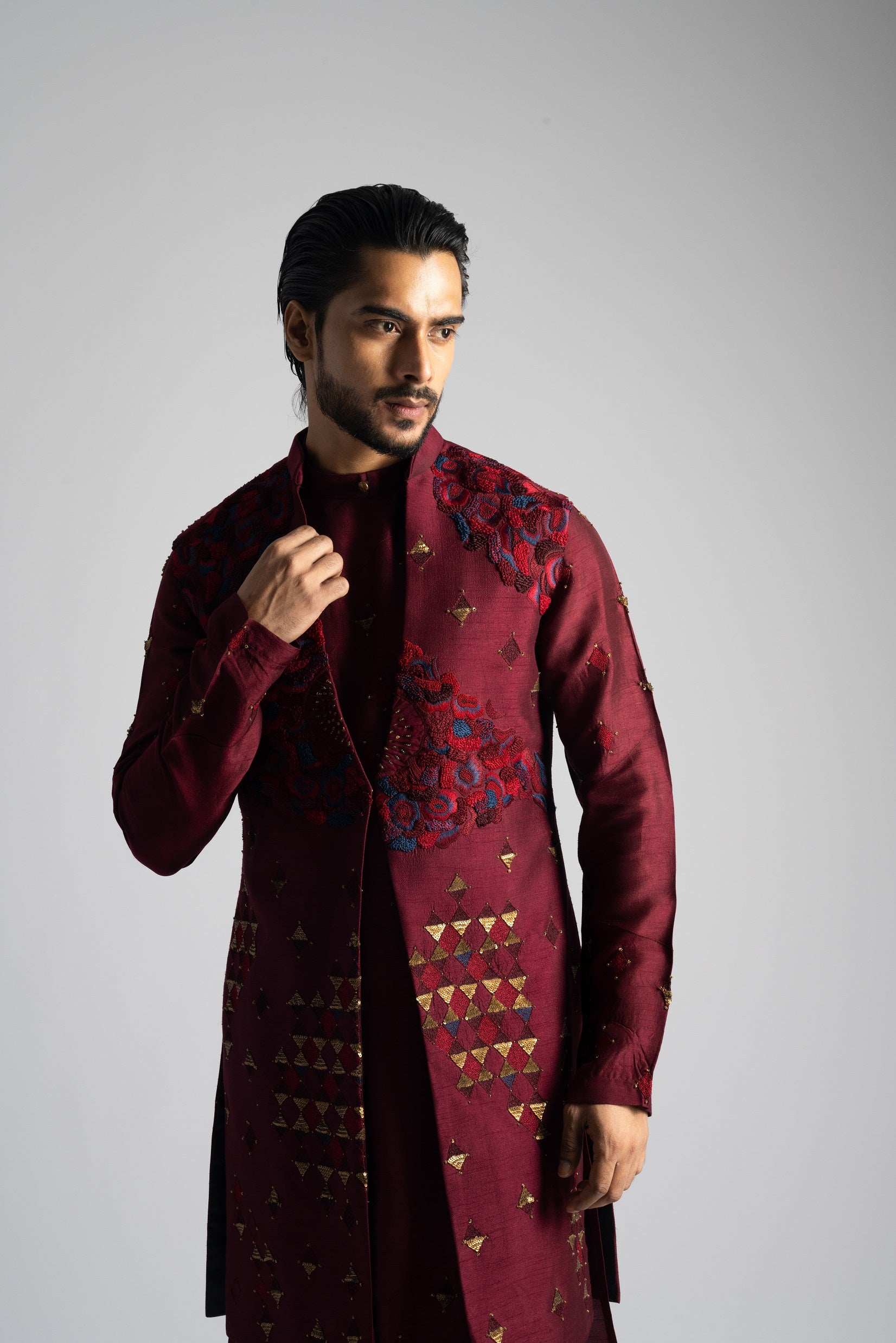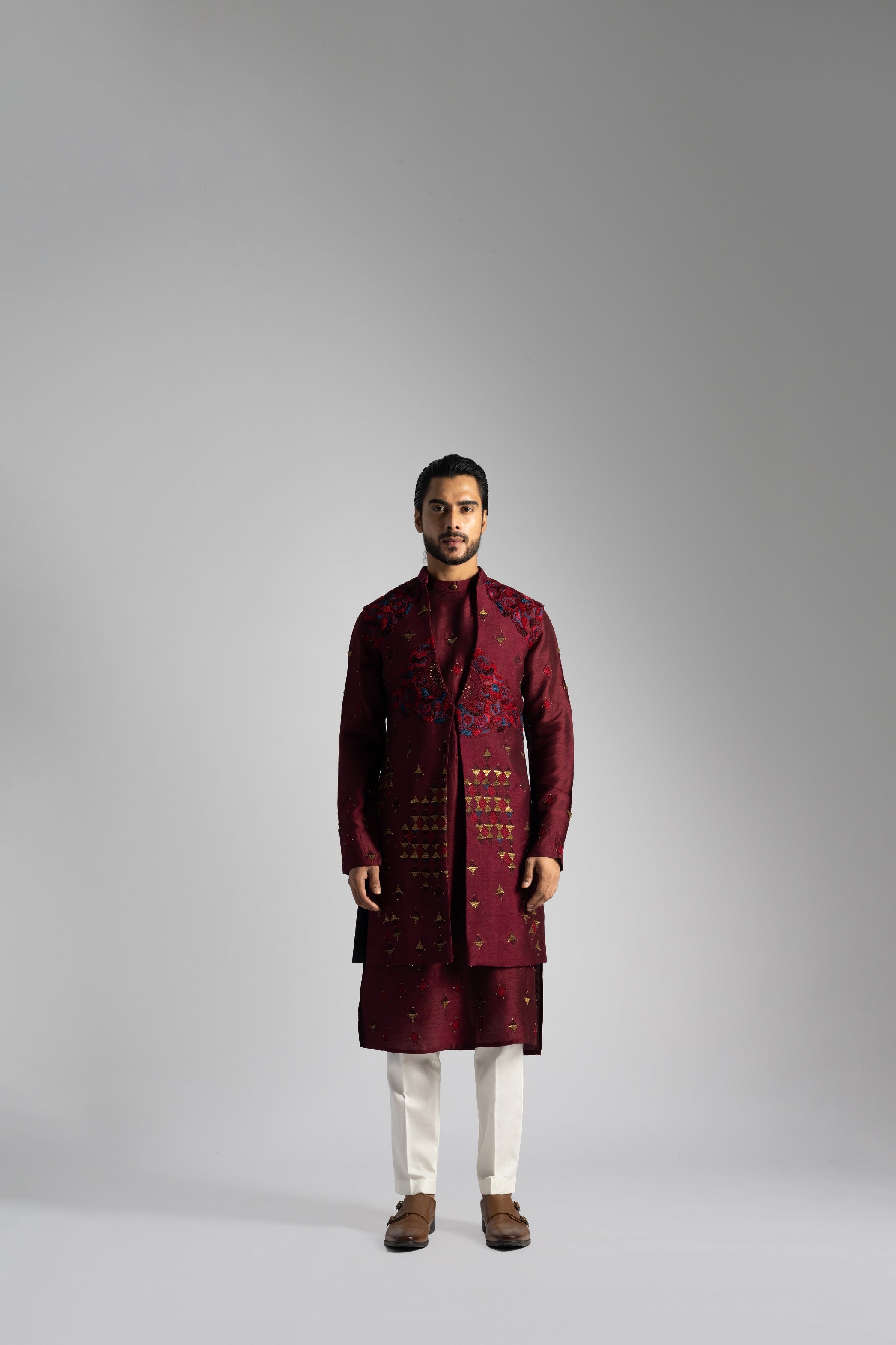 | DEEP RED LONG NEHRU JACKET WITH A BUTTON AT THE WAIST POINT PAIRED WITH A LONG KURTA HIGHLIGHTED WITH EMBROIDERY |