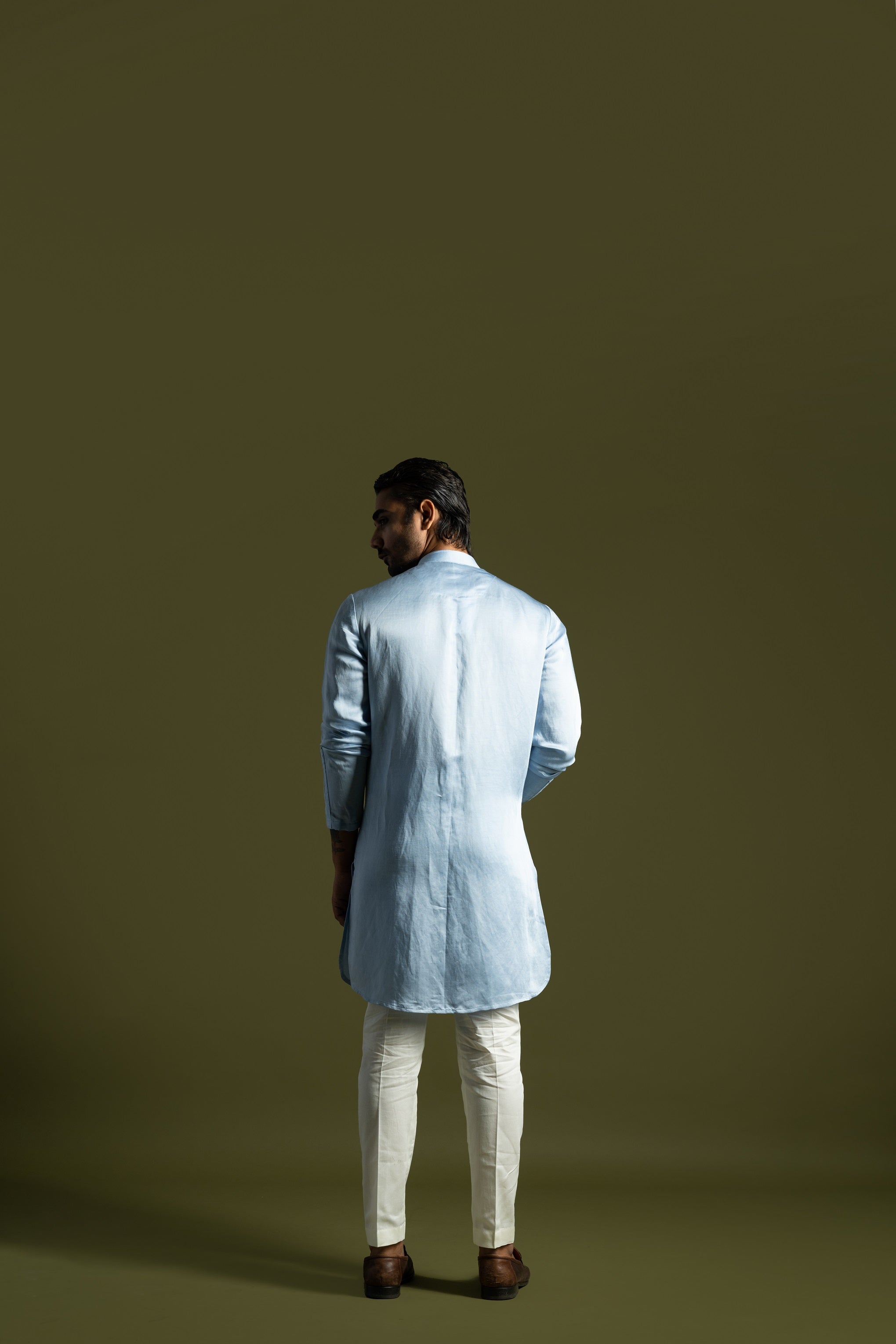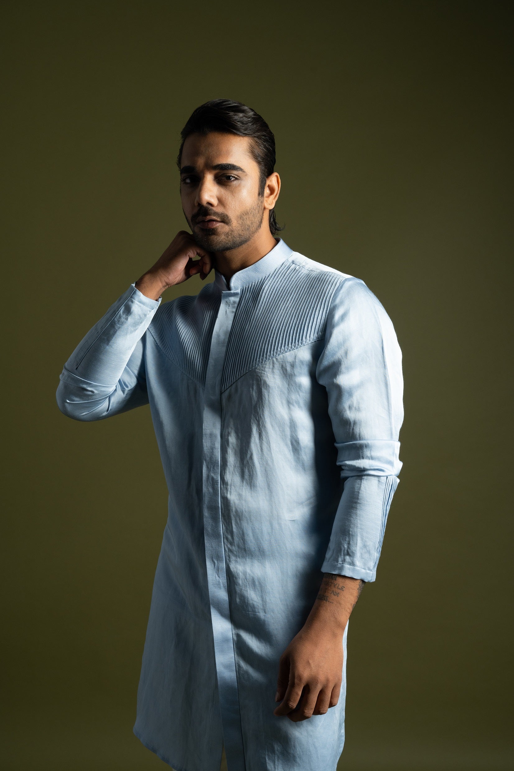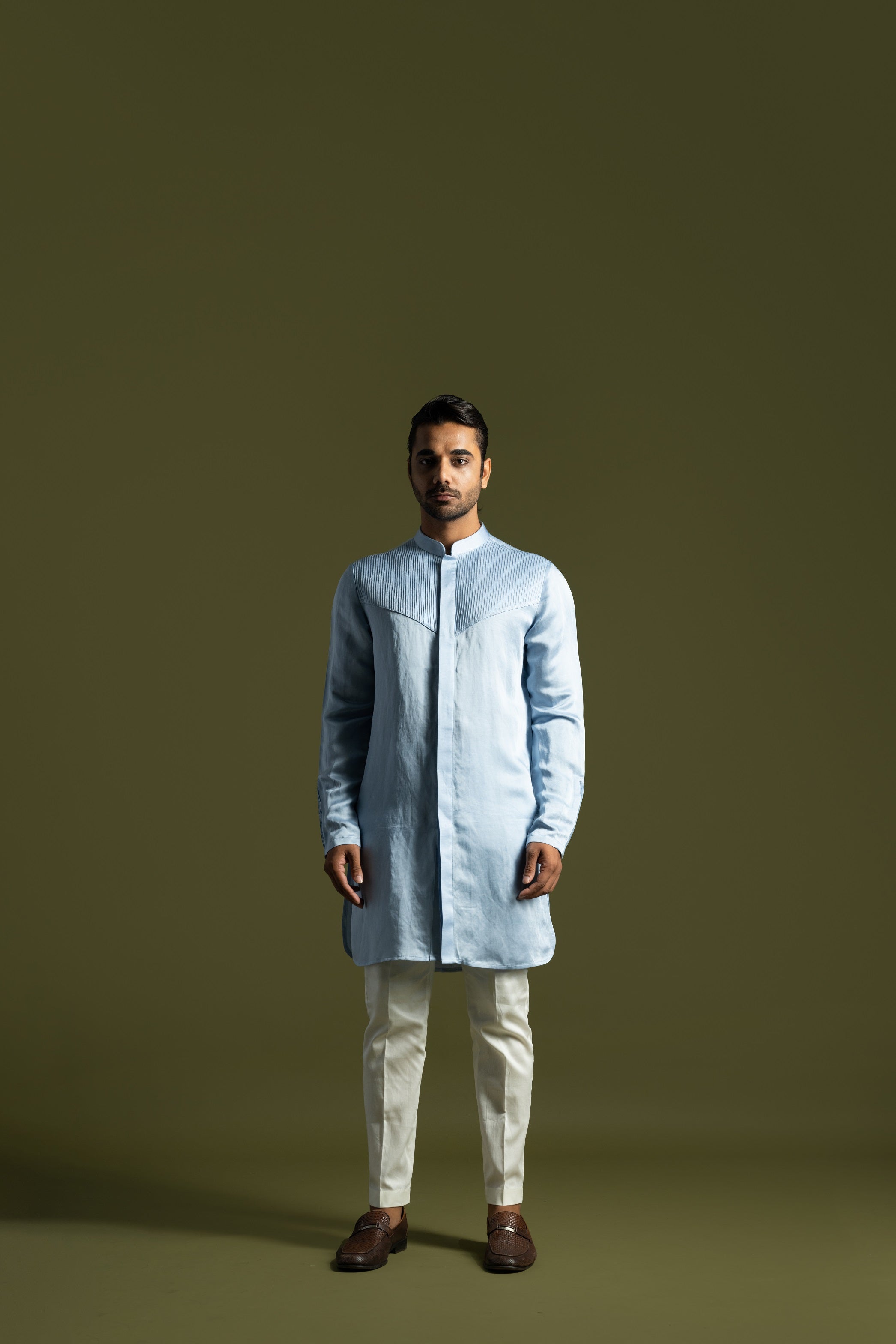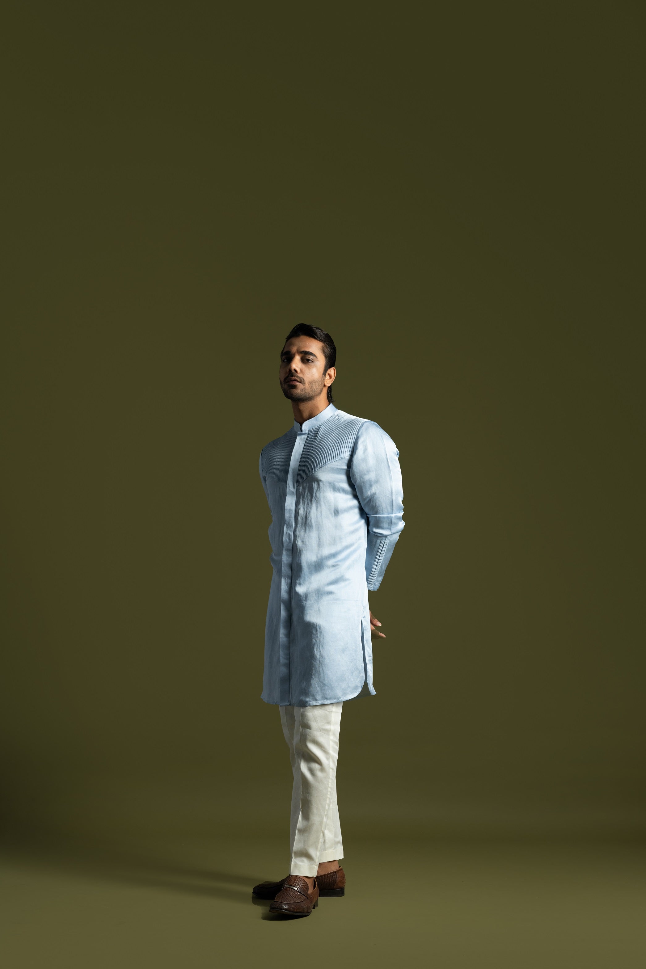 | ICE BLUE FRONT OPEN KURTA WITH PINTUCKS DETAILING FROM NECK TO CHEST PAIRED WITH SLIM FIT PANTS |
