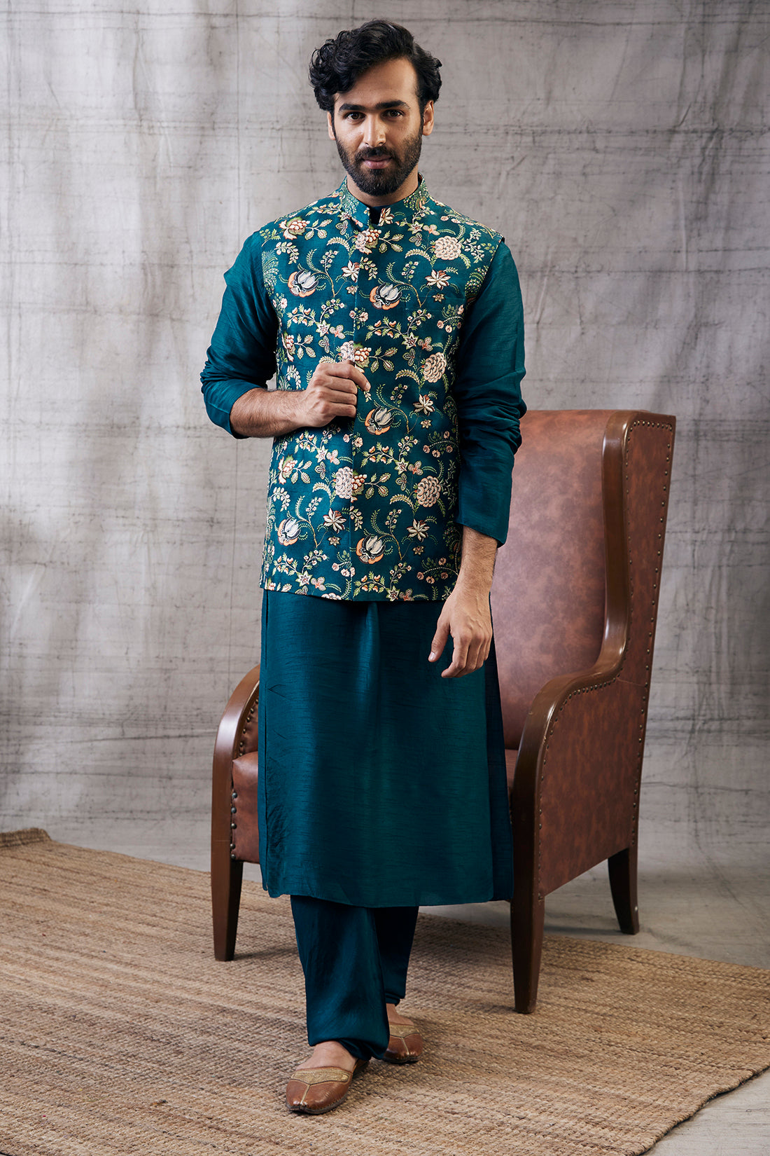 Refined, regal, and rooted in tradition — the Mehr Printed Bundi with Kurta Set is crafted from premium Malaysian silk in a rich, elegant green. This ensemble brings together classic charm and modern flair, making it a standout choice for festive and formal occasions. The set features a finely tailored kurta paired with a printed Bundi jacket that adds structure and depth to the look. The soft sheen of Malaysian silk enhances its luxurious appeal, while the coordinated bottoms complete the ensemble with effortless grace.