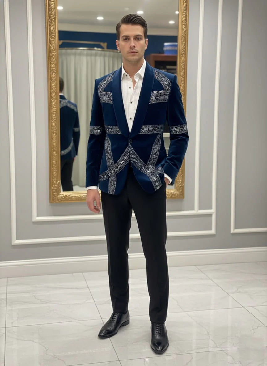 Make a bold statement with this elegant 2-piece teal tuxedo suit, crafted for modern men who appreciate luxury and style. Designed with a rich teal tone, this tuxedo features intricate embroidered detailing that adds a touch of sophistication and exclusivity. The structured blazer comes with a stylish shawl lapel and detailed patterns across the chest and sleeves, giving it a premium designer look. Paired with classic tailored trousers, this suit ensures a sharp, polished silhouette perfect for special occasions.