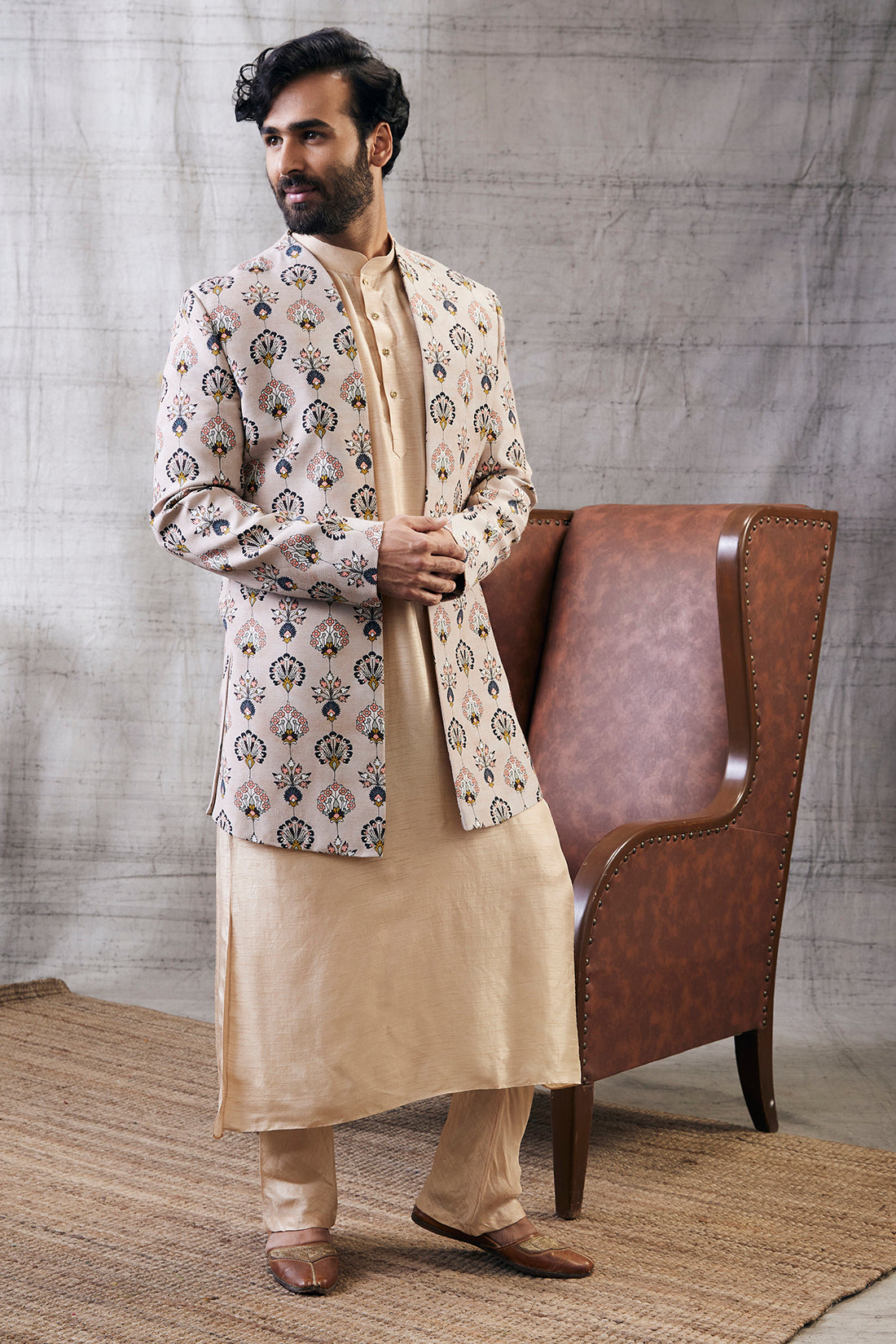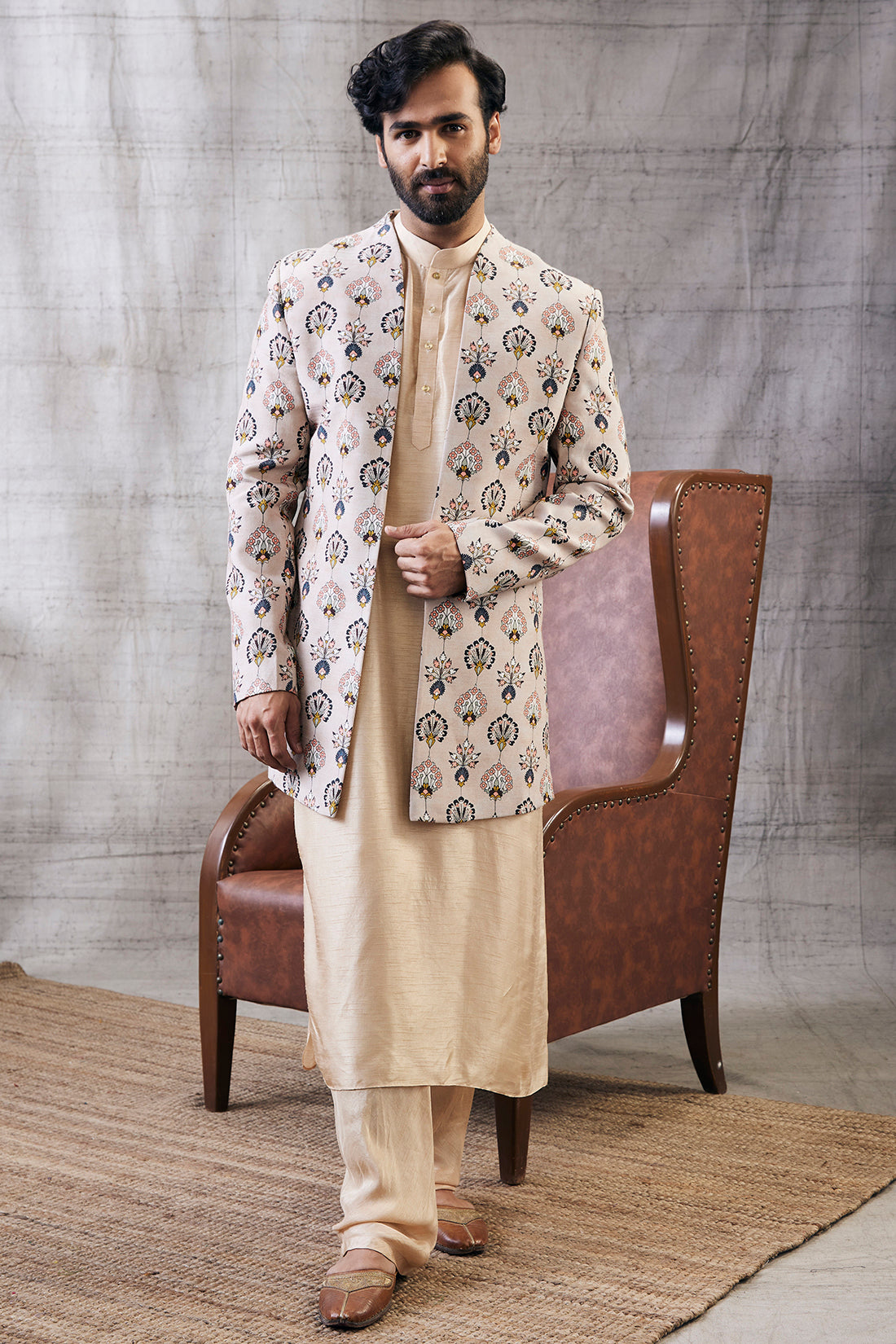 Elevate your ethnic wardrobe with timeless elegance. The Sarouk Printed Longline Jacket with Kurta Set in a refined beige hue is crafted from soft Muslin Slub fabric, offering a perfect blend of comfort and sophistication. The kurta features a straight-cut silhouette with minimal embroidery, while the statement longline jacket showcases intricate traditional prints that add depth and character to the ensemble. Ideal for festive gatherings, formal events, or cultural celebrations, this set embodies understated luxury with a contemporary twist. Pair it with tapered pants and statement footwear to complete the look.