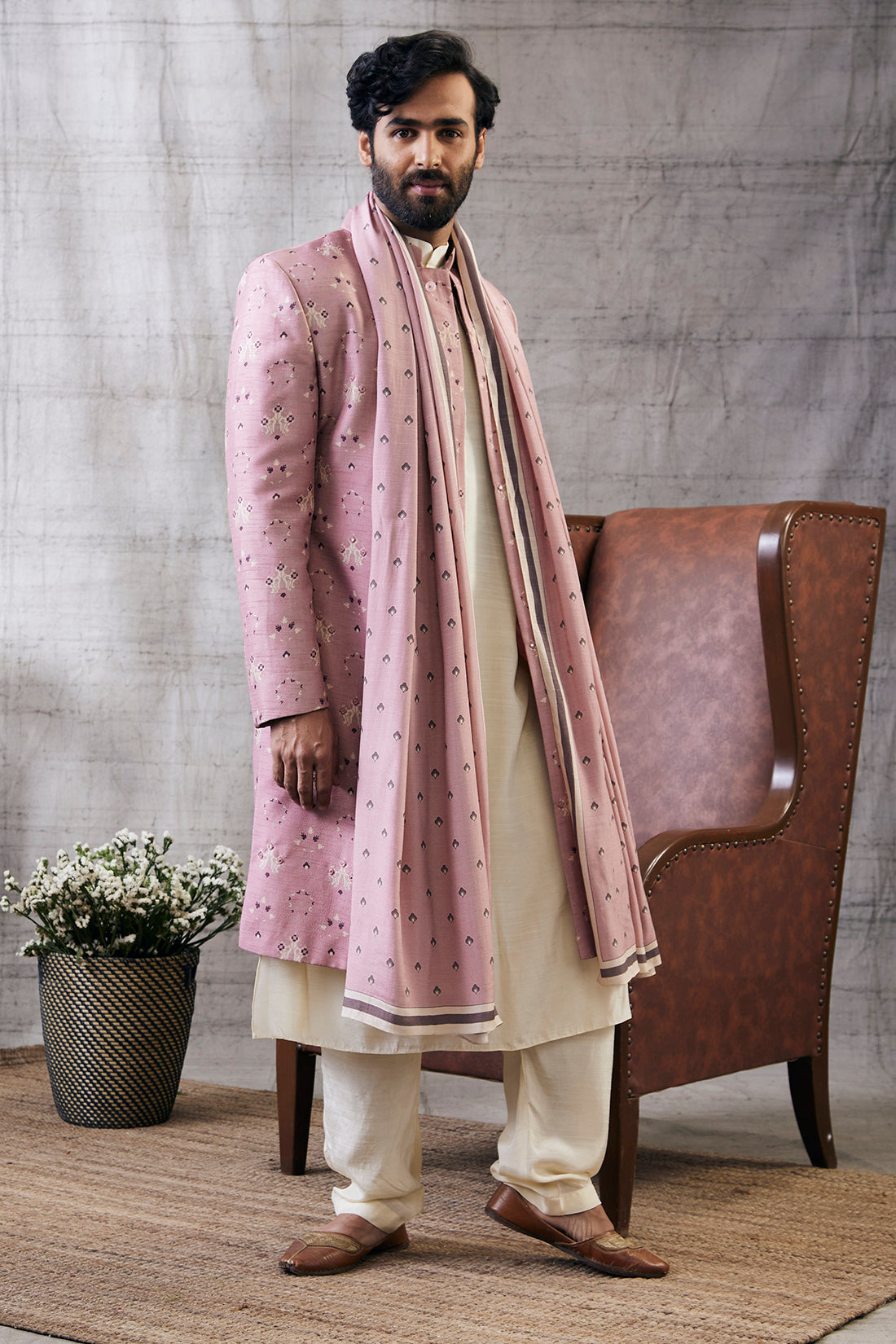 The Sarouk Printed Sherwani Set in a soft pink hue is crafted from premium cotton silk, offering a luxurious feel with breathable comfort. The sherwani features intricate traditional prints, a tailored fit, and subtle detailing that adds a touch of regal charm. Paired with matching bottoms, this ensemble is perfect for weddings, festive occasions, or formal celebrations. Designed for the modern man who values tradition with style, this sherwani set brings together heritage and elegance in one stunning outfit.