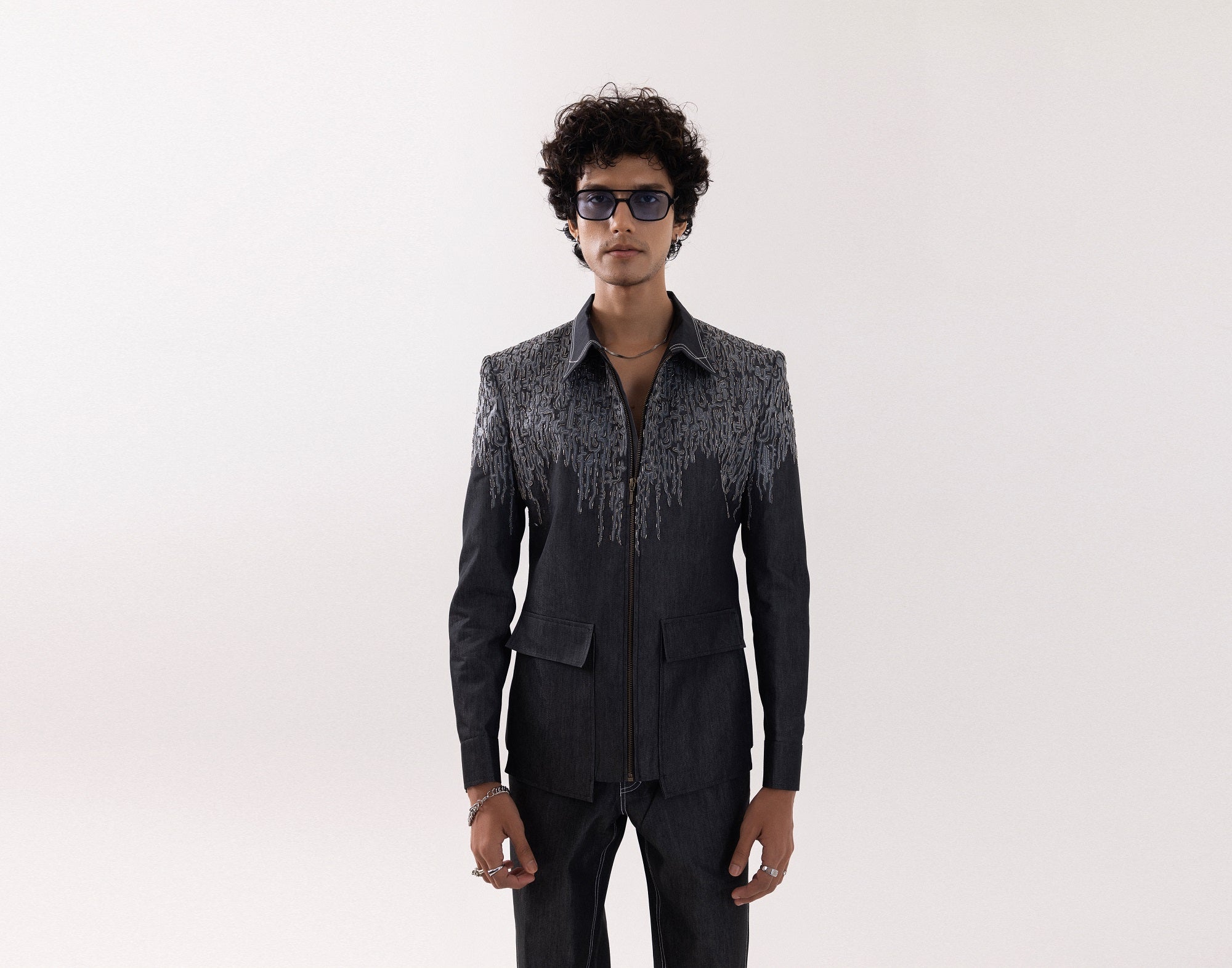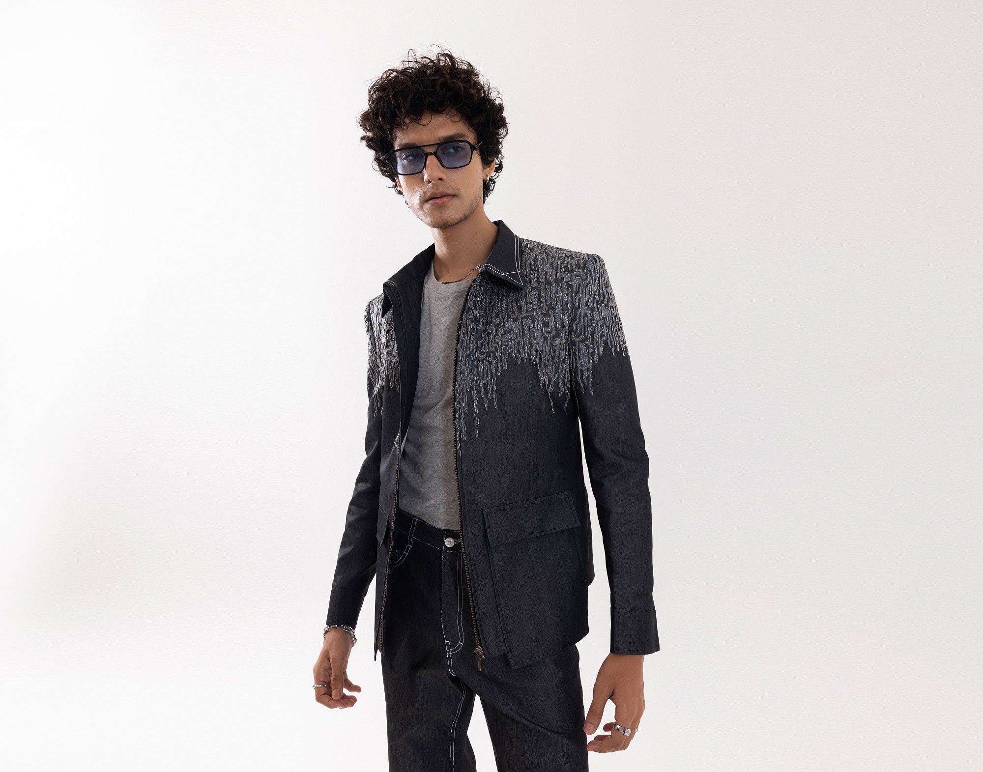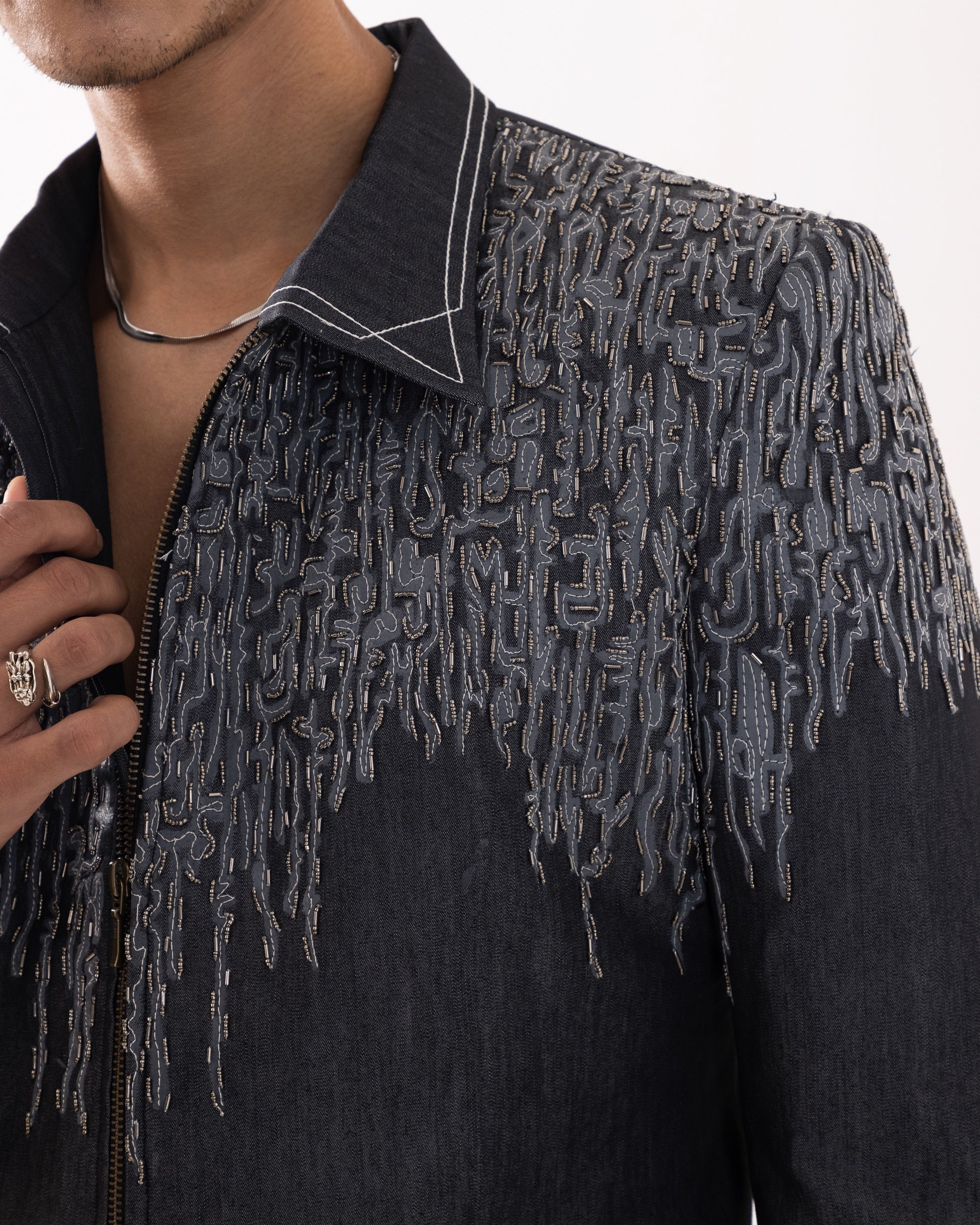 A grey denim bomber jacket stands out with its unique blend of hand-painted detailing in lighter grey tones, creating a soft, artistic contrast against the rugged fabric. The surface is further enhanced with precise machine stitch lines that add structure and depth, while subtle grey bead embellishments introduce a refined texture and understated sparkle. Designed with functional patch pockets, this piece merges utility with creativity—offering a modern, wearable canvas of craftsmanship and style.