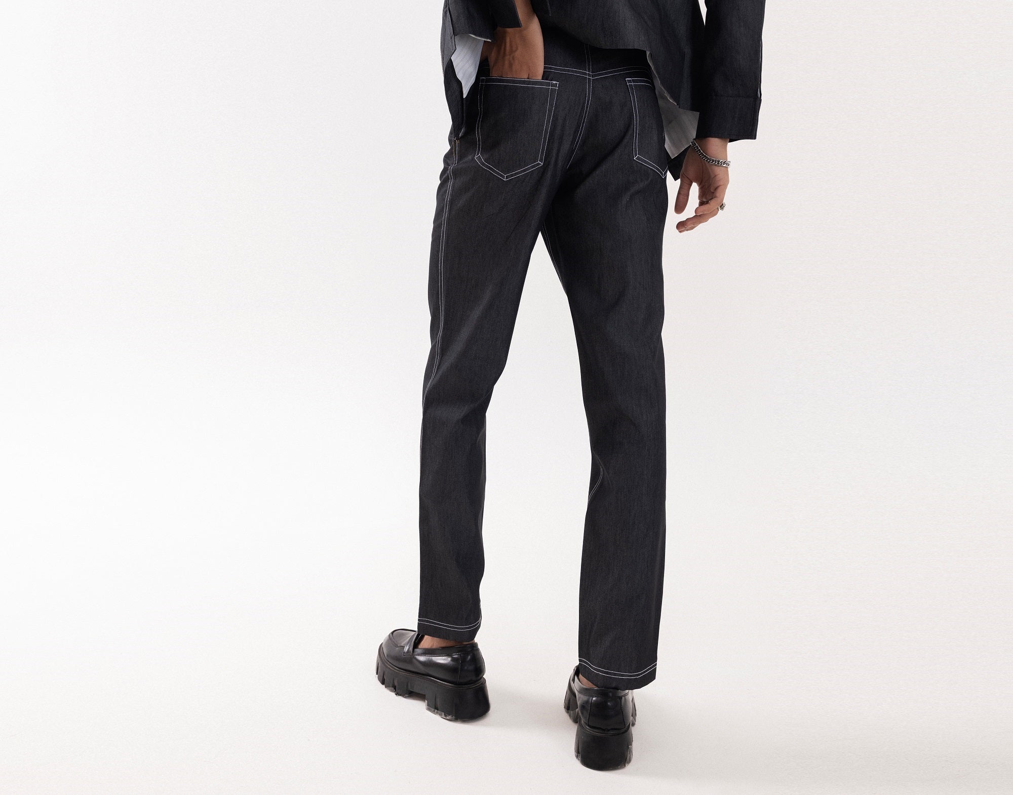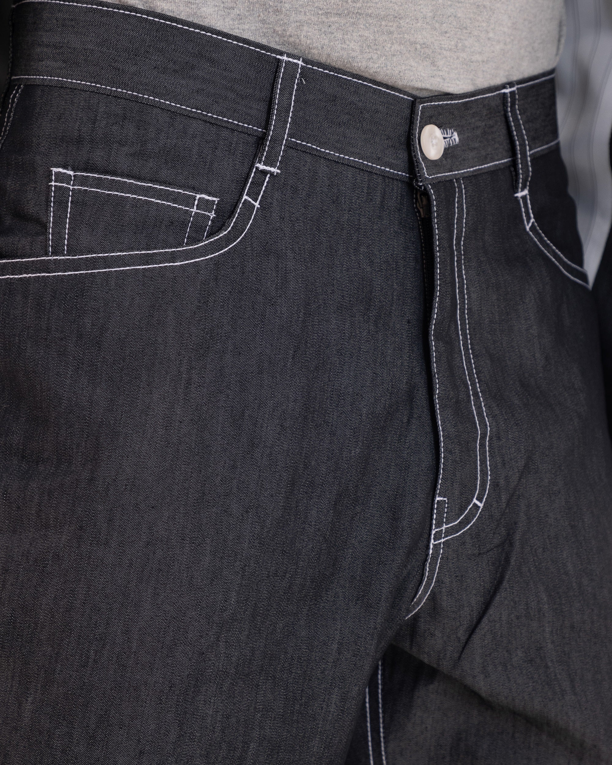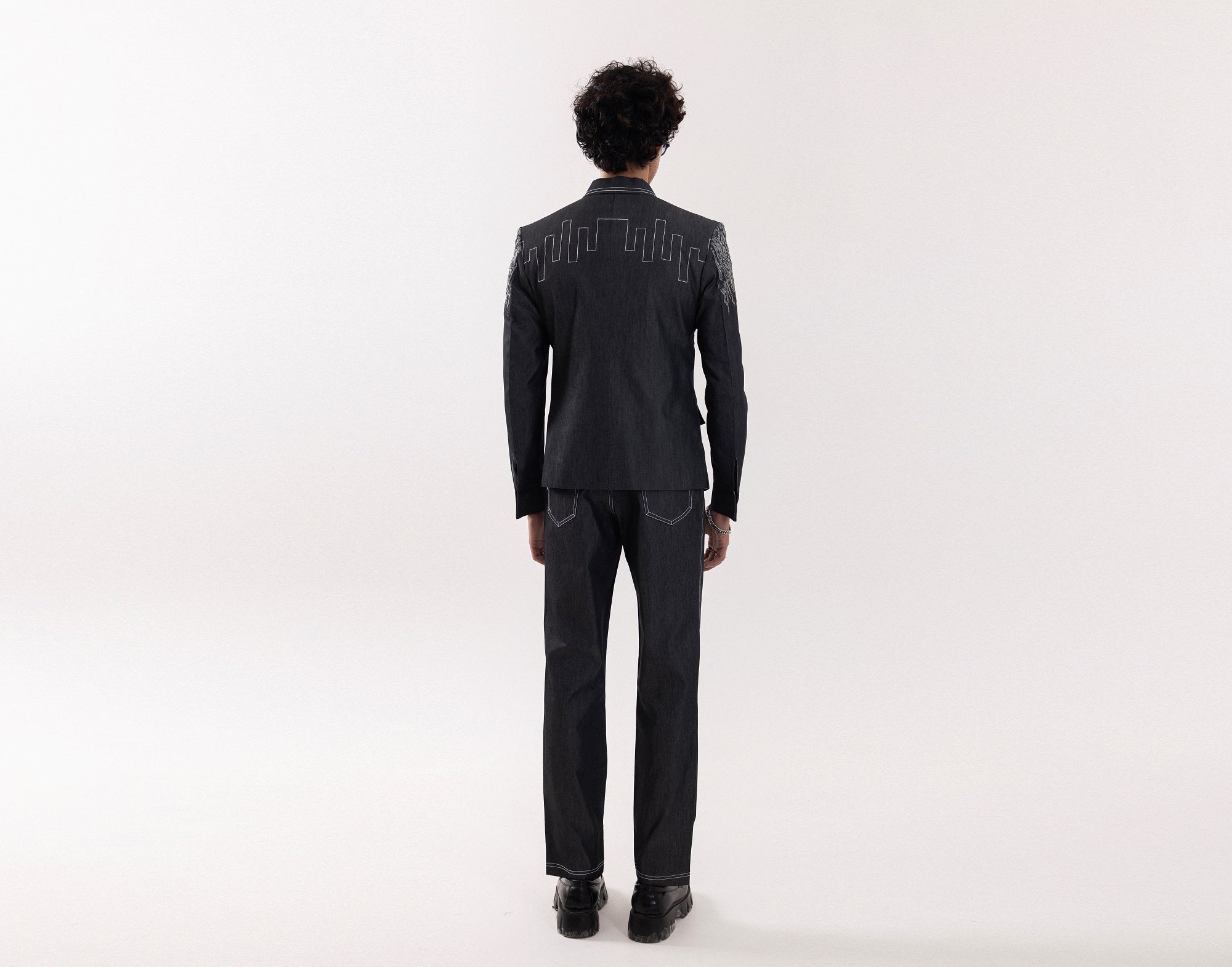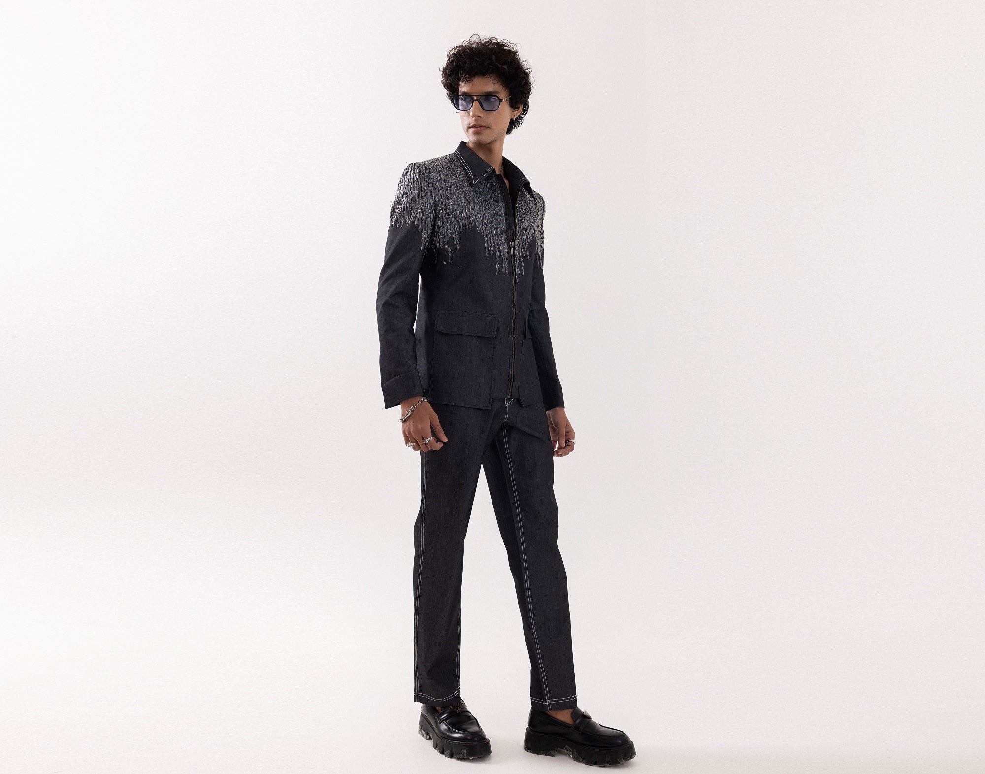 A grey denim bomber jacket stands out with its unique blend of hand-painted detailing in lighter grey tones, creating a soft, artistic contrast against the rugged fabric. The surface is further enhanced with precise machine stitch lines that add structure and depth, while subtle grey bead embellishments introduce a refined texture and understated sparkle. Designed with functional patch pockets, this piece merges utility with creativity—offering a modern, wearable canvas of craftsmanship and style.