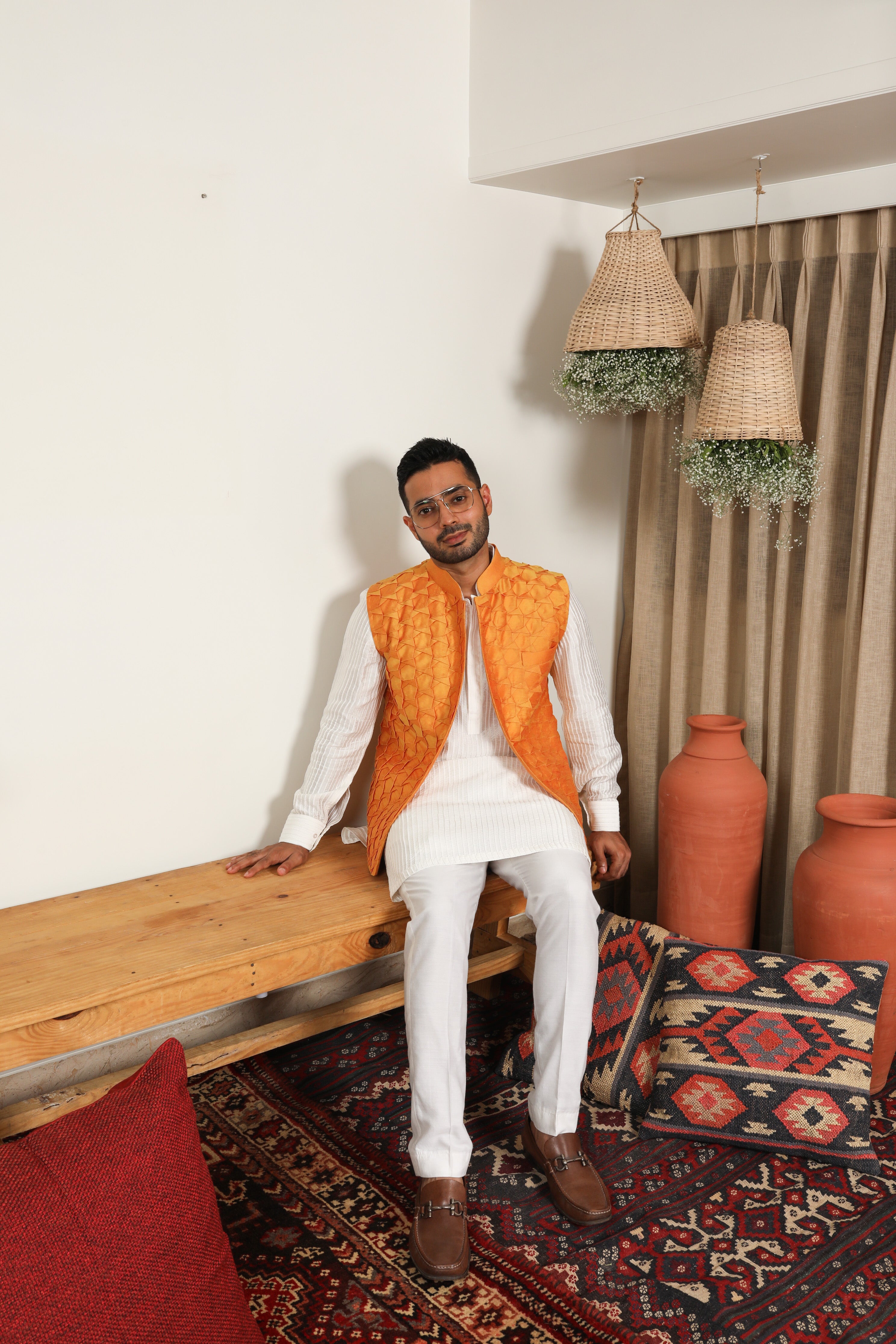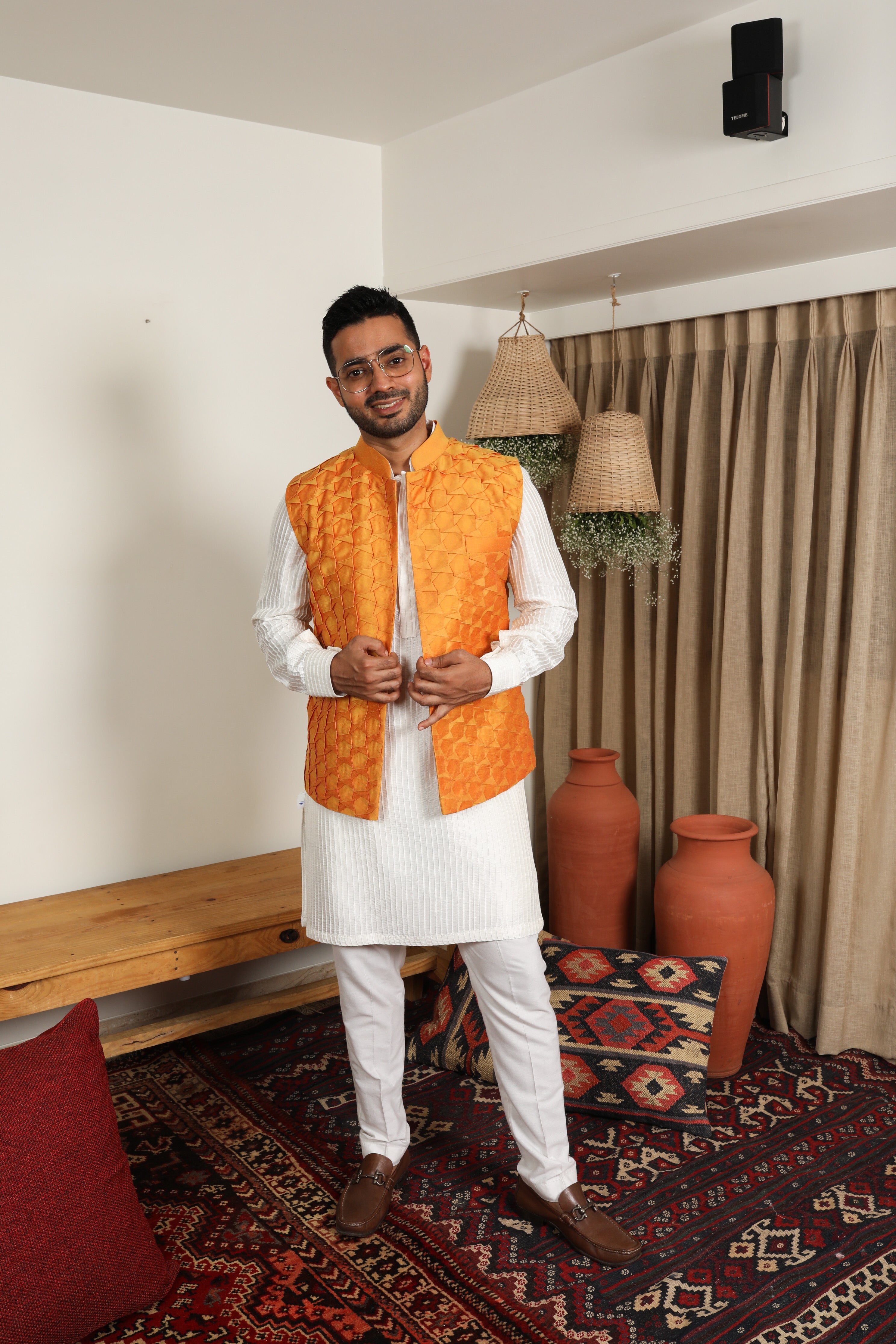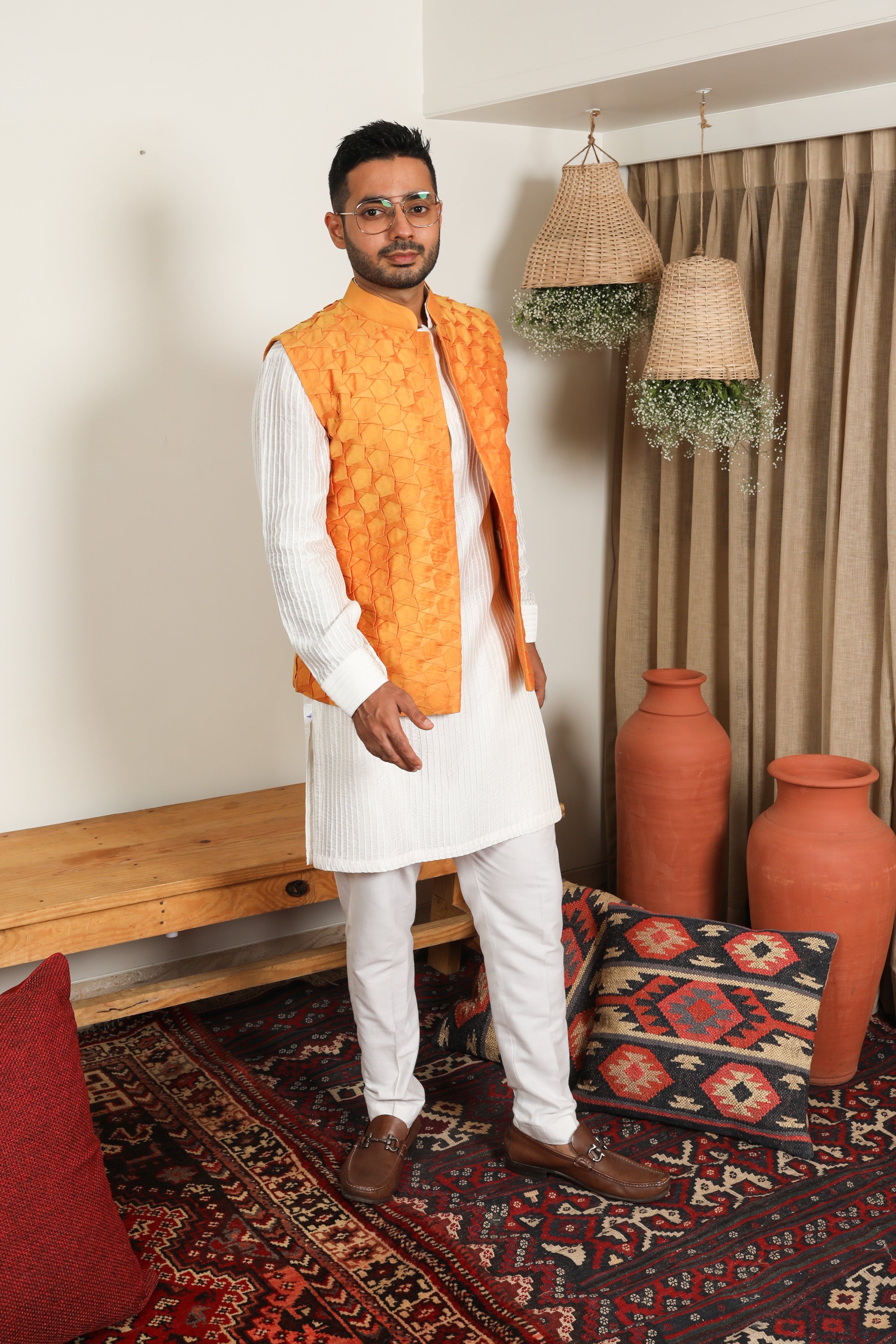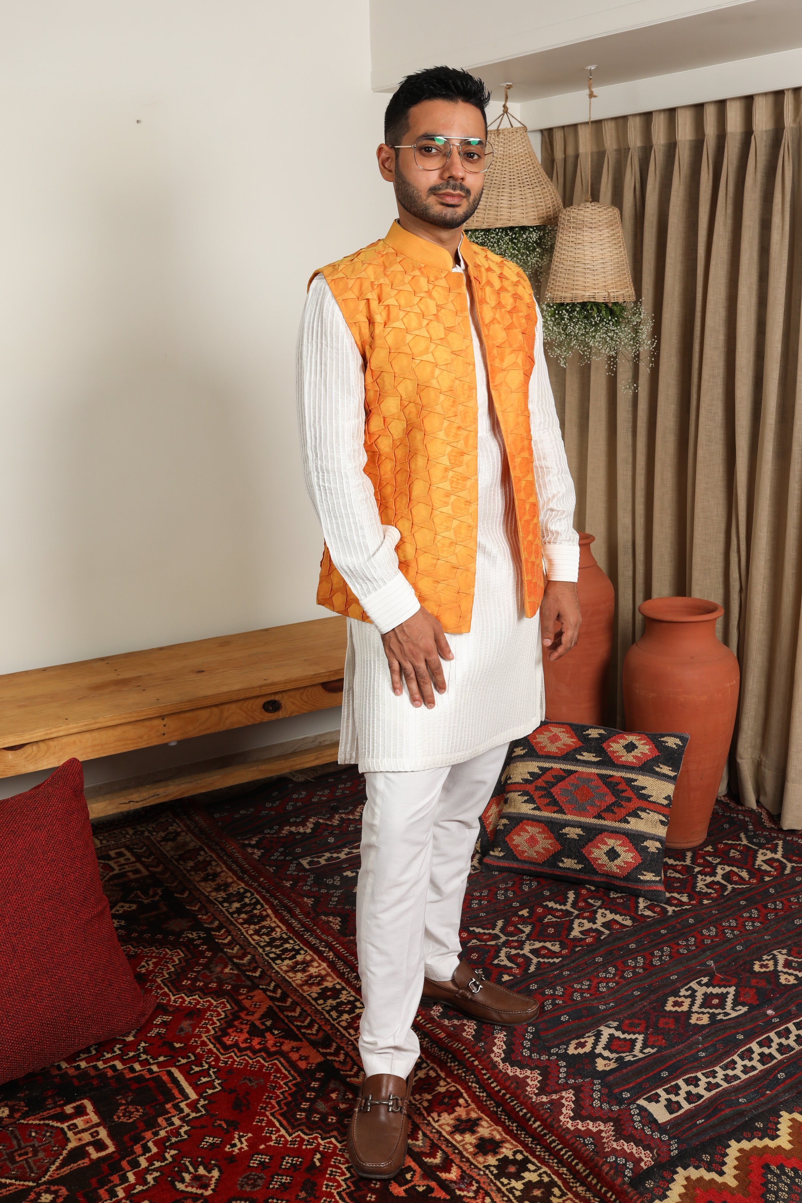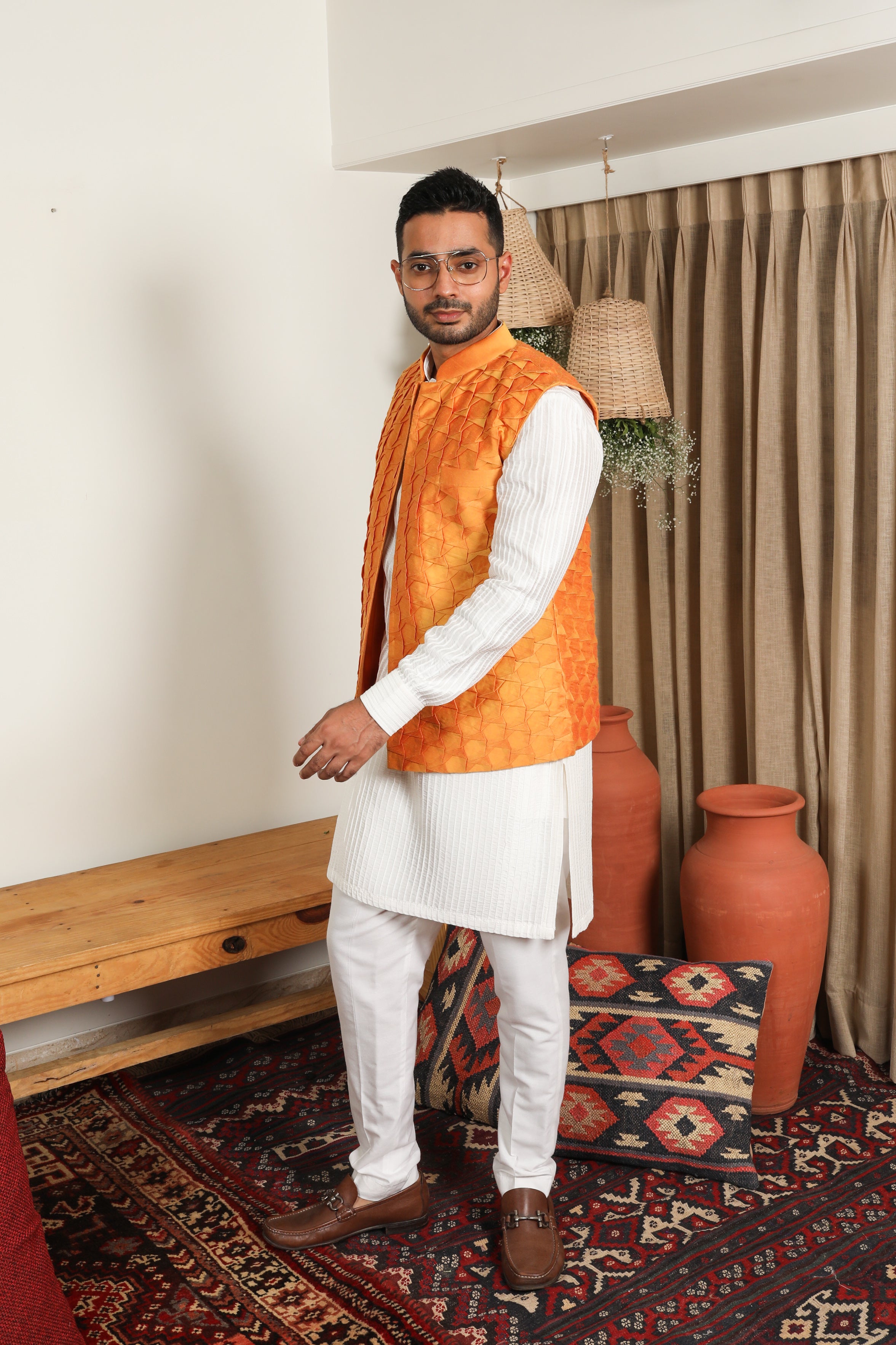 Pair the tangerine Nehru jacket with a classic white or cream kurta and matching churidar pants for a timeless and elegant look
