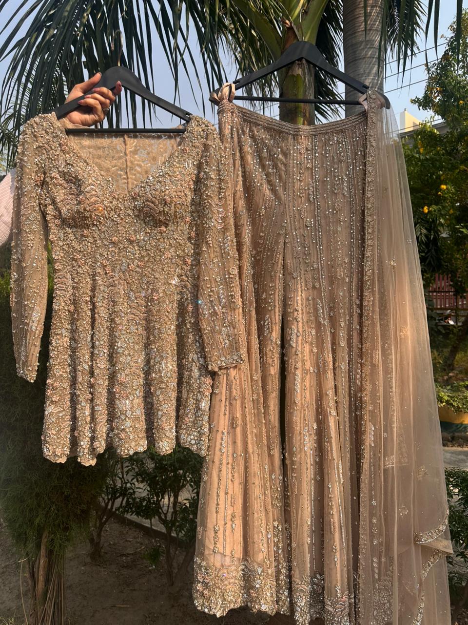 A Luxurious Hand-Crafted Ensemble Designed To Make Every Occasion Unforgettable. The Outfit Features A Fully Hand-Embellished Net Top Adorned With Intricate Sequin, Cutdana Pearl, And Crystal Work That Creates A Stunning All-Over Shimmer Effect. Paired With A Matching Heavily Embellished Lehenga And A Delicately Sprinkled Dupatta, This Piece Radiates Timeless Elegance And Regal Charm. Perfect For Weddings, Receptions, Engagement Events, Or Any Grand Celebration, This Outfit Effortlessly Blends Traditional Craftsmanship With Modern Sophistication.