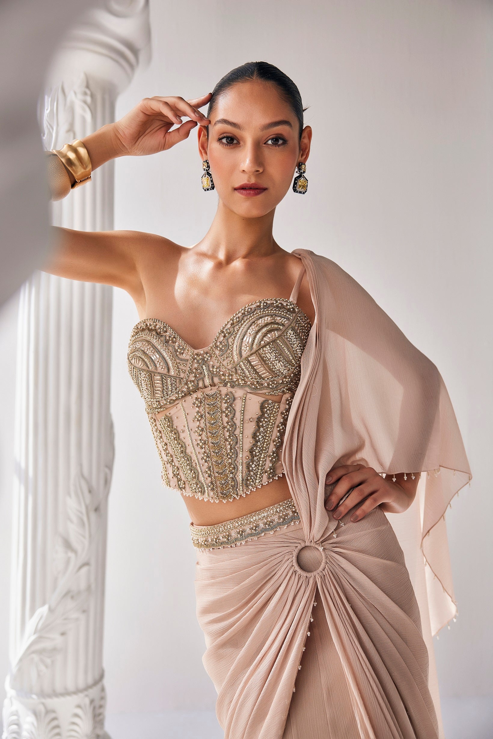 | Draped saree crafted from metallic shimmer chiffon fabric. Adorned with intricate embroidery details, the corset enhances the elegance of this ensemble, while an embroidered belt adds a touch of opulence. |