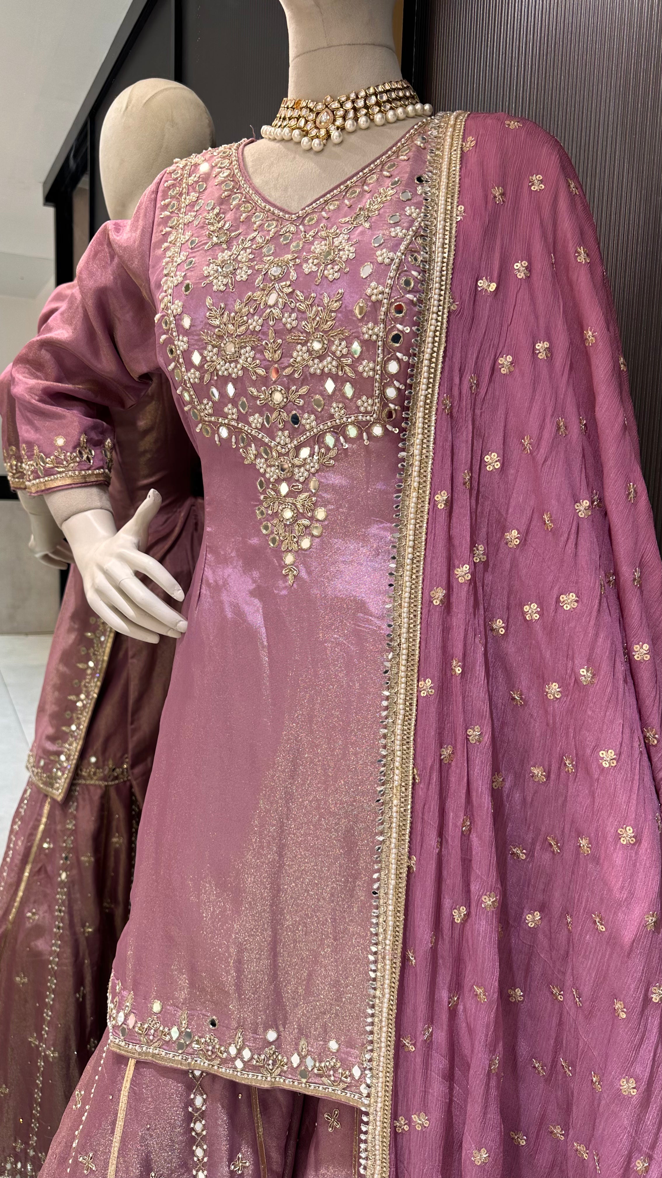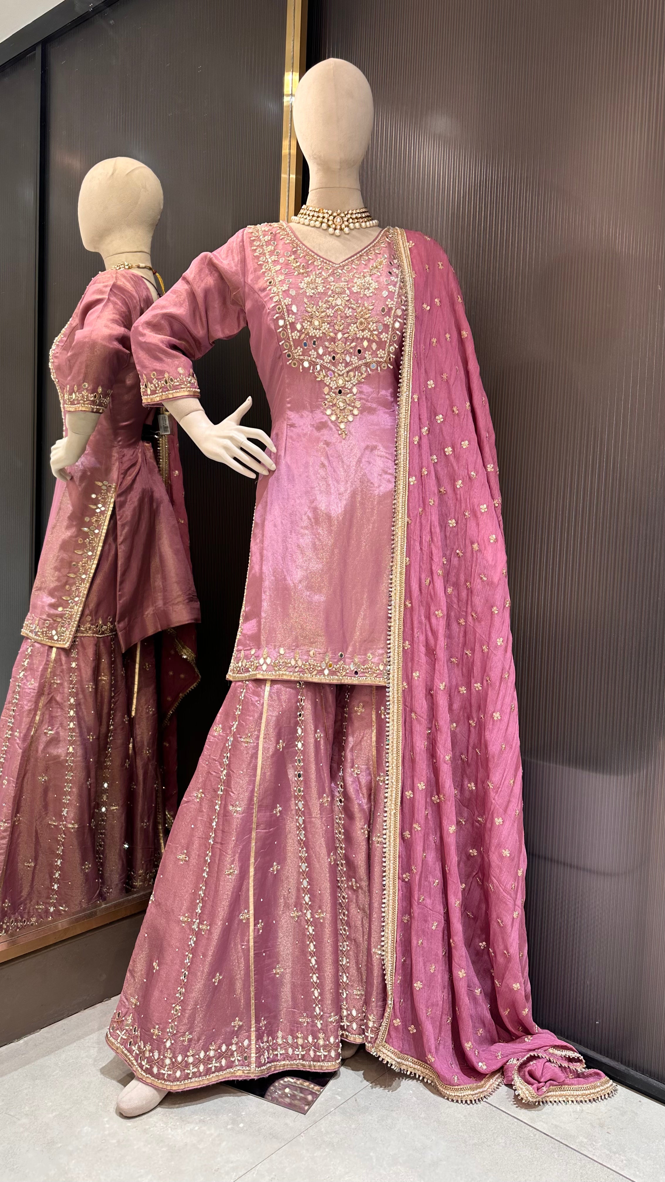 Dusty rose pink silk sharara suit.