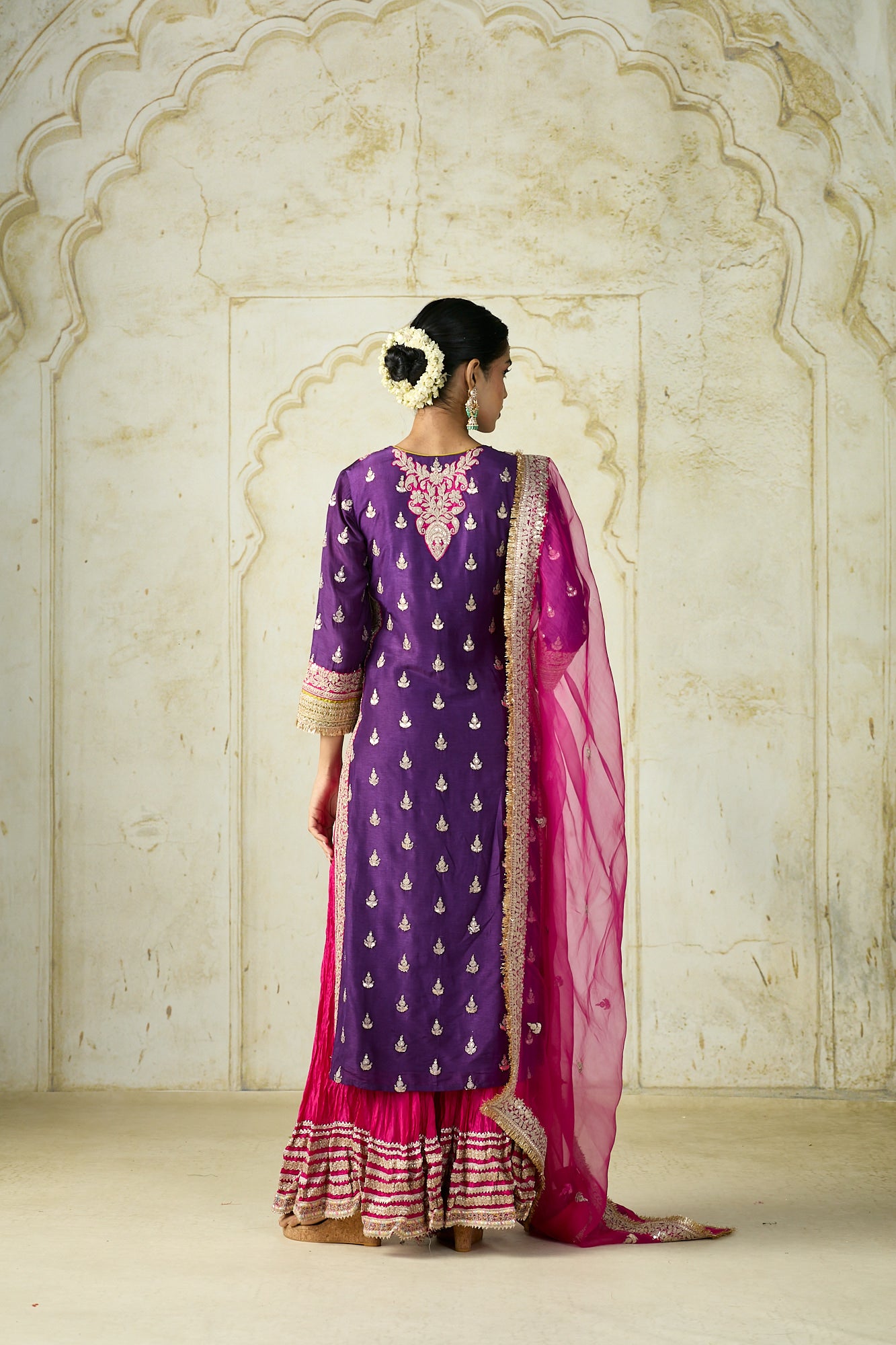The Straight-Cut Kurta Features Intricate Work Along The Neckline And Cuffs, With Scattered Motifs Enhancing Its Regal Appeal. Paired With A Striking Contrast Crinkled Sahara The Ensemble Balances Bold Color Play With Traditional Charm. The Sheer Matching Dupatta, Finished With An Embellished Border And Delicate Motifs, Completes The Look With Grace.