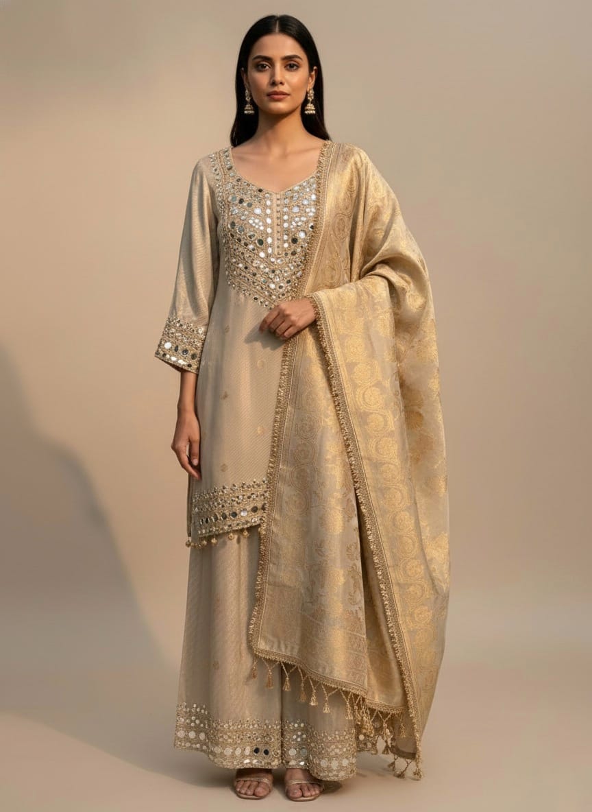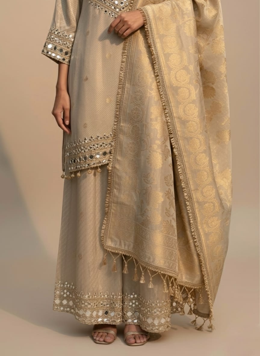 Elevate Your Festive And Formal Wardrobe With This Shimmer Silk Mirror-Work Ensemble, Crafted In A Luxurious Champagne-Gold Silk Fabric That Exudes Timeless Elegance. The Long Shirt Features Intricate Hand-Embellished Mirror Work, Delicately Patterned Along The Neckline, Sleeves, And Hem For A Radiant, Eye-Catching Look. Subtle Woven Motifs Throughout The Fabric Add Depth And Richness To The Design. Paired With Wide-Leg Trousers In Matching Shimmer Silk, The Outfit Maintains A Graceful Flow And Sophisticated Finish. The Matching Dupatta Is Adorned With An Elegant Gold-Thread Embroidered Border, Completing The Ensemble With Regal Finesse. Perfect For Weddings, Festive Gatherings, And Special Occasions, This Outfit Blends Traditional Craftsmanship With Contemporary Style.