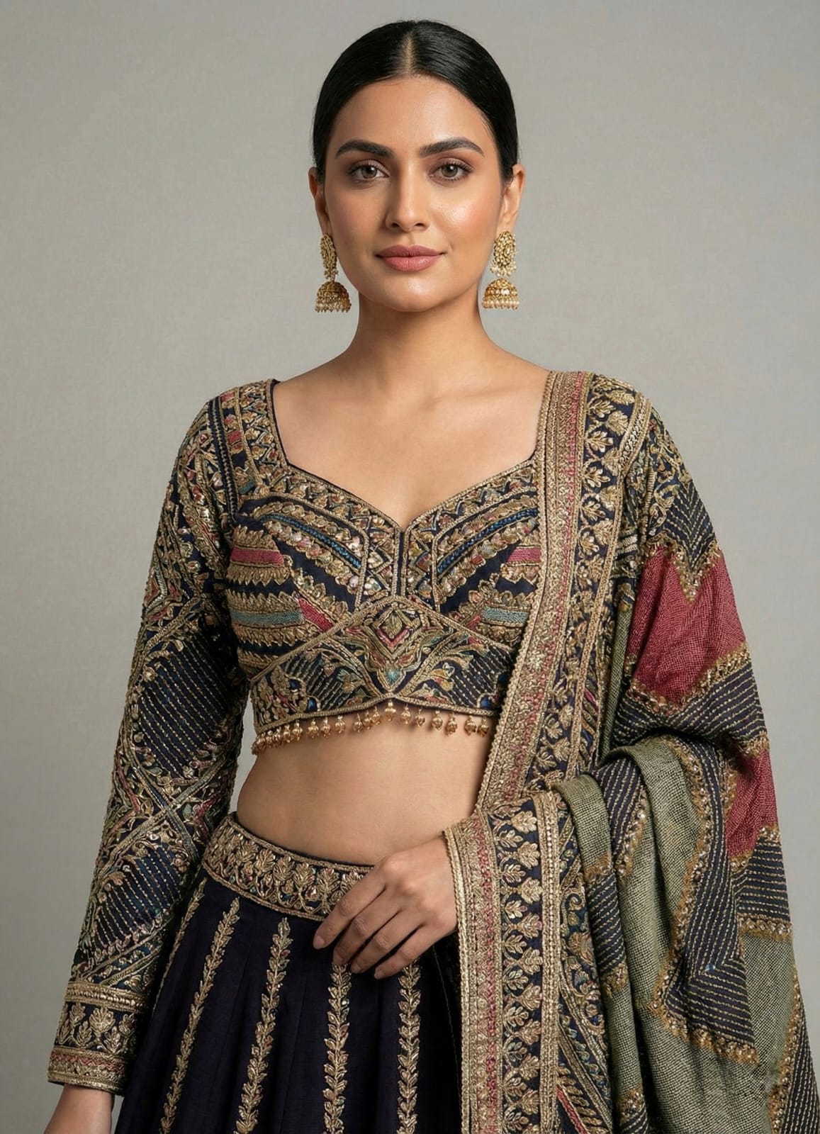 Elevate your festive and wedding wardrobe with this luxurious pure crepe lehenga set, designed to blend tradition with contemporary elegance. Crafted from premium pure crepe fabric, this outfit features digital printing enhanced with intricate hand-highlighting, giving it a rich, regal finish. The lehenga comes in a deep black base adorned with gold embroidered motifs and ornate borders. The matching blouse is beautifully coordinated with multicolored digital print accents. The dupatta completes the look with its striped multicolor pattern—including shades of olive green, deep red, and black—framed by elegant embroidered borders. Perfect for weddings, receptions, festivals, or any grand celebration, this ensemble exudes sophistication and timeless charm.