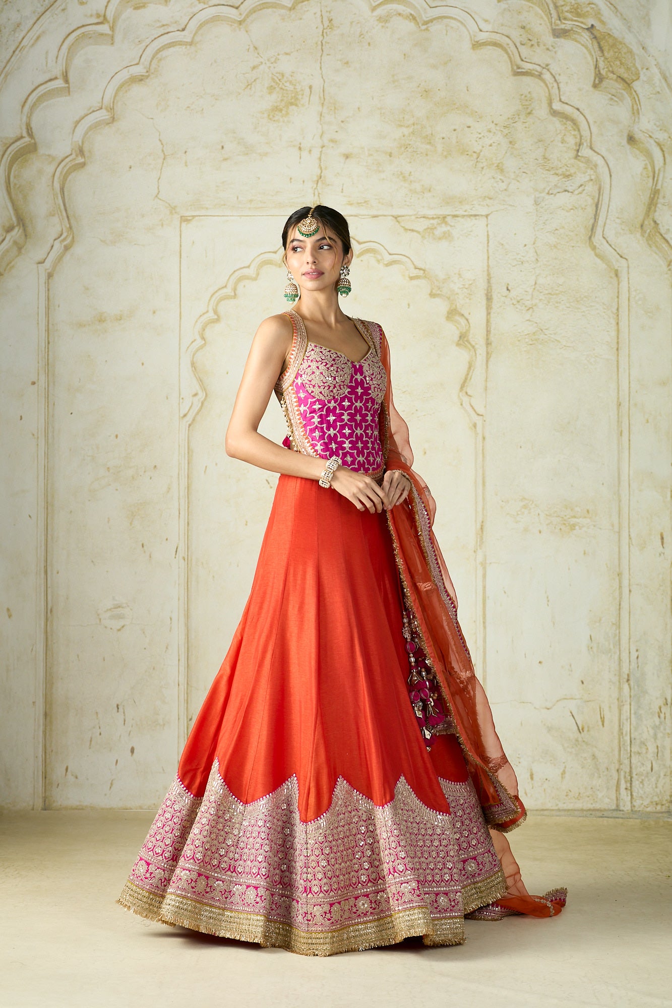 The Blouse Features Intricate Work, Styled With Delicate Straps For A Modern Touch. The Flowing Lehenga Is Designed With A Scalloped Edge And A Heavily Embellished Border creating A Rich, Regal Finish. Completing The Ensemble Is A Sheer Matching Dupatta, Highlighted With Dainty Motifs And A Broad Embellished Border That Enhances Its Elegance.