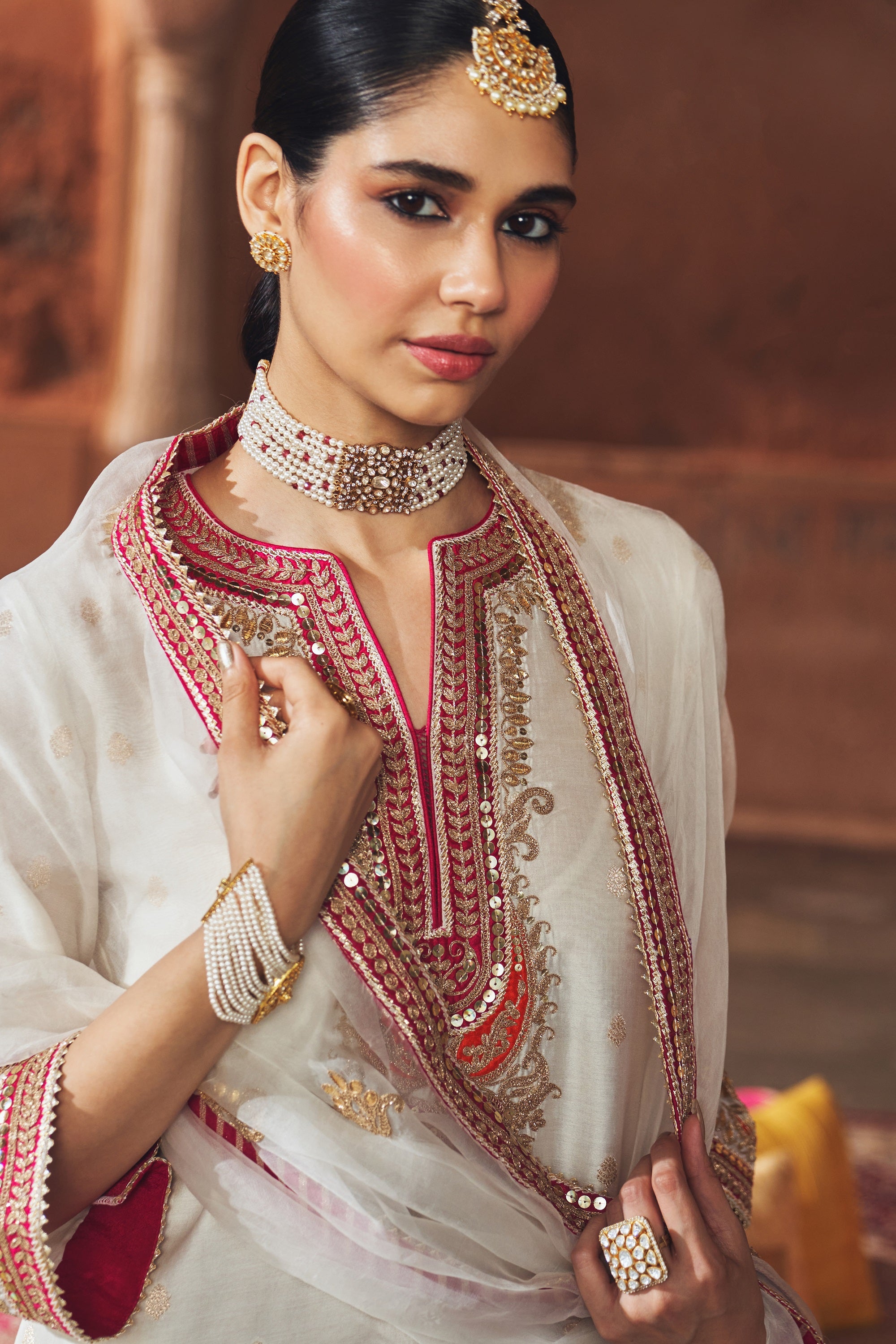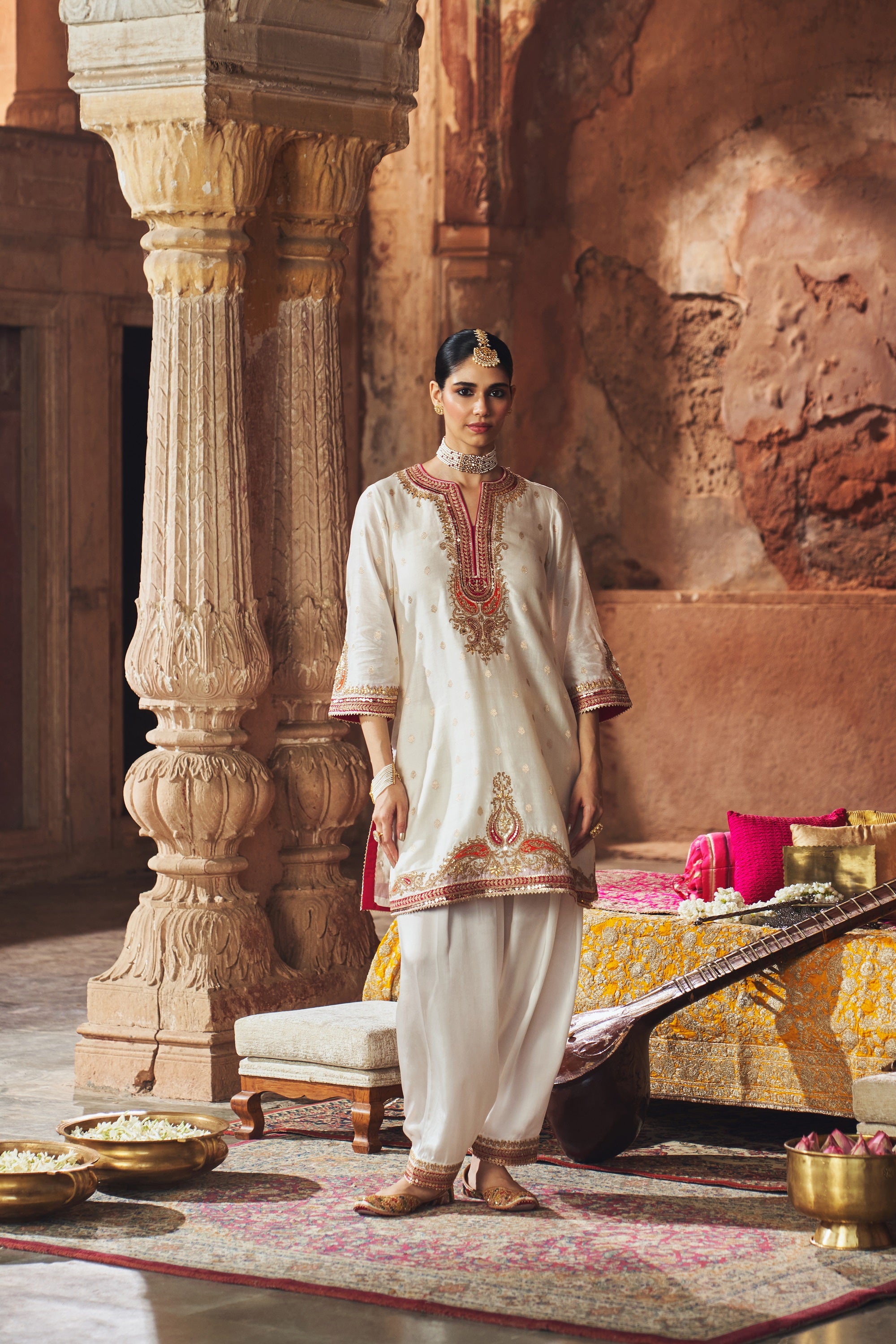 This Elegant Short A-Line Kurta Crafted In Pure Silk Banarasi, Paired With A Traditional Dogri Salwar And A Silk Organza Dupatta. The Kurta Features A Zero Neckline With Slit And Elegant Bell Sleeves. The Ensemble Is Adorned With Intricate Kashmiri Tilla And Gota Patti Embroidery, Highlighted With Pearls And Sequins, And Finished With Delicate Gota Detailing.