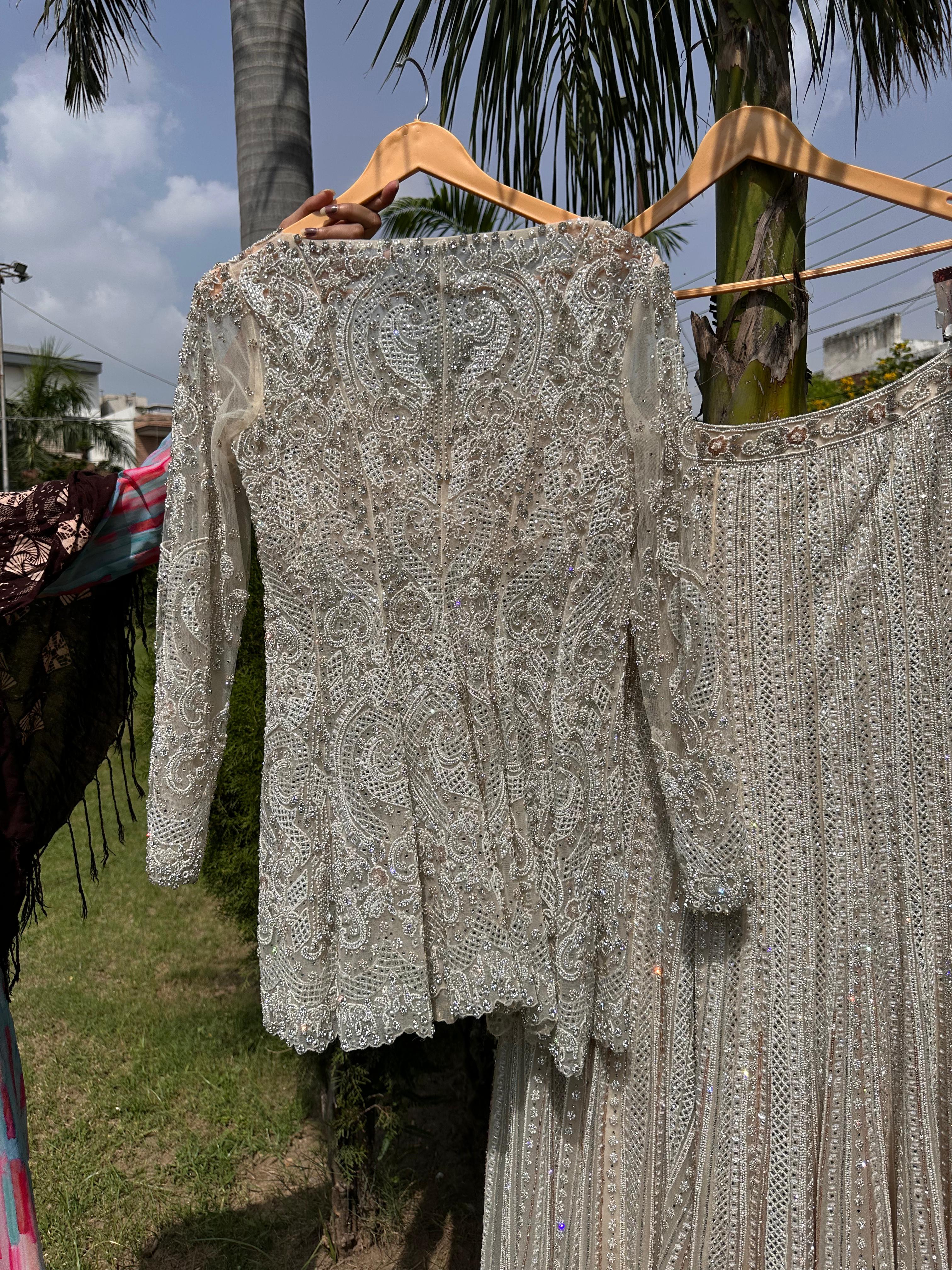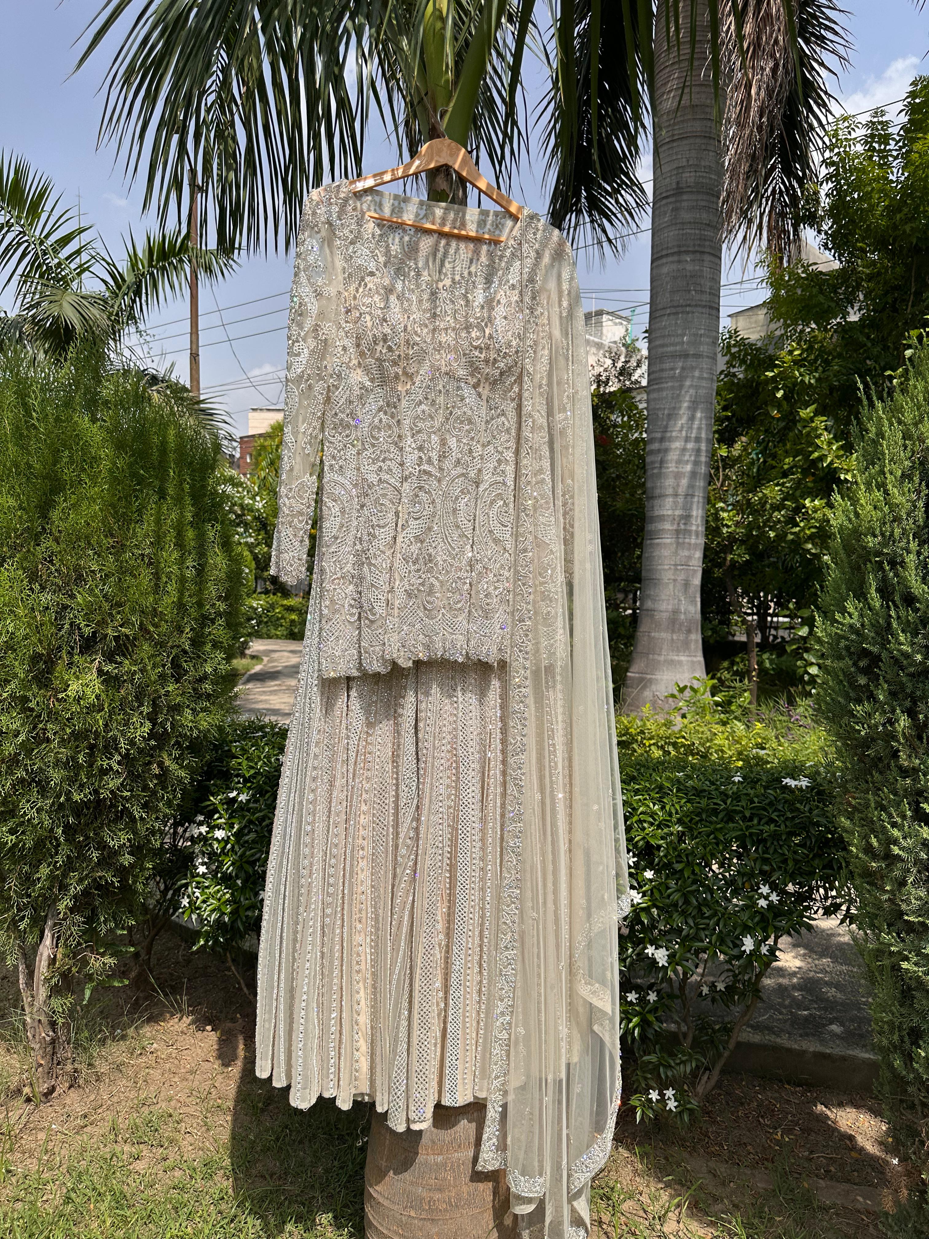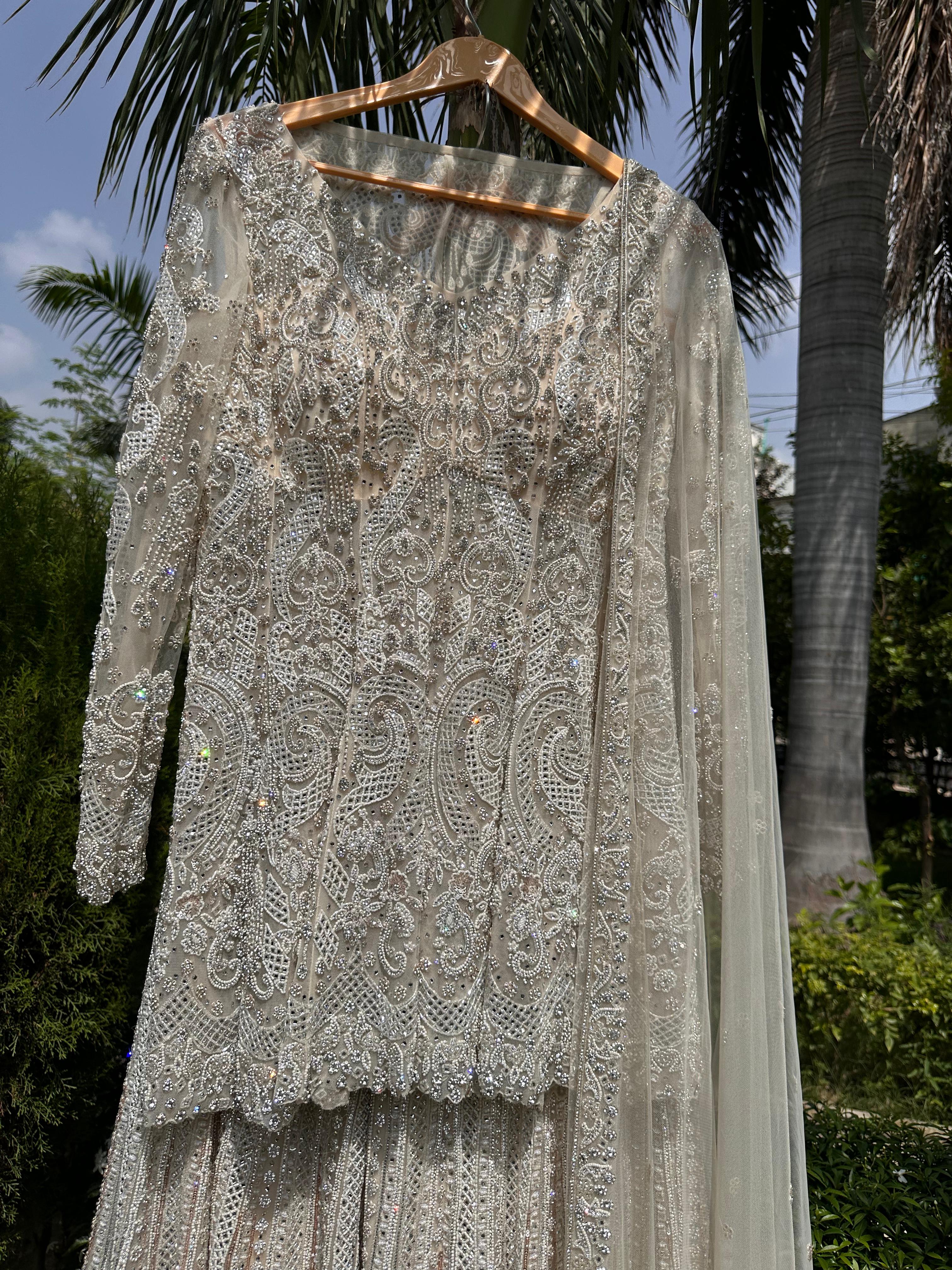 Grace Meets Grandeur In This Exquisite Milky White Sharara Suit, Crafted From Delicate Net And Adorned With Intricate Hand Embroidery. The Ensemble Features A Beautifully Tailored Peplum-Style Top, Designed To Enhance Your Silhouette With A Flattering, Modern Twist On Traditional Elegance. The Top Showcases Fine Threadwork And Embellishments Across The Bodice And Sleeves, Adding Subtle Shimmer And Texture. Paired With A Flowy, Layered Sharara Bottom, The Look Exudes Timeless Charm And Effortless Grace. A Matching Net Dupatta With Embroidered Borders Completes The Ensemble, Making It Perfect For Festive Occasions, Weddings, Or Elegant Evening Gatherings.