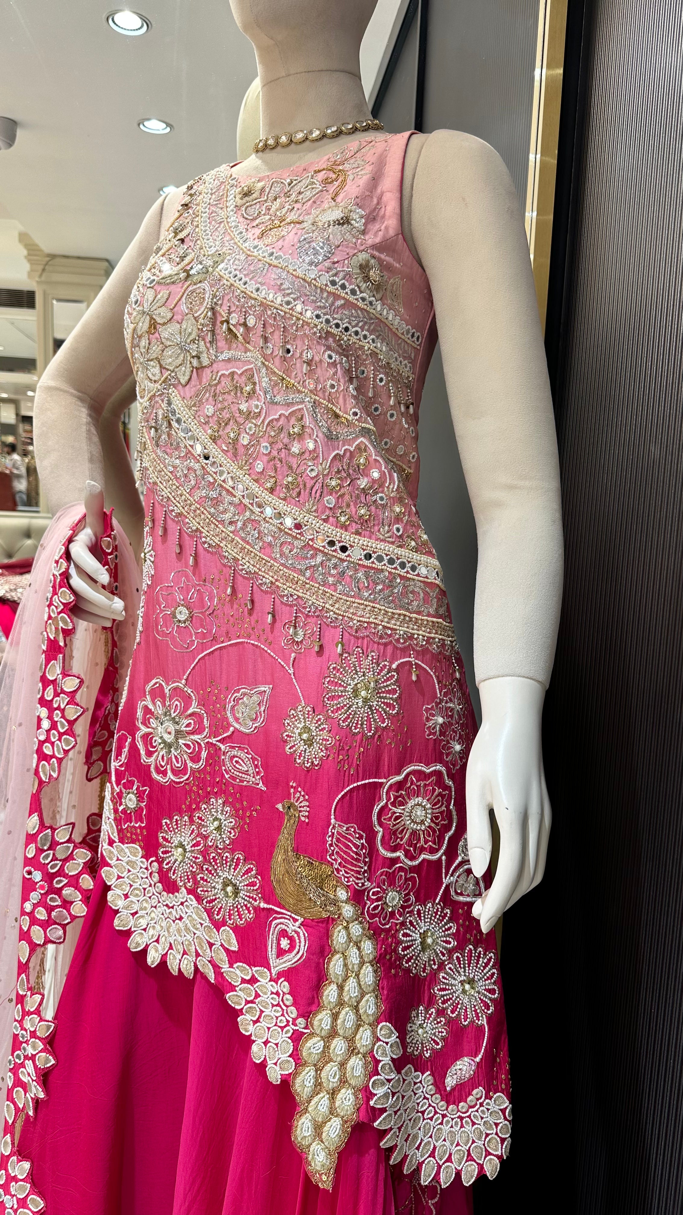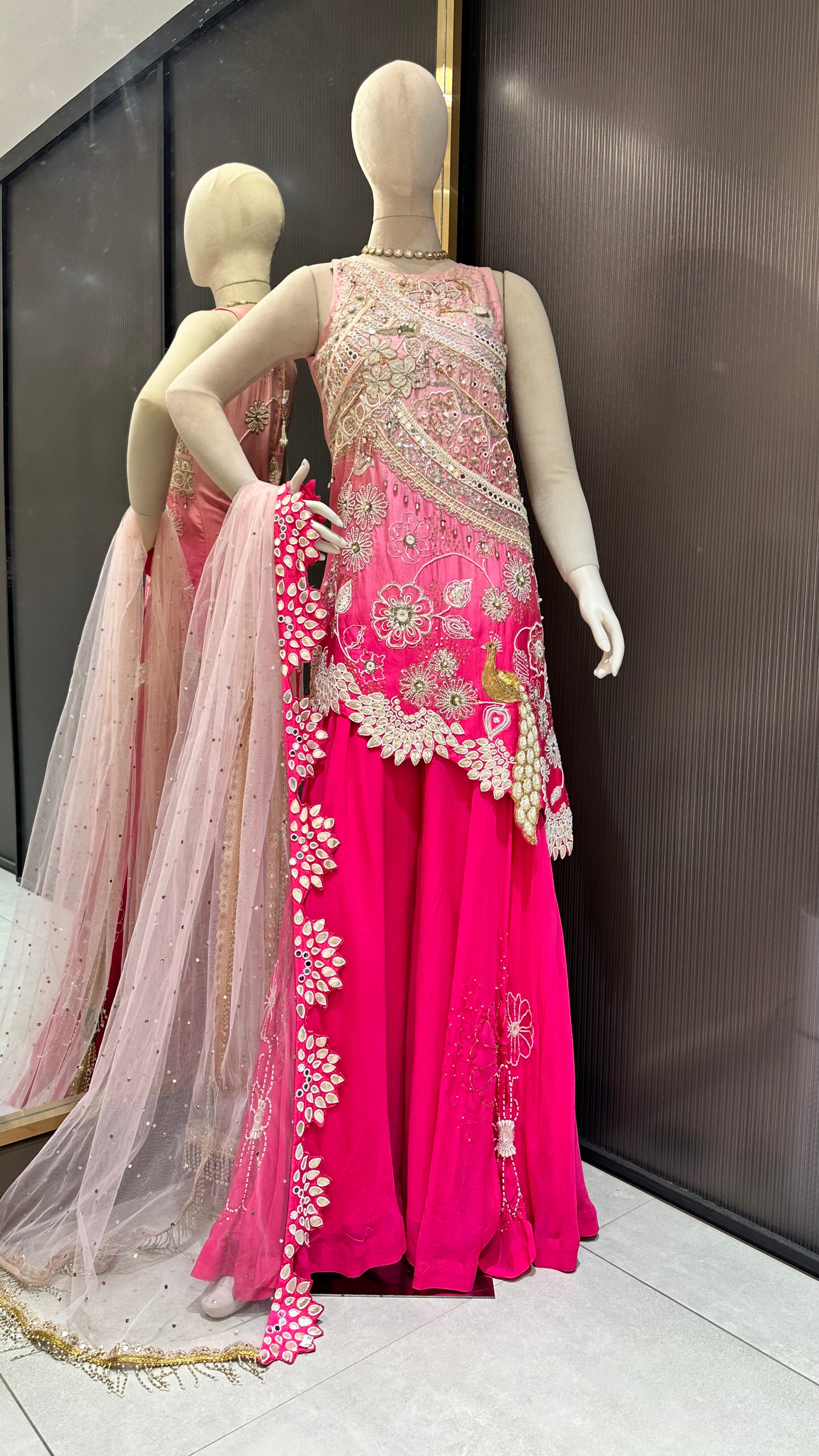 Raw silk shirt, organza sharara, net dupatta.