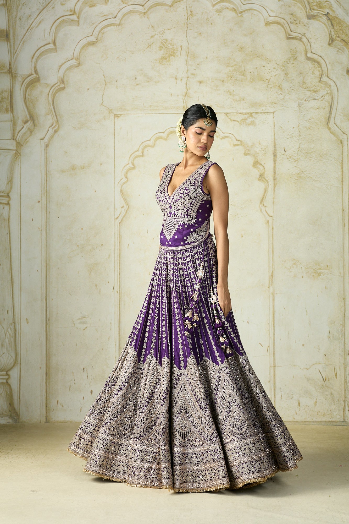 The Sleeveless V-Neck Blouse Features Heavy Handwork That Mirrors The Grandeur Of The Voluminous Flared Skirt, Which Is Embellished With Detailed Motifs And A Heavily Bordered Hemline. The Matching Dupatta In Sheer Fabric Is Finished With Ornate Embroidery And A Delicately Worked Border, Perfectly Complementing The Ensemble.
