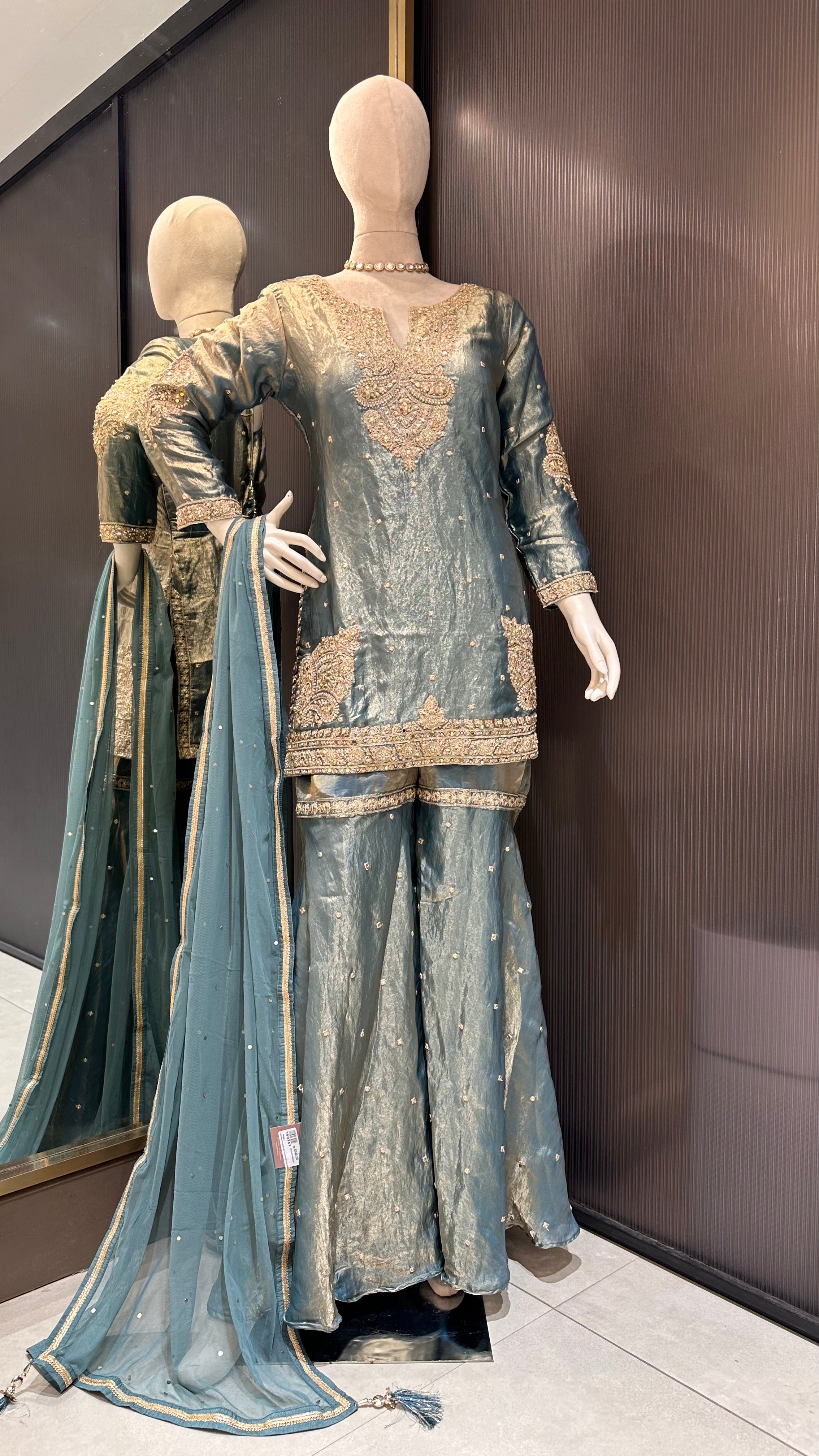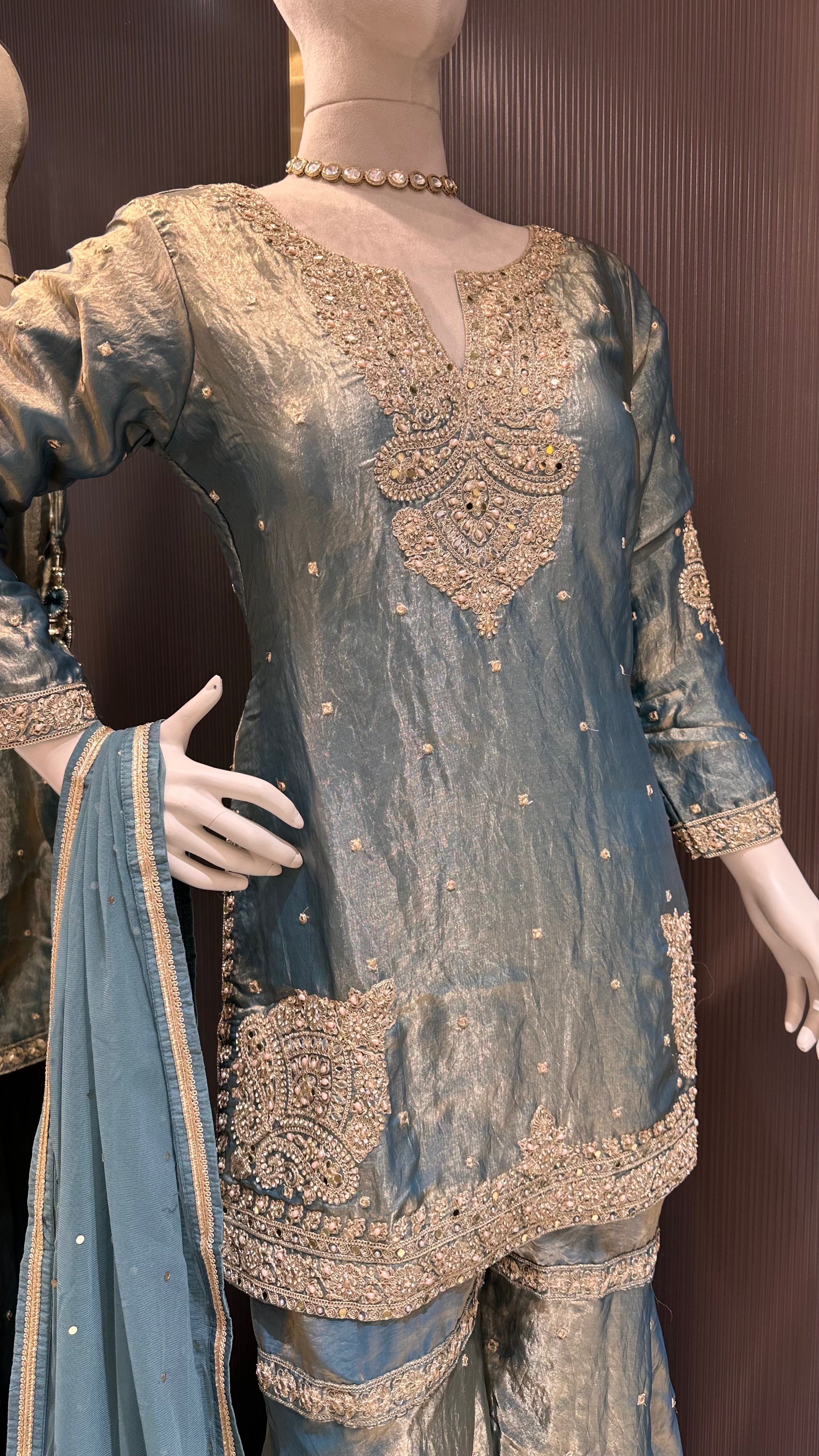 Draped In The Serene Elegance Of Sea Green, This Shimmer Silk Suit Set Radiates Refined Charm With Its Lustrous Finish And Golden Highlights. The Straight-Cut Kurta Is Gracefully Adorned With Intricate Golden Embroidery Along The Neckline, Hem, And Borders, Lending A Regal Touch To Its Modern Silhouette. Paired With Wide-Legged Palazzo Pants That Flow With Ease, The Ensemble Captures Both Comfort And Sophistication. The Sheer Dupatta, Delicately Finished With Ornate Golden Edging, Enhances Its Ethereal Appeal, Making This Outfit A Perfect Choice For Weddings, Festive Gatherings, And Grand Evening Celebrations.