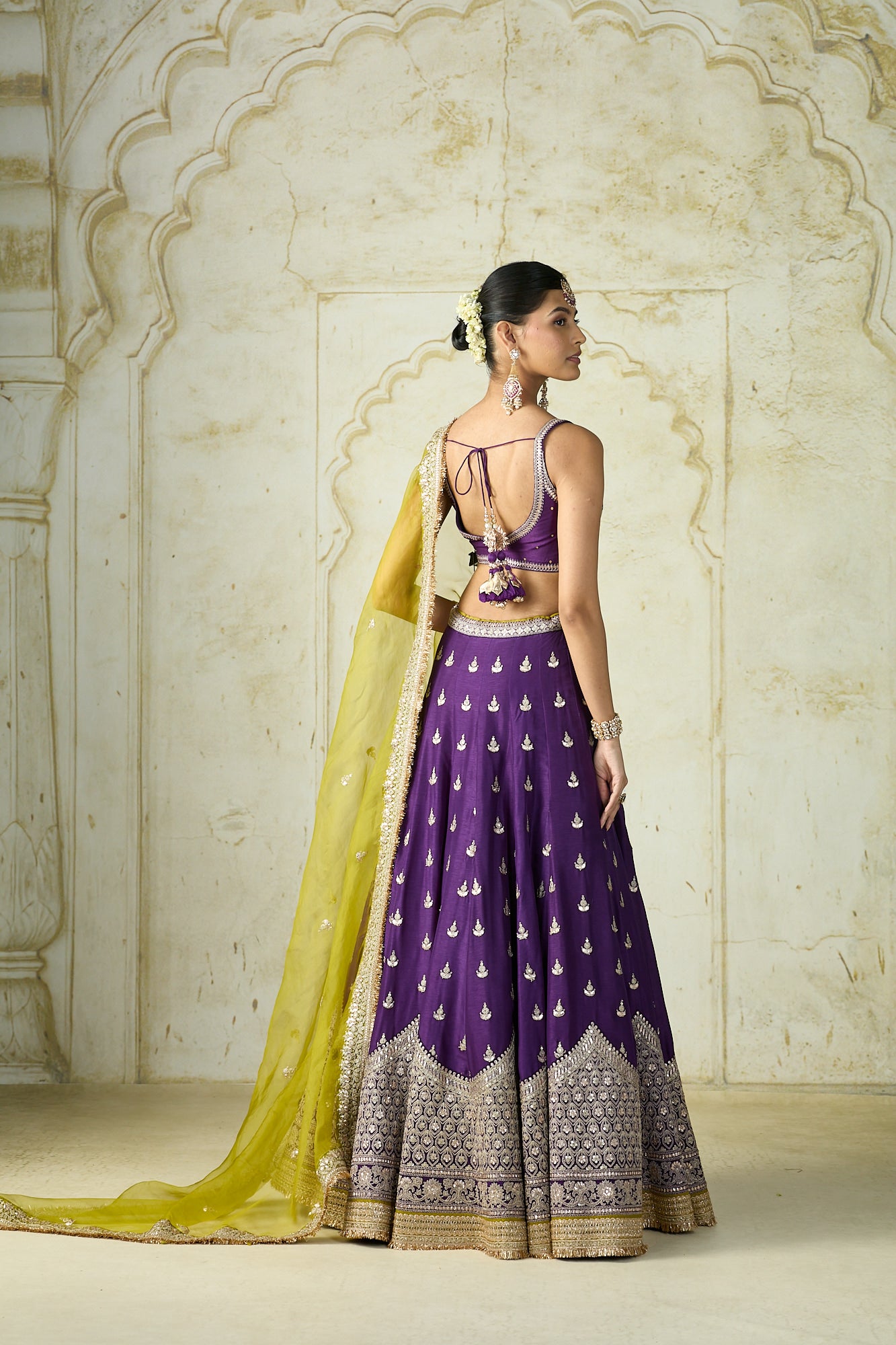 This Elegant Lehenga Set Radiates Regal Charm, Featuring A Beautifully Embroidered Blouse With Intricate Detailing Paired With A Deep Neckline For A Modern Touch. The Voluminous Lehenga Is Adorned With Delicate Motifs Scattered Across And A Richly Embellished Border That Enhances Its Grandeur. A Contrasting Sheer Dupatta With Ornate Embroidery And A Finely Detailed Border Completes The Look.