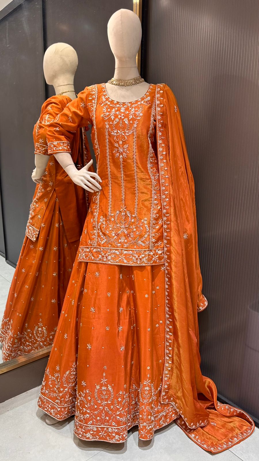 Step Into The Spotlight With This Exquisite Lehenga Set, Meticulously Crafted In Luxurious Shimmer Silk Featuring Intricate Self-Weaving Patterns. The Subtle Sheen Of The Fabric Beautifully Catches The Light, Adding A Touch Of Glamour Without Being Overpowering. Its Rich Texture And Graceful Fall Make It A Perfect Choice For Weddings, Festive Celebrations, And Grand Evening Events. The Lehenga Is Paired With A Soft And Flowy Chinon Dupatta, Offering A Delicate Contrast That Adds Elegance And Charm To The Ensemble. Whether Draped Traditionally Or Styled Over The Shoulders, The Dupatta Enhances The Overall Look With Effortless Grace.