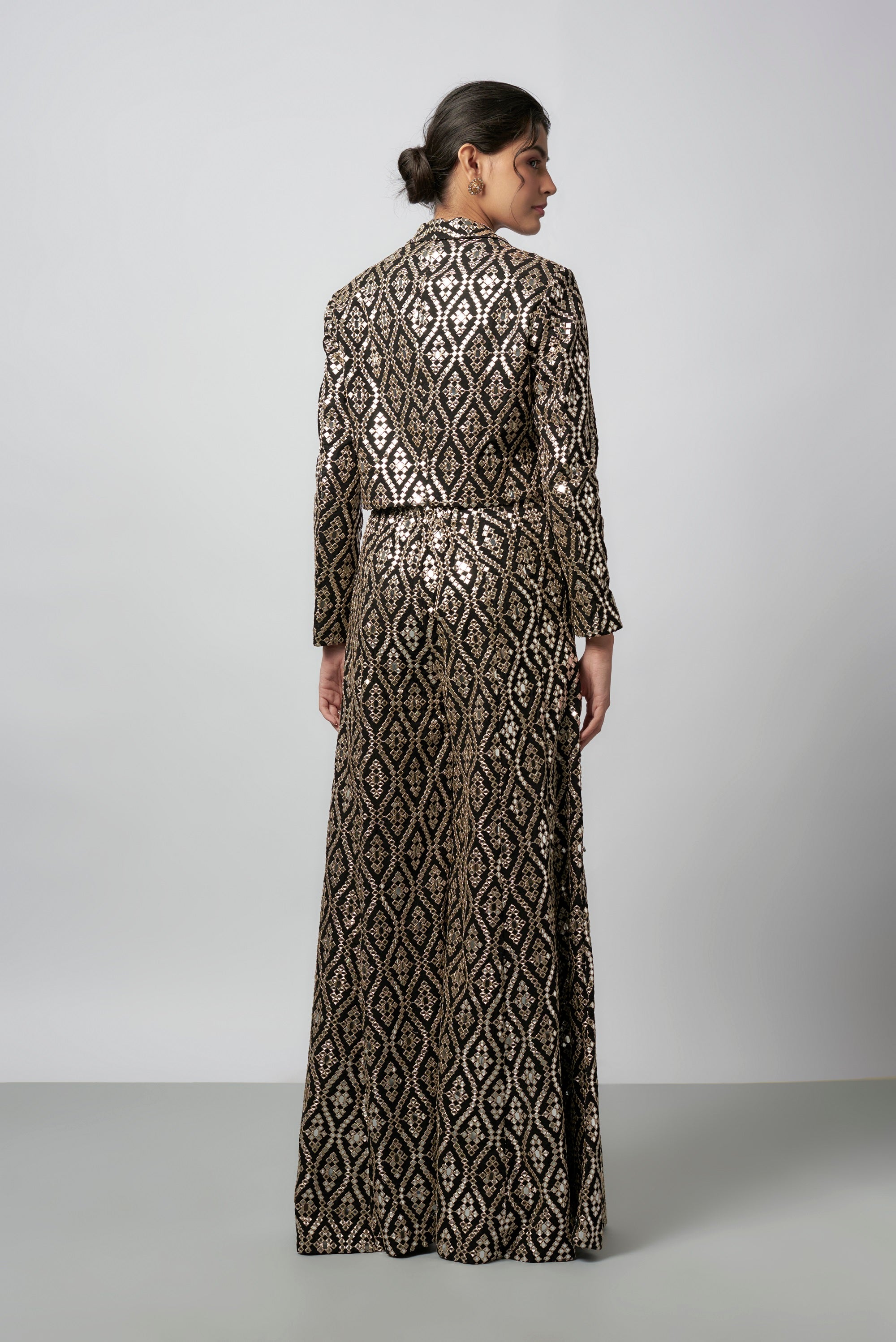 The Tailored Silhouette In Katri Mirror Features Geometric Patterns, Making It Ideal For Cocktail Parties, Formal Gatherings, Or Red-Carpet Events. The Flared Pant Style Adds A Touch Of Drama And Movement, While The Fitted Bodice Ensures A Flattering, Streamlined Look.