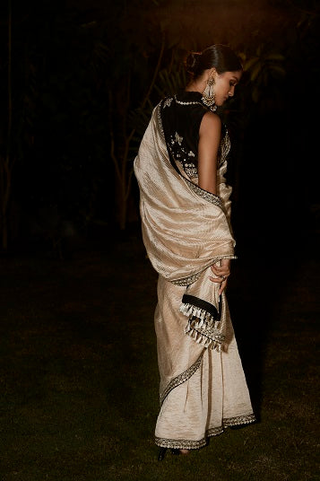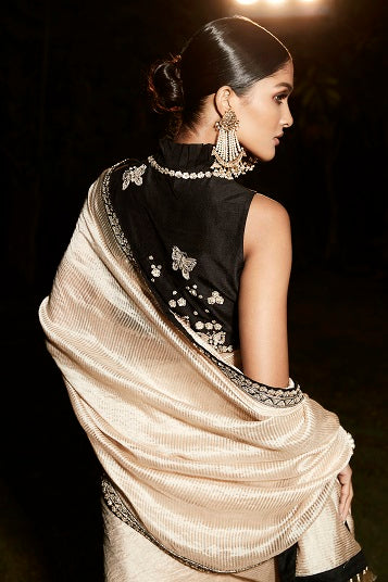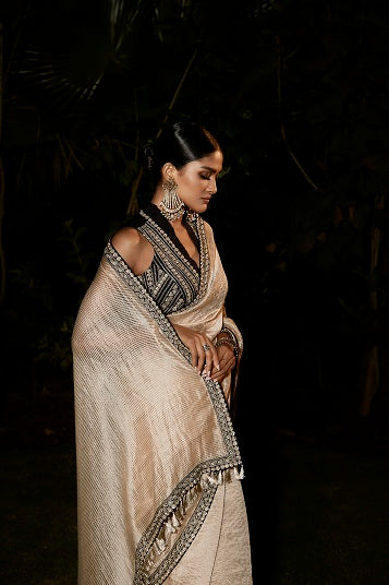 | The NEW Look An evolution of Matsya. Tarnished Silver Embroidery in Vintage Zardozi. Aztec & Flora inspired artworks. The Old & The New, in just an all new Matsya look. The blouse is created with a greako-roman influence & victorian elements to create a subtle grandeur & give birth to an Icon. The Saree is in striped soft tissue with a minimal zardozi border. |