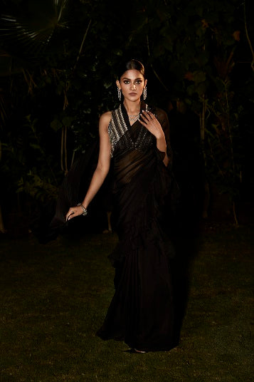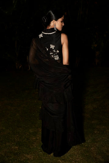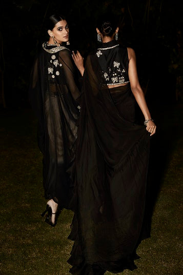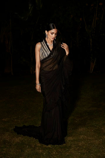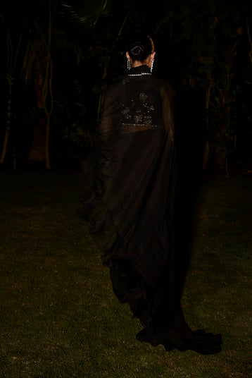 | The NEW Look An evolution of Matsya. Tarnished Silver Embroidery in Vintage Zardozi. Aztec & Flora inspired artworks. The Old & The New, in just an all new Matsya look. The blouse is created with a greako-roman influence & victorian elements to create a subtle grandeur & give birth to an Icon. The Saree is in organza georgette in Noir, light weight & easy to drape. Simple & Powerful. |