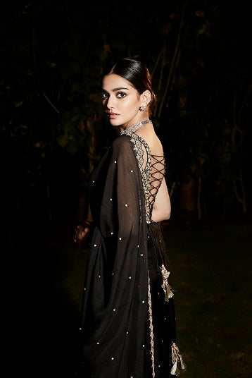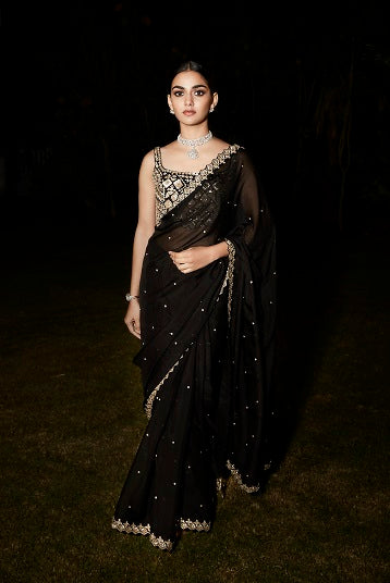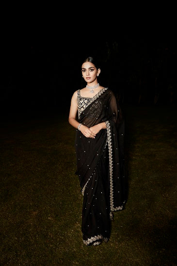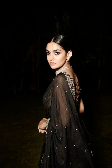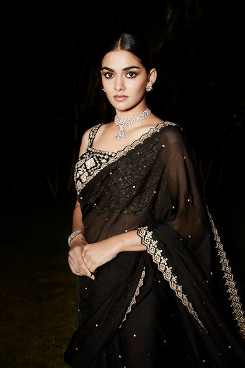 | The NEW Look An evolution of Matsya. Tarnished Silver Embroidery in Vintage Zardozi. Aztec & Flora inspired artworks. The Old & The New, in just an all new Matsya look. Blouse in silk & saree in a plant based organza georgette. The aztec influence almost speaks to an inspiration of technology & evolved urban embroideries. The saree has a starry sky effect on a noir base. |