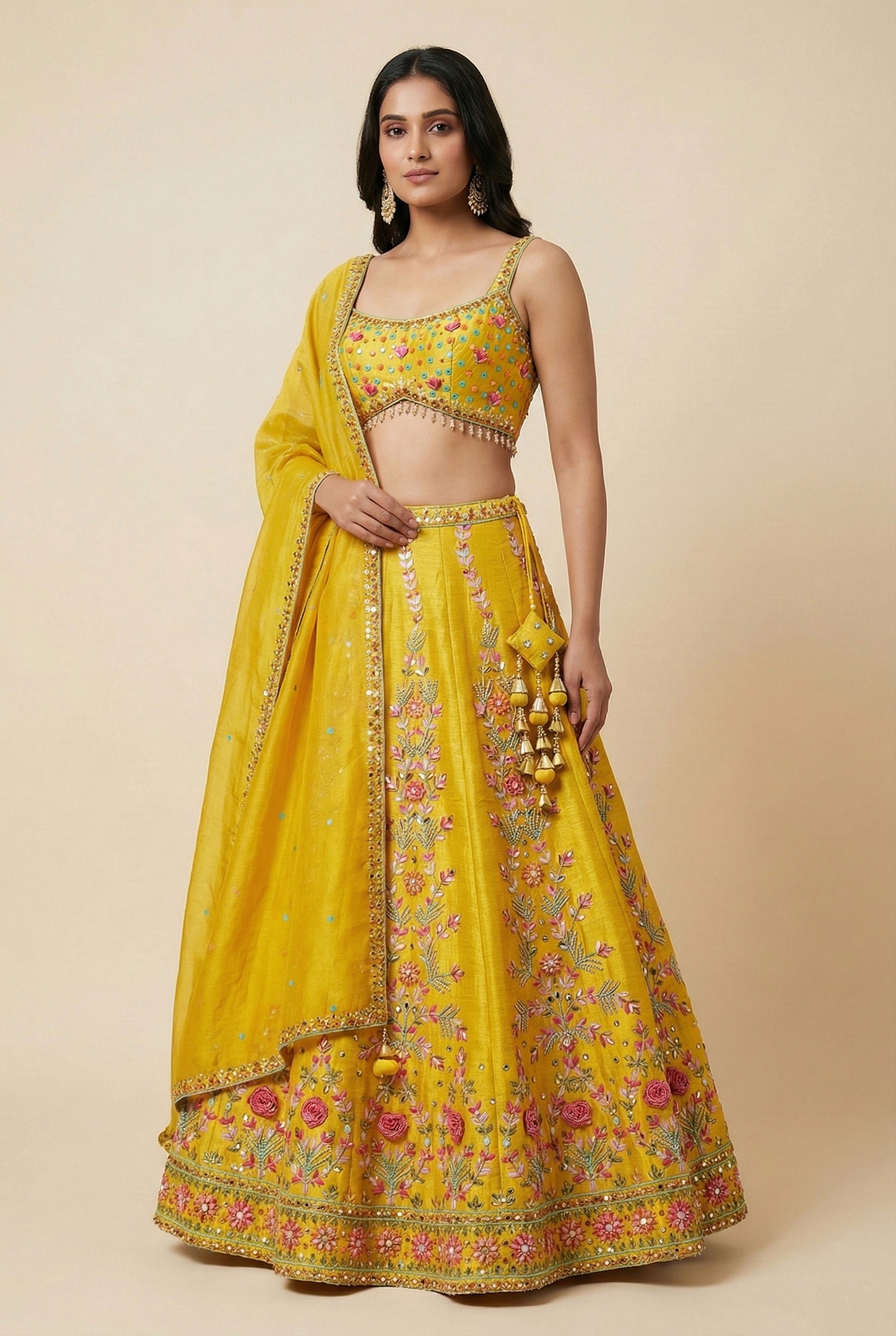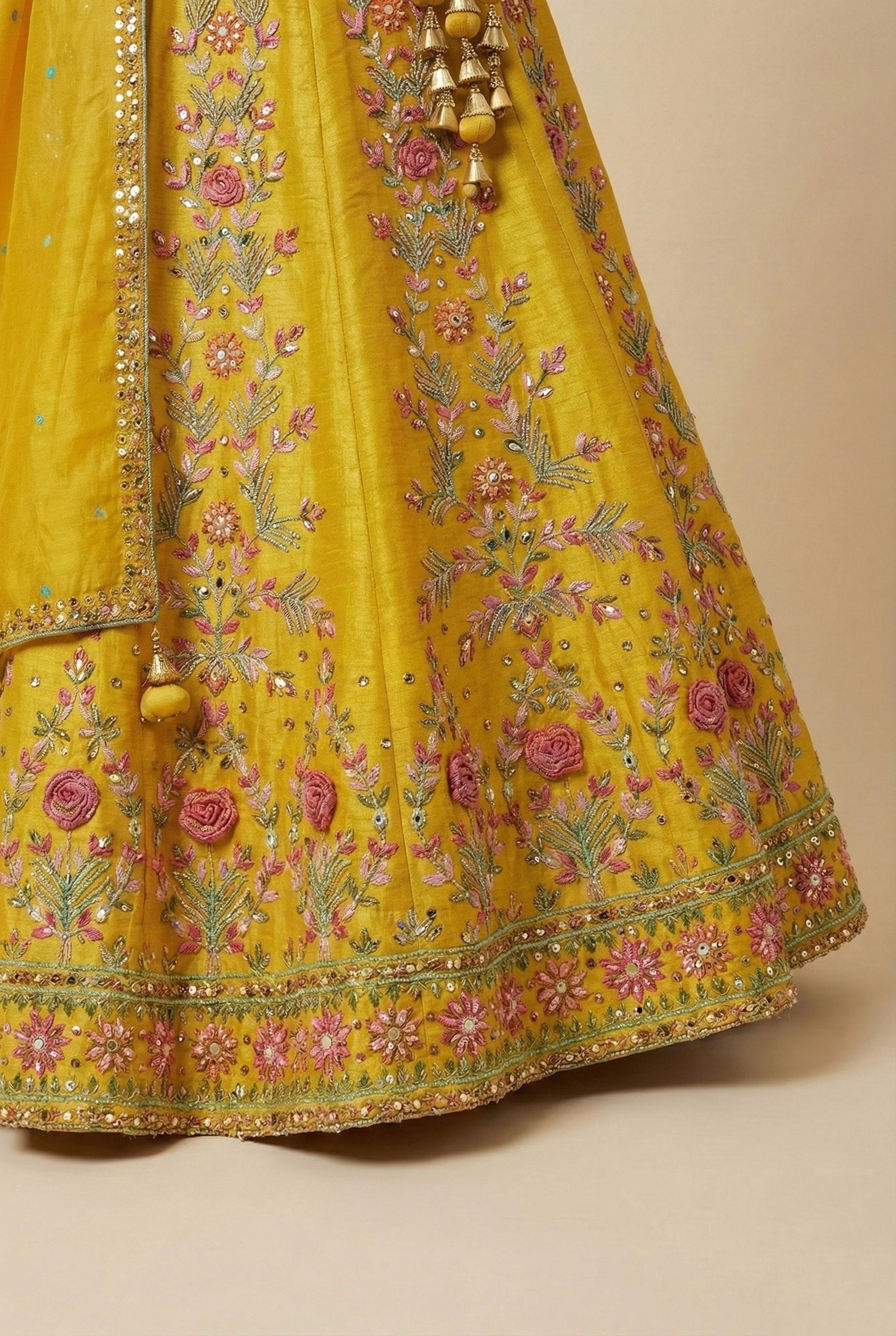Radiate Grace And Charm In This Stunning Yellow Lehenga Set, Crafted From Luxurious Embroidered Raw Silk Fabric. The Ensemble Features A Flared Lehenga Adorned With Intricate Thread And Zari Embroidery, Adding A Touch Of Regal Elegance To Its Vibrant Hue. Paired With A Matching Choli (Blouse), Designed With Delicate Detailing And A Flattering Neckline, The Outfit Balances Tradition With Modern Sophistication. The Set Is Completed With A Coordinated Dupatta, Lightweight Yet Rich, Featuring Embroidered Borders That Enhance The Overall Appeal. Perfect For Festive Occasions, Weddings, Or Special Celebrations, This Lehenga Set Is A True Statement Piece That Blends Craftsmanship And Beauty Effortlessly.