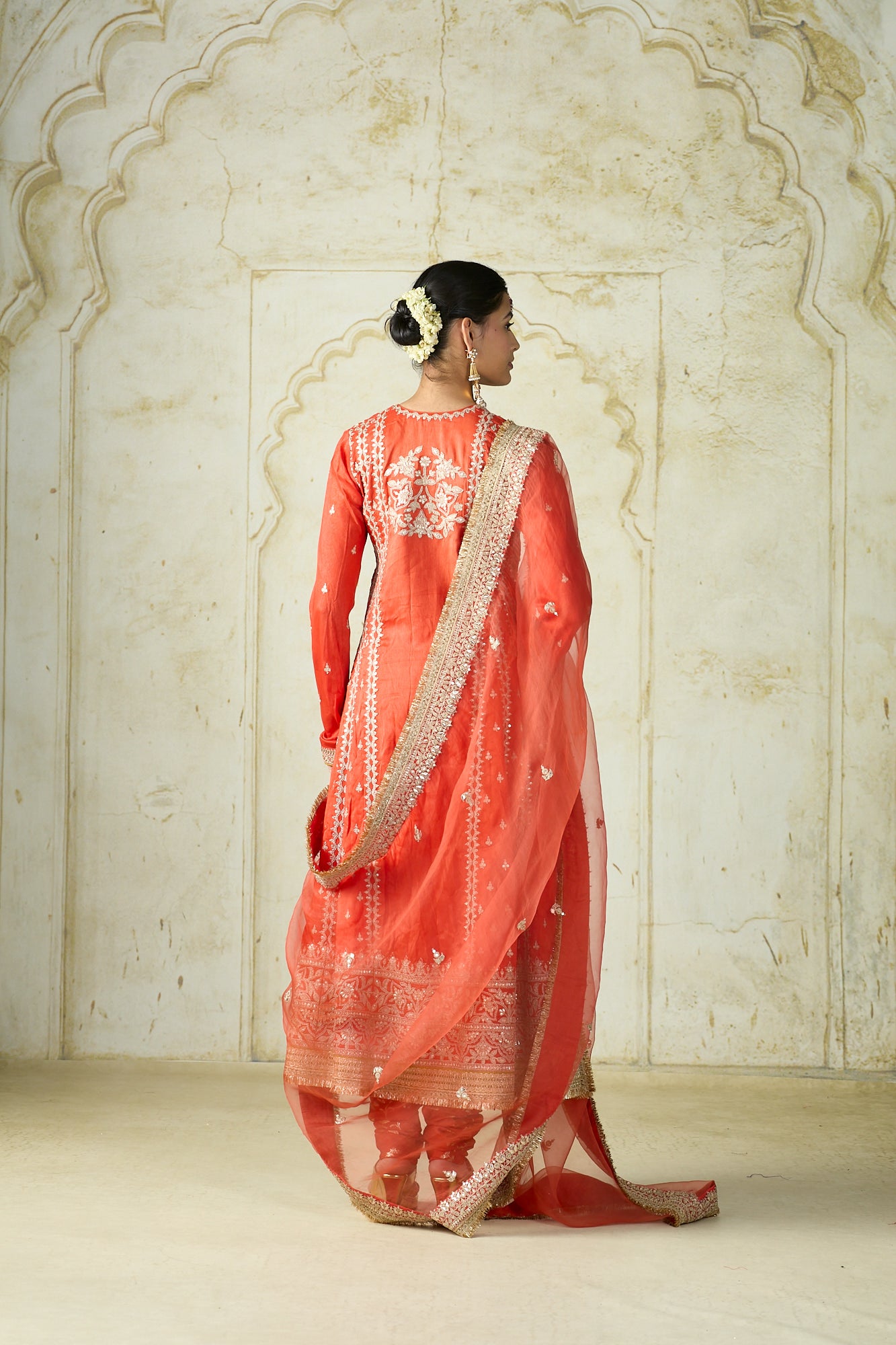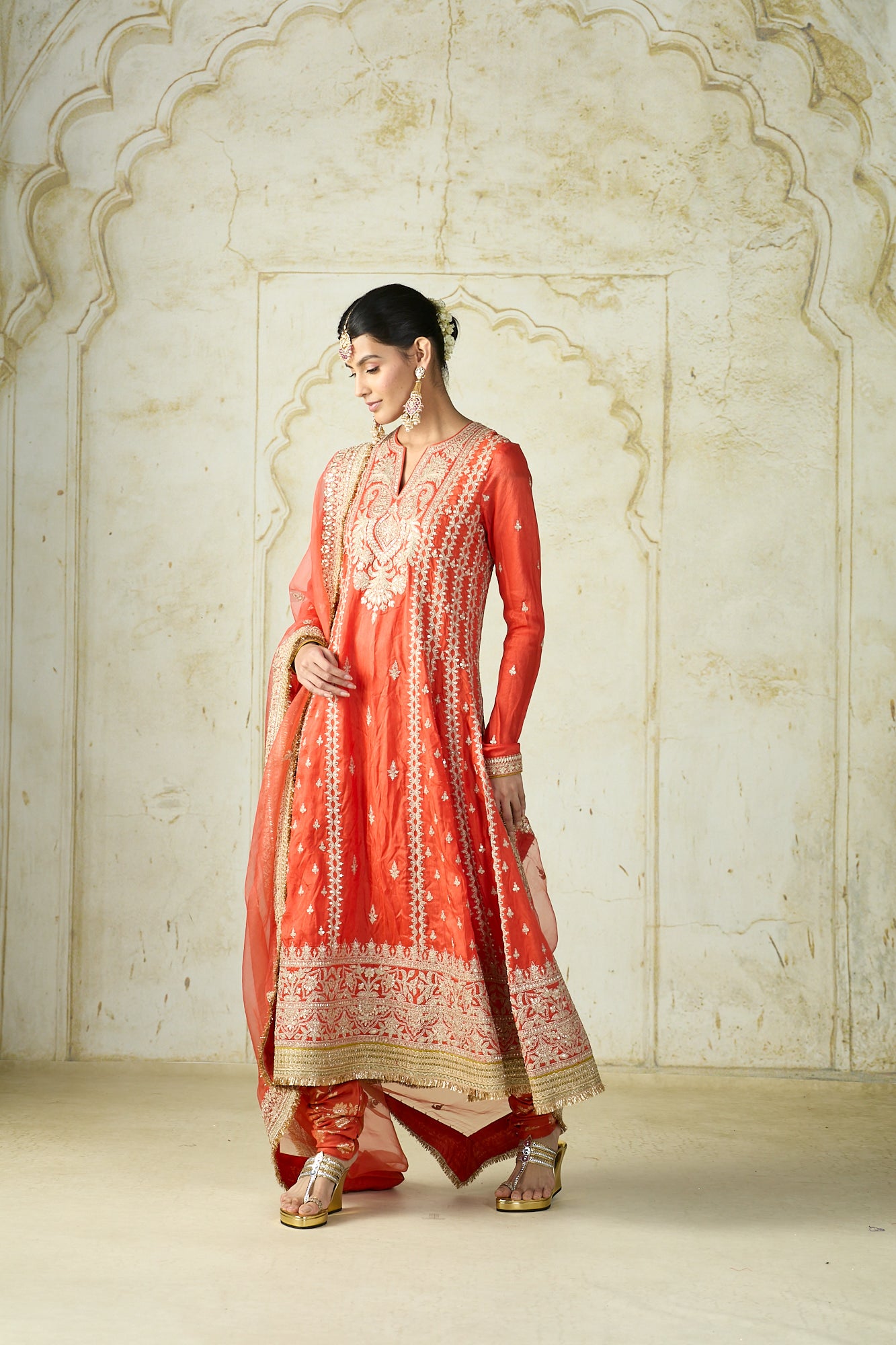 Featuring A Beautifully Embroidered Long Kurta Adorned With Intricate, Delicate Motifs Along The Neckline, Sleeves, And Borders. The Hemline Is Richly Embellished With Ornate Detailing, Adding Depth And Elegance To The Outfit. It Is Paired With Matching Churidar Pants And A Sheer Dupatta Edged With Heavy Embroidery.