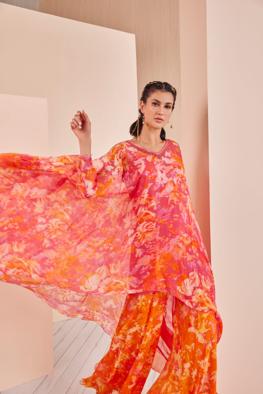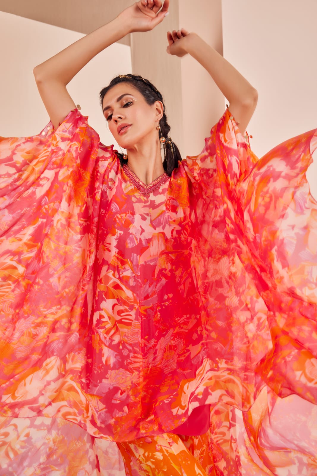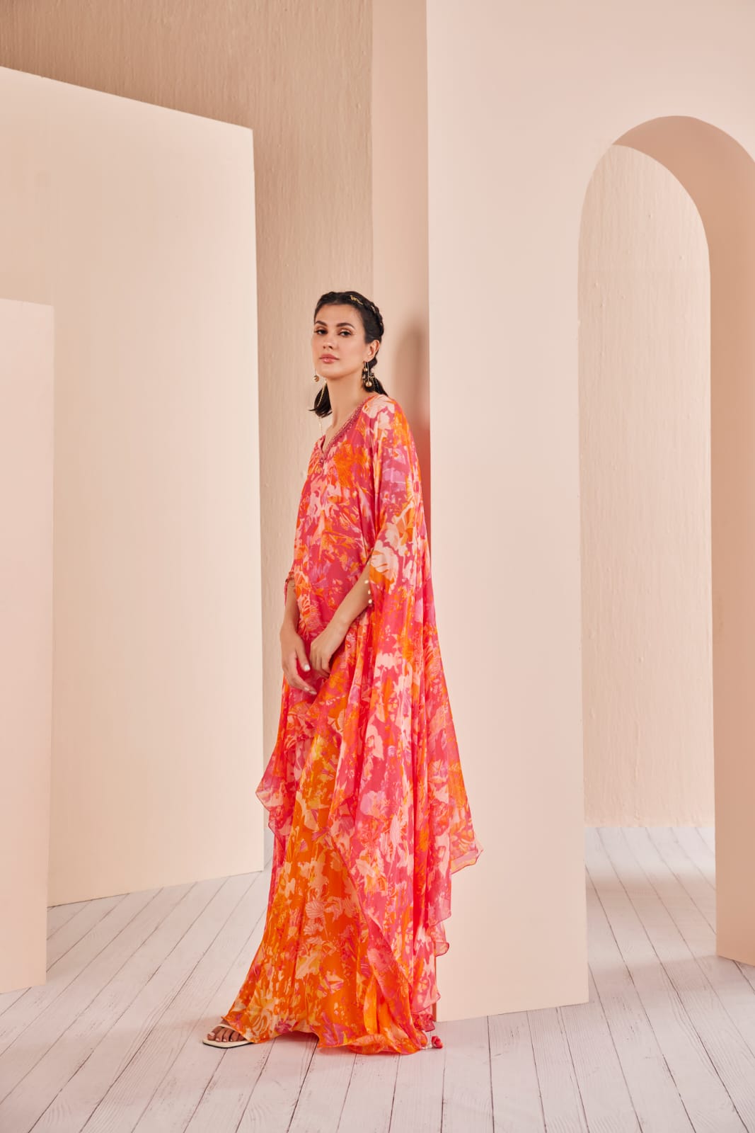 Printed chiffon asymmetrical pleated kaftan with front belt embroidery detailed