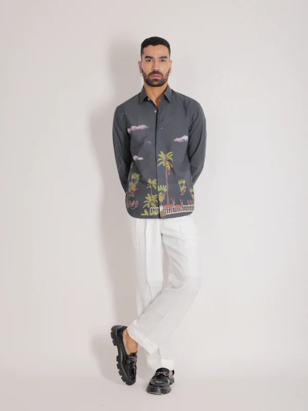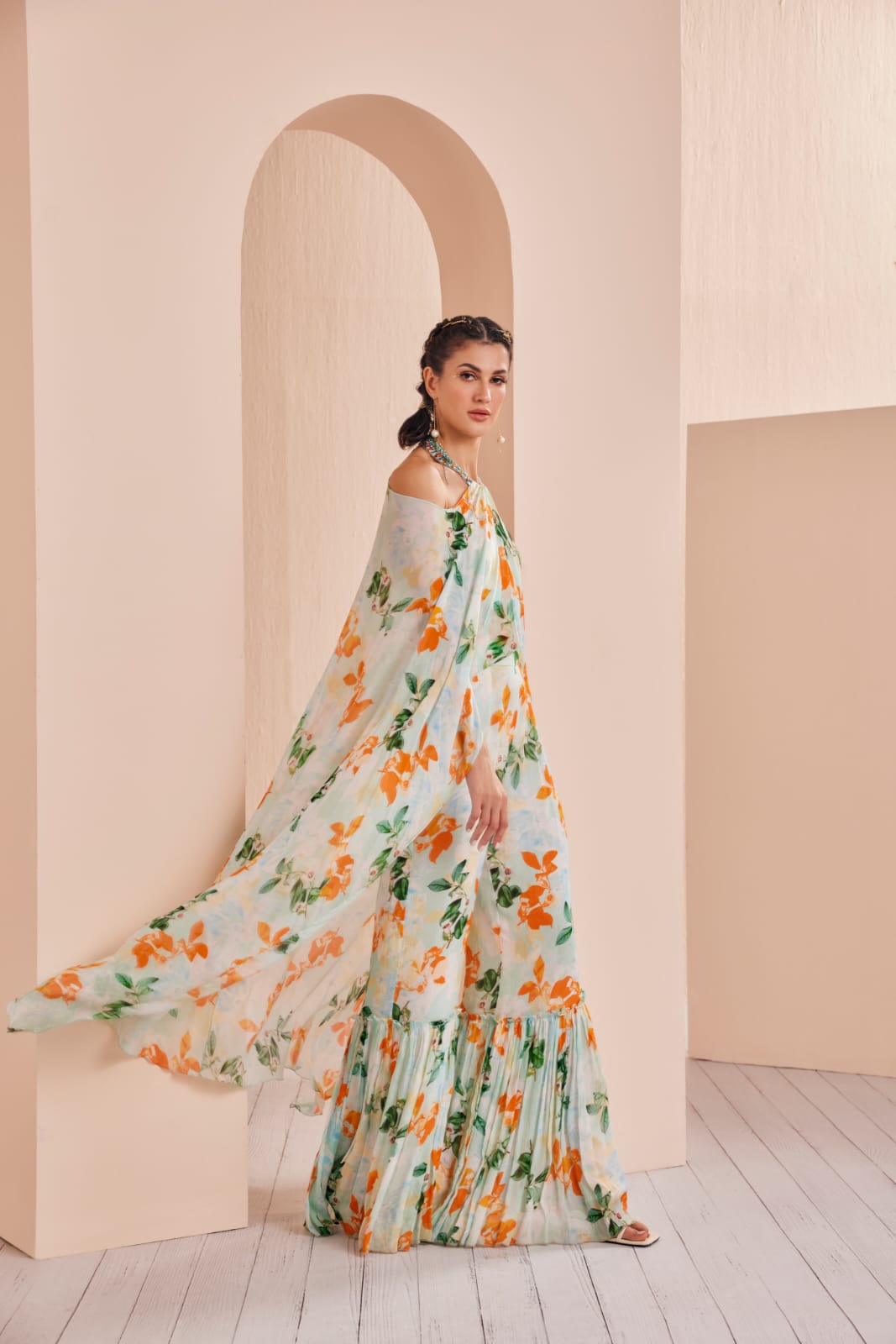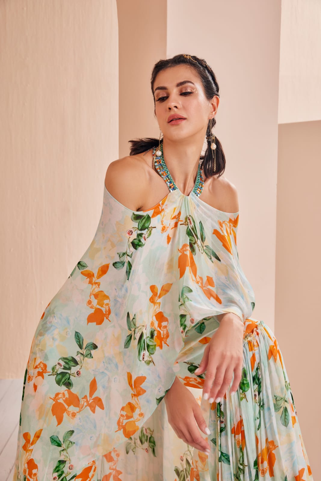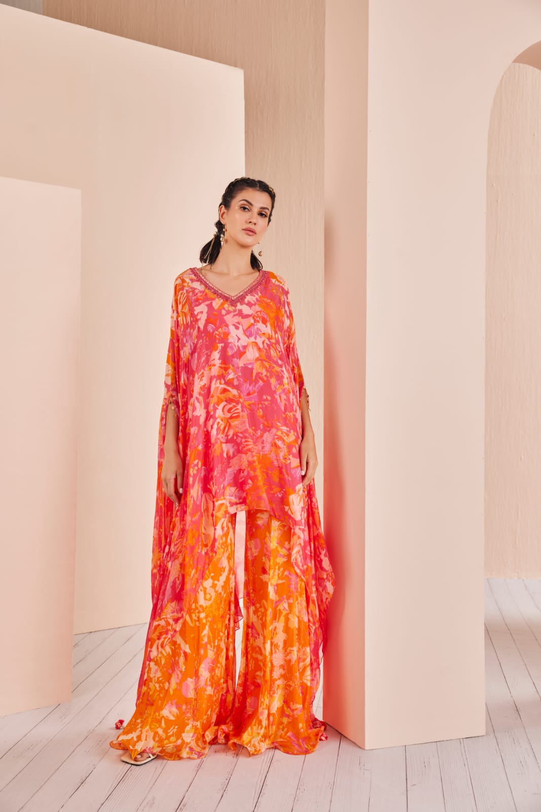 Printed chiffon asymmetrical pleated kaftan with front belt embroidery detailed