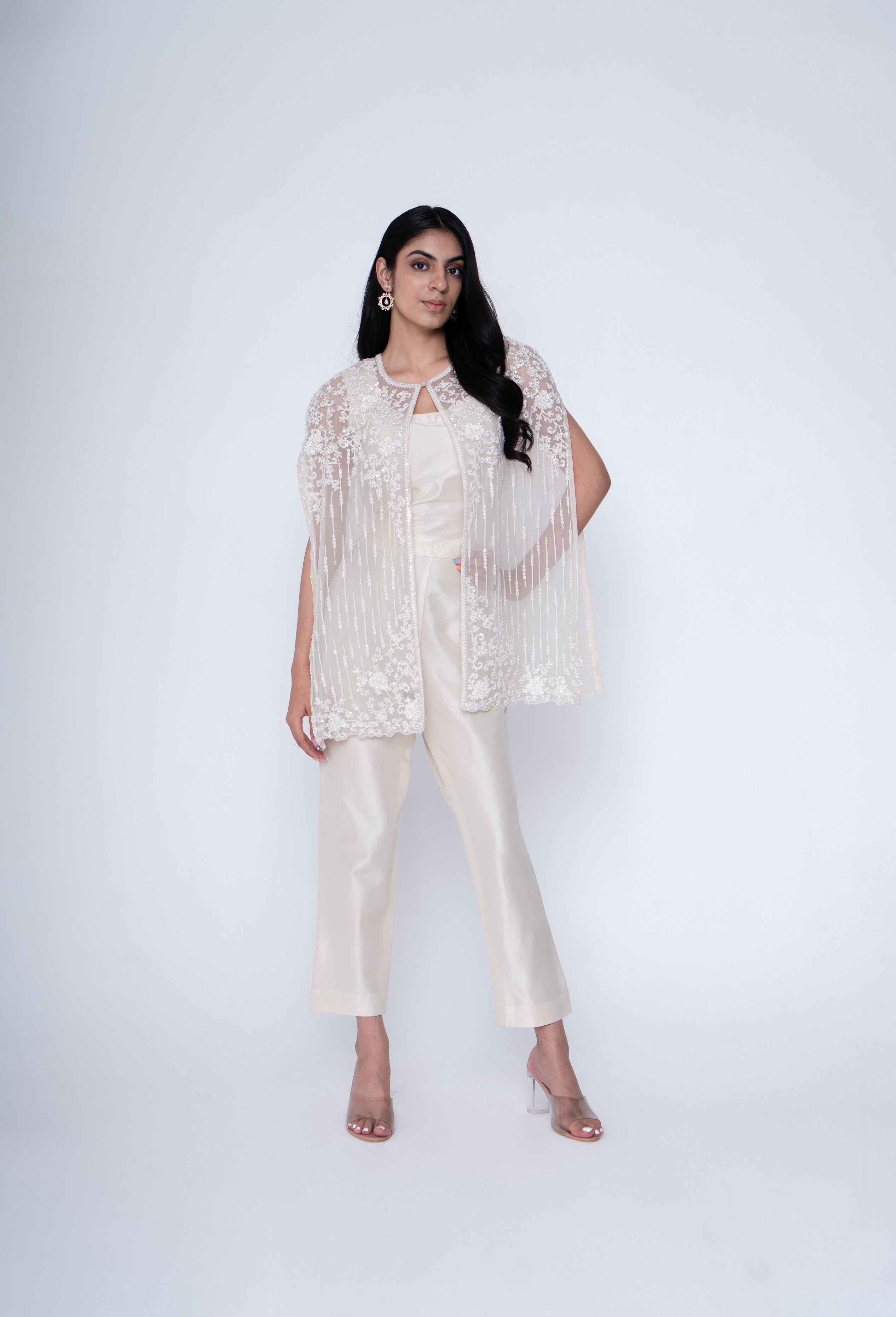 | crop top and pant, the outfit is paired with beautiful cape adorned with intricate embroidery on its front & back , |