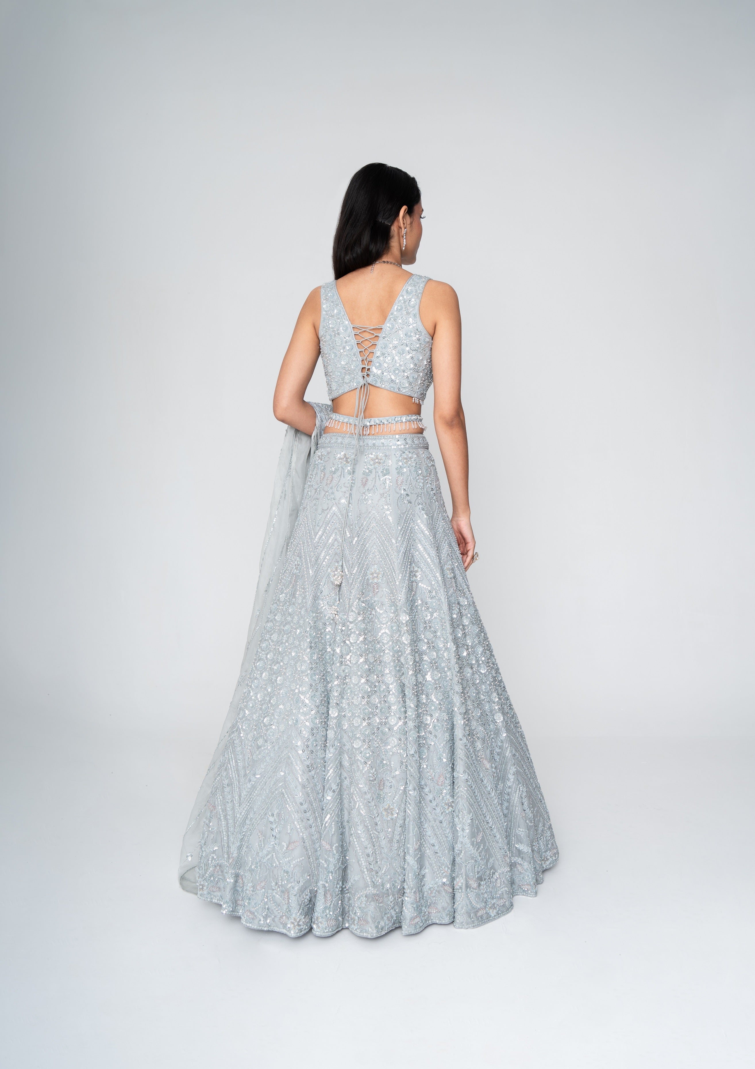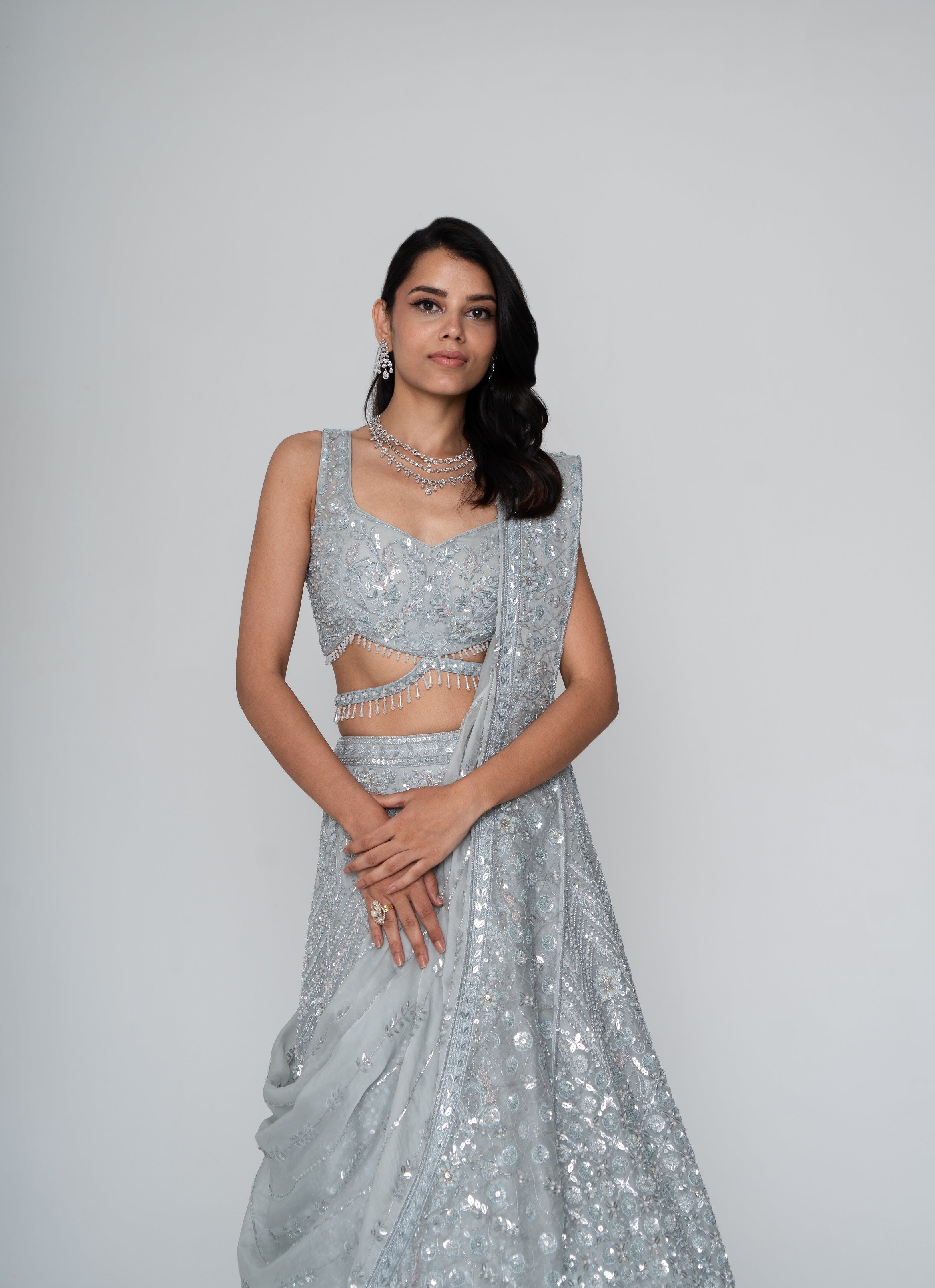 | The lehenga set features very intricate embroidery with cristal latkan, it is paired with embroidered dupatta drap, The bottom of the blouse too shows delicate crystal tassles with cut out work. |