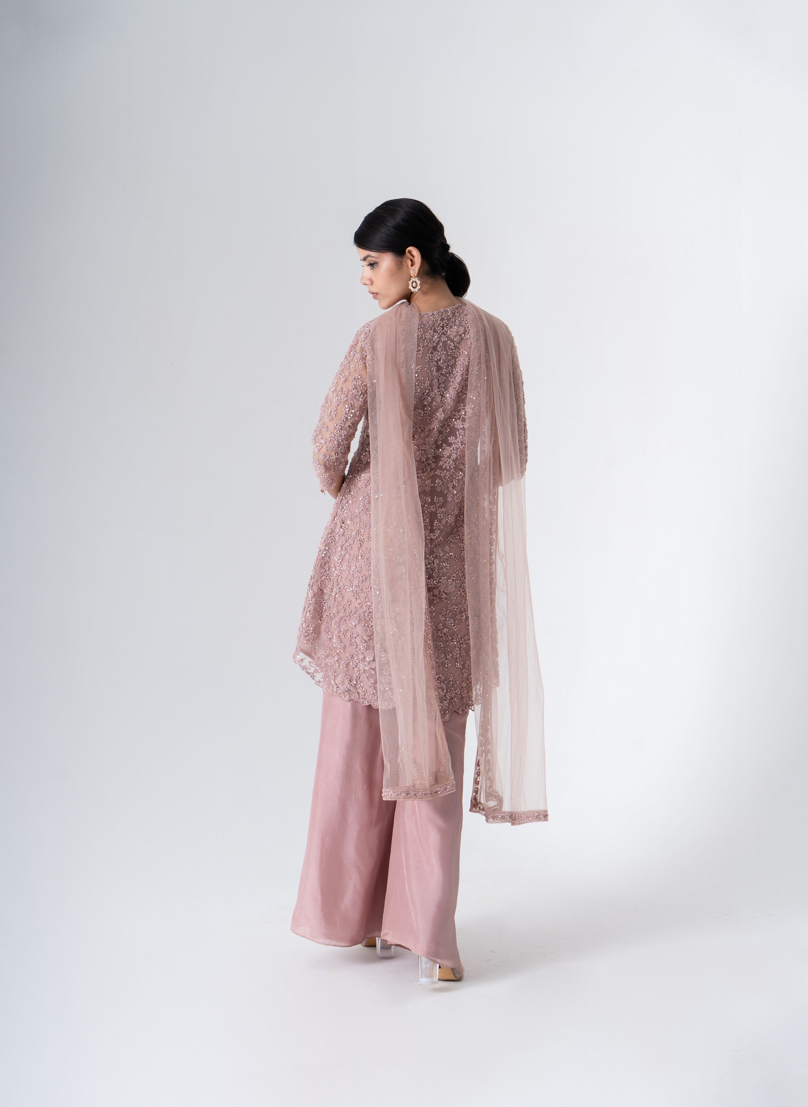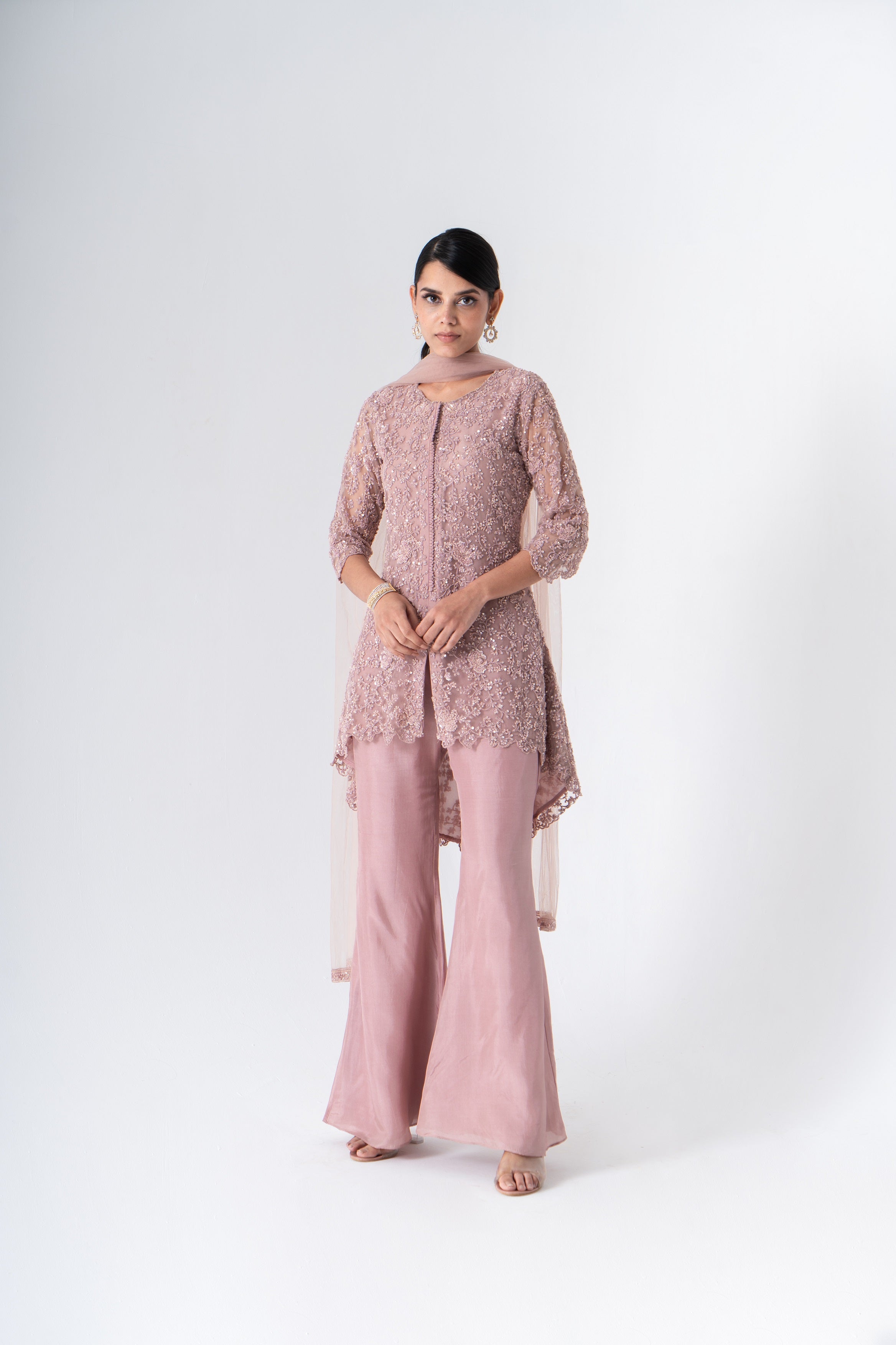 | High low embroidered net kurti,cut work on the edge of the kurti and beadwork embellishment paired with bell bottoms |