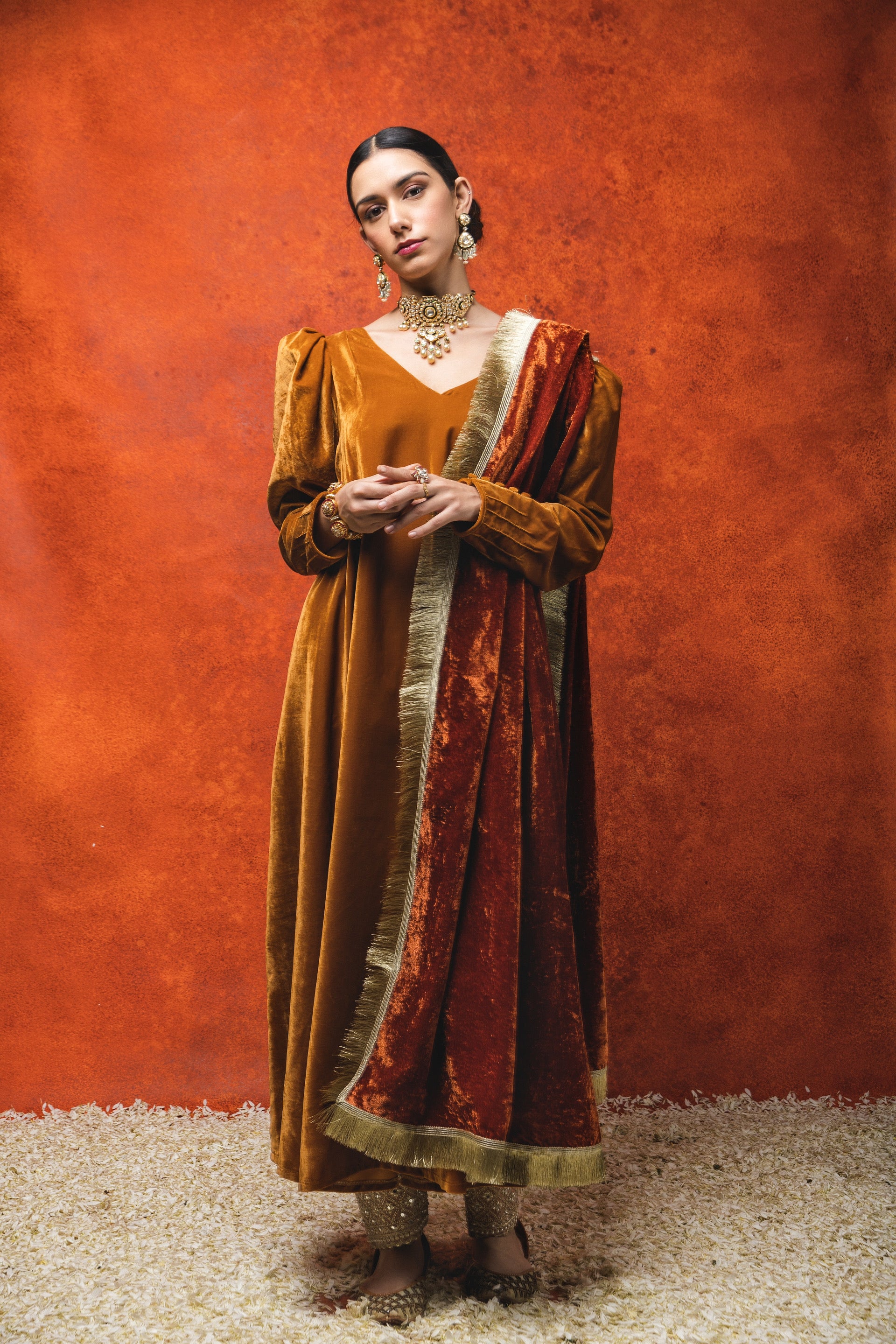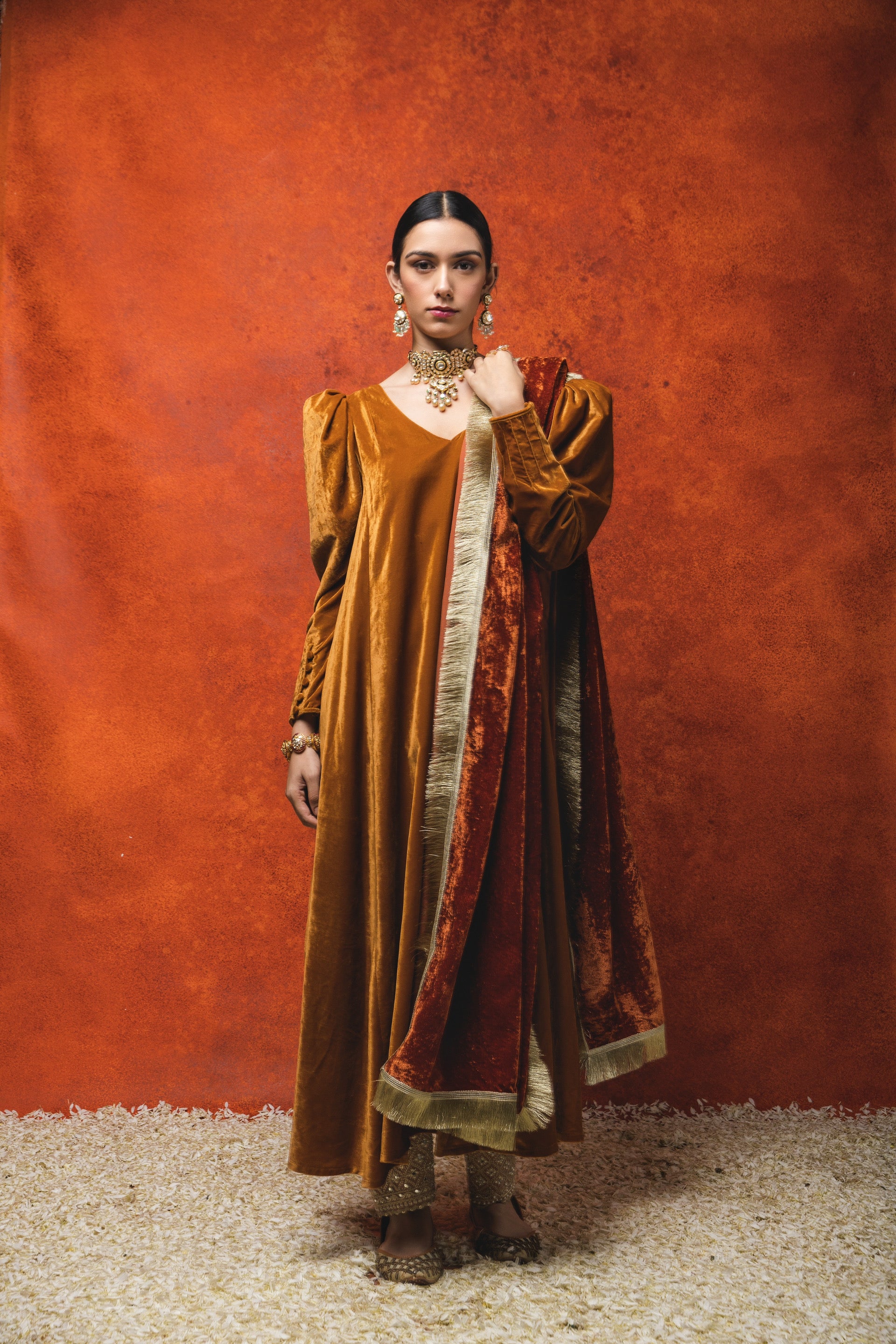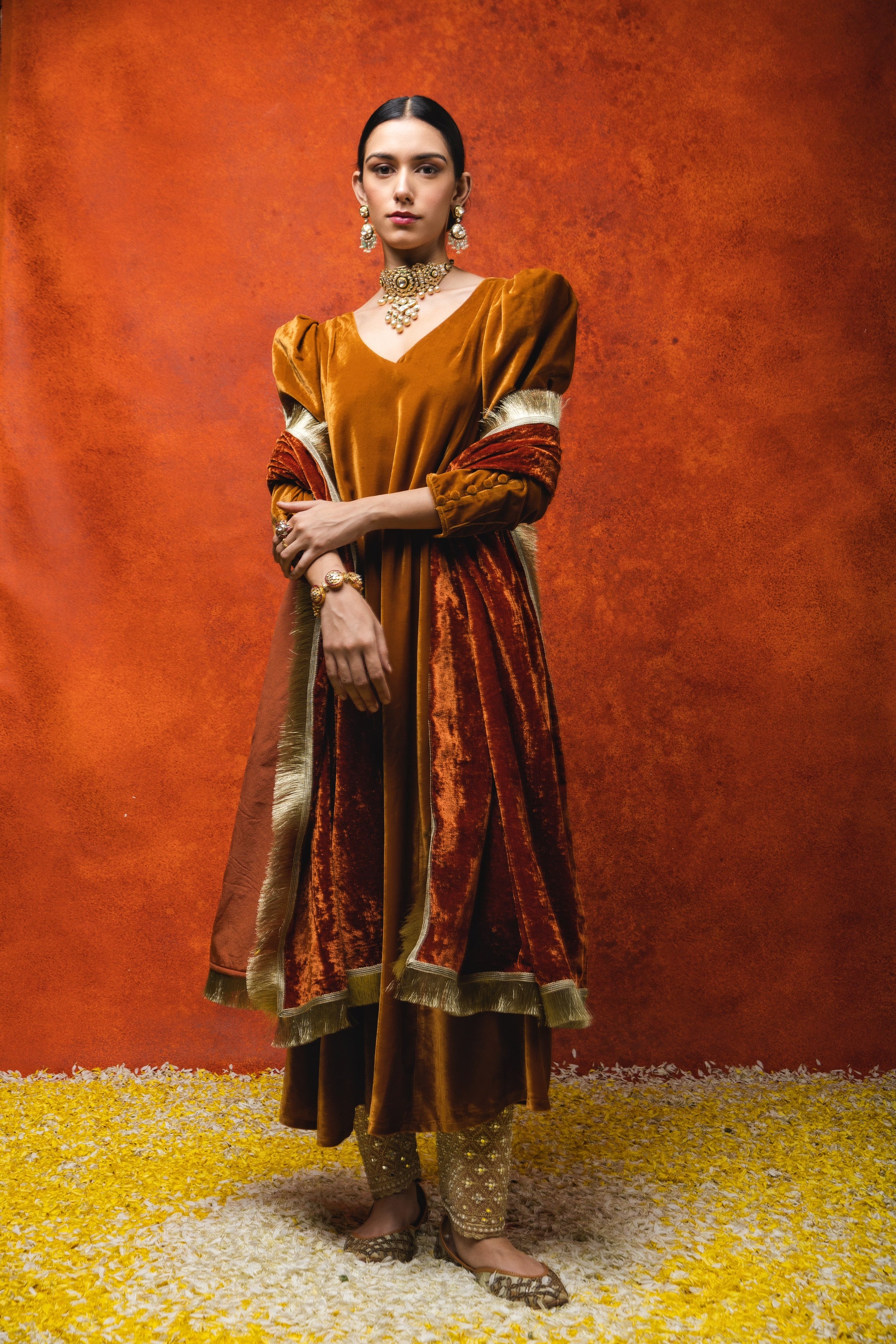 | FEATURING WITH VELVET POWER SHOULDER KALIDAAR PAIRED WITH VELVET SHALWAR AND DUPATTA EMBELLISHED WITH FRINGE KASAB BORDER AND DORI PEARL AND MIRROR WORK |