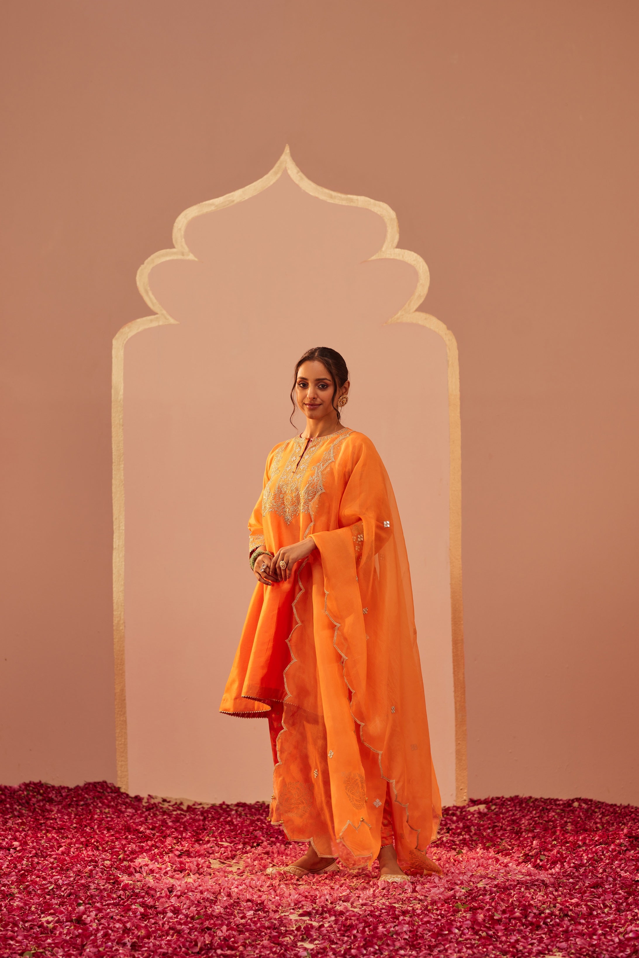 This ensemble is made in pure silk chanderi and a bamberg satin salwar teamed up with a silk organza dupatta. The kurta has a zero neck with a placket and three-quarter sleeves. The outfit is adorned with a signature block print which is highlighted with tilla and patra embroidery. It is finished with pure benarsi fabric and gota detailing.