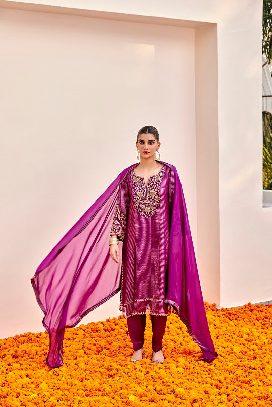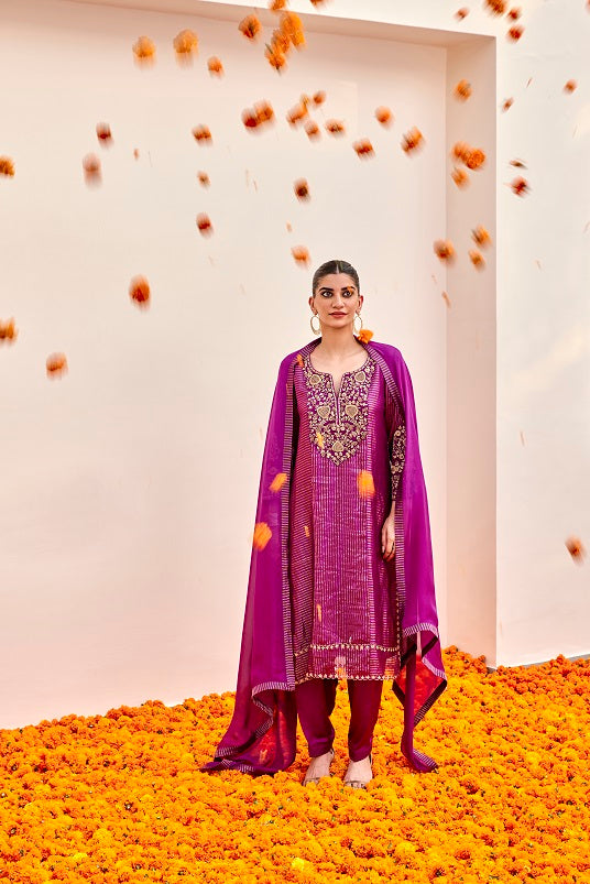 Featuring the Purple colour Pakistani salwar set the Pure chanderi banarsi printed fabric which is comes with Long shirt,salwar and dupatta.