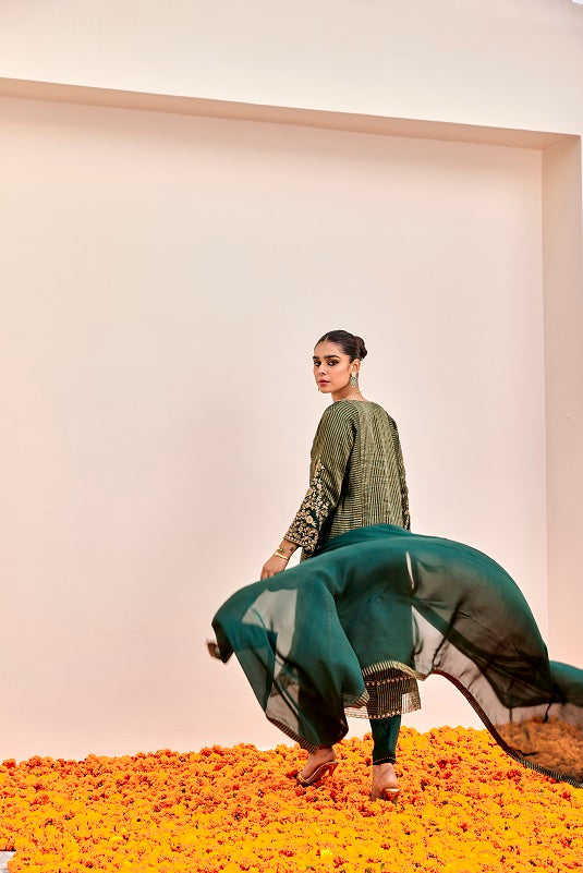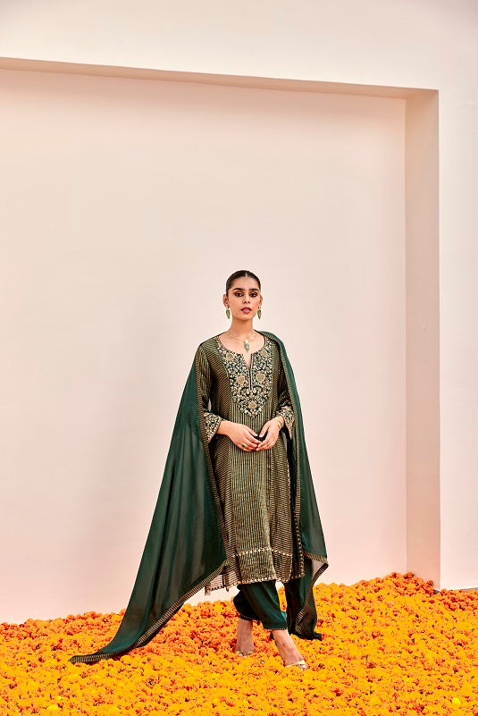 Featuring the Bottle Green colour Pakistani silk modal salwar set the Pure chanderi banarsi printed fabric which is comes with Long shirt,salwar and dupatta.